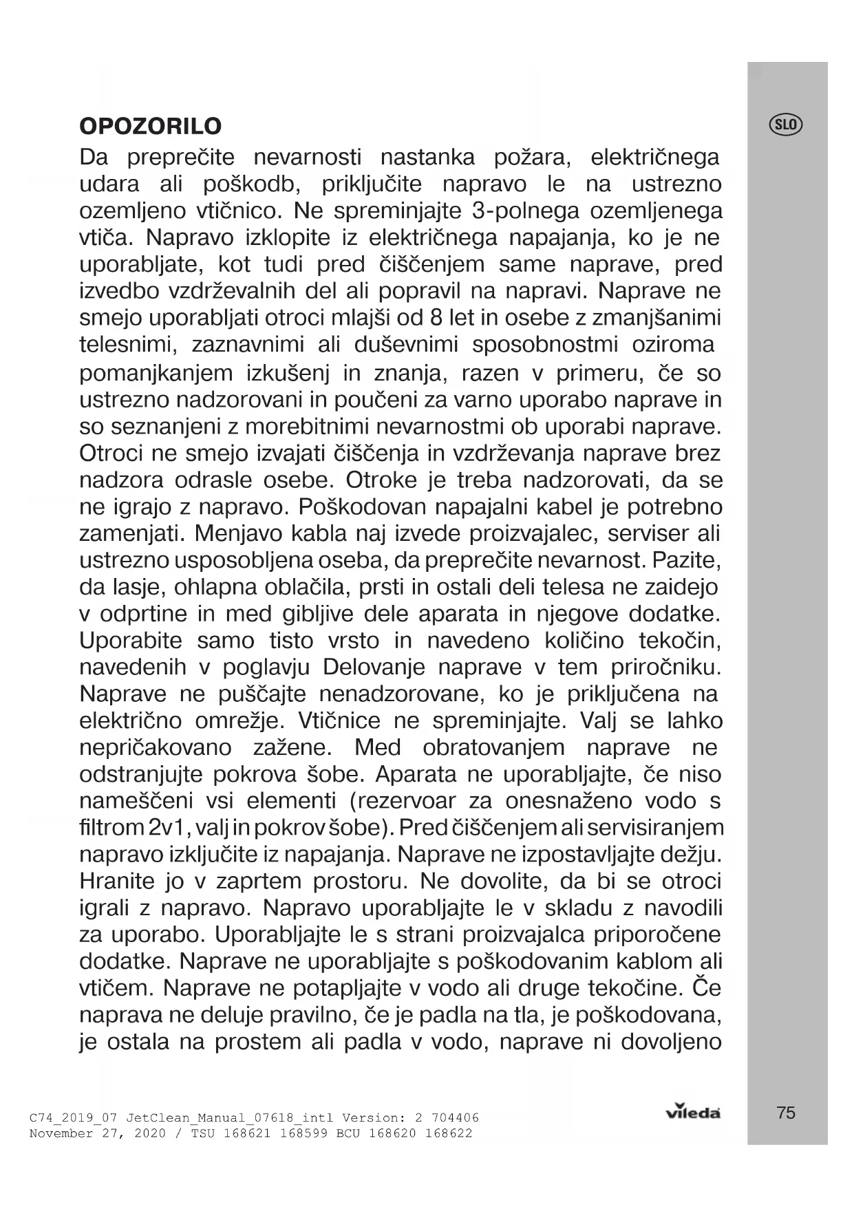 OPOZORILO Da preprečite nevarnosti nastanka požara, električnega udara ali poškodb, priključite napravo le na ustrezno ozemljeno vtičnico. Ne spreminjajte 3-polnega ozemljenega vtiča. Napravo izklopite iz električnega napajanja, ko je ne uporabljate, kot tudi pred čiščenjem same naprave, pred izvedbo vzdrževalnih del ali popravil na napravi. Naprave ne smejo uporabljati otroci mlajši od 8 let in osebe z zmanjšanimi telesnimi, zaznavnimi ali duševnimi sposobnostmi oziroma pomanjkanjem izkušenj in znanja, razen v primeru, če so ustrezno nadzorovani in poučeni za varno uporabo naprave in so seznanjeni z morebitnimi nevarnostmi ob uporabi naprave. Otroci ne smejo izvajati čiščenja in vzdrževanja naprave brez nadzora odrasle osebe. Otroke je treba nadzorovati, da se ne igrajo z napravo. Poškodovan napajalni kabel je potrebno zamenjati. Menjavo kabla naj izvede proizvajalec, serviser ali ustrezno usposobljena oseba, da preprečite nevarnost. Pazite, da lasje, ohlapna oblačila, prsti in ostali deli telesa ne zaidejo v odprtine in med gibljive dele aparata in njegove dodatke. Uporabite samo tisto vrsto in navedeno količino tekočin, navedenih v poglavju Delovanje naprave v tem priročniku. Naprave ne puščajte nenadzorovane, ko je priključena na električno omrežje. Vtičnice ne spreminjajte. Valj se lahko nepričakovano zažene. Med obratovanjem naprave ne odstranjujte pokrova šobe. Aparata ne uporabljajte, če niso nameščeni vsi elementi (rezervoar za onesnaženo vodo s filtrom 2v1, valj in pokrov šobe). Pred čiščenjem ali servisiranjem napravo izključite iz napajanja. Naprave ne izpostavljajte dežju. Hranite jo v zaprtem prostoru. Ne dovolite, da bi se otroci igrali z napravo. Napravo uporabljajte le v skladu z navodili za uporabo. Uporabljajte le s strani proizvajalca priporočene dodatke. Naprave ne uporabljajte s poškodovanim kablom ali vtičem. Naprave ne potapljajte v vodo ali druge tekočine. Če naprava ne deluje pravilno, če je padla na tla, je poškodovana, je ostala na prostem ali padla v vodo, naprave ni dovoljeno C74_2019_07 JetClean_Manual_07618_intl Version: 2 704406 November 27, 2020 / TSU 168621 168599 BCU 168620 16862276