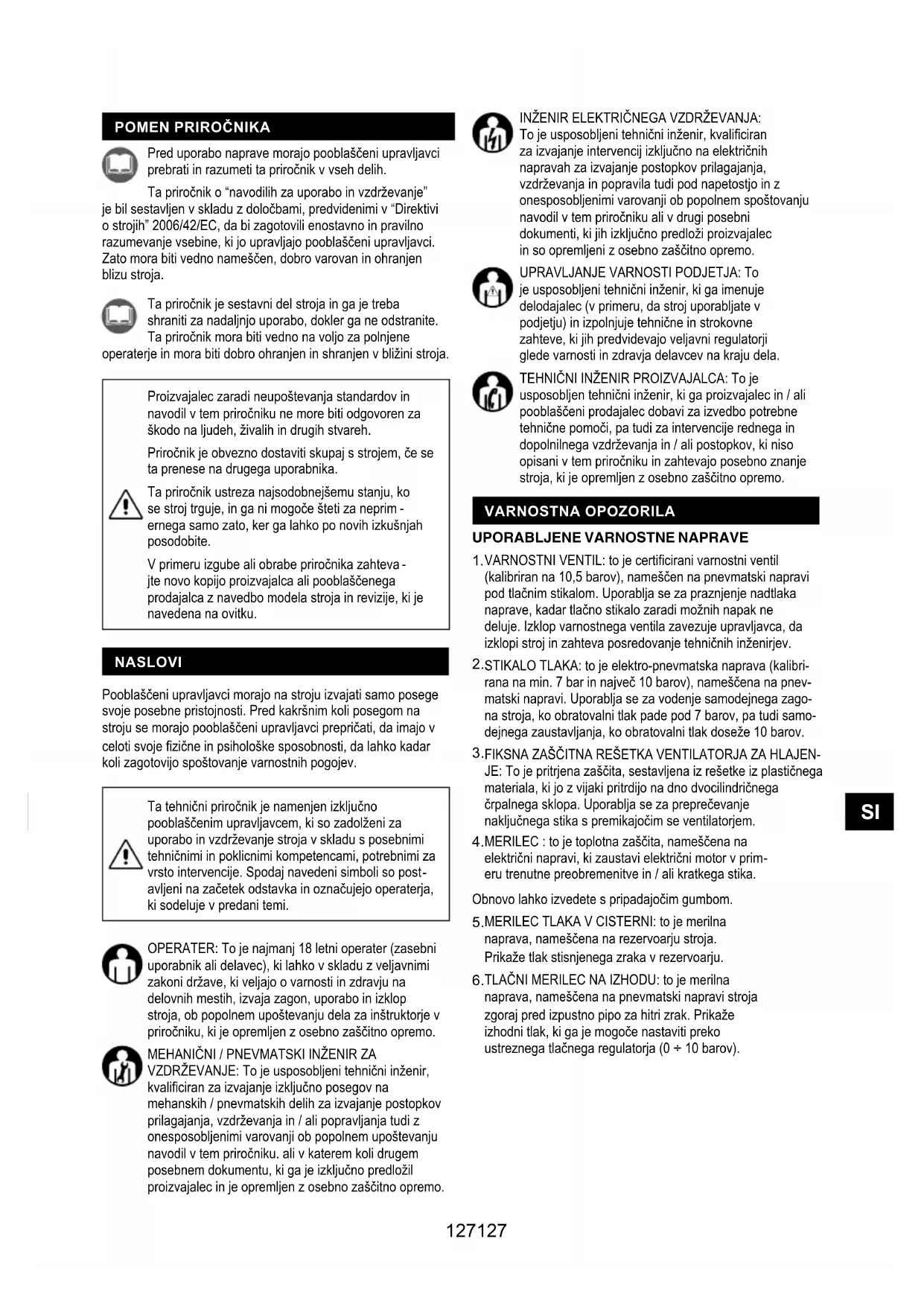 VZDRŽEVANJE: To je usposobljeni tehnični inženir, kvaliciran za izvajanje izključno posegov na mehanskih / pnevmatskih delih za izvajanje postopkov prilagajanja, vzdrževanja in / ali popravljanja tudi z onesposobljenimi varovanji ob popolnem upoštevanju navodil v tem priročniku. ali v katerem koli drugem posebnem dokumentu, ki ga je izključno predložil proizvajalec in je opremljen z osebno zaščitno opremo. 127127SI