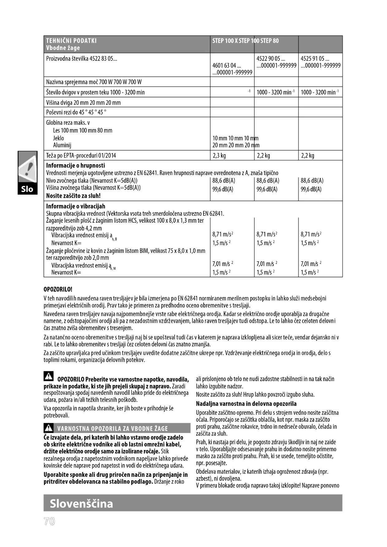 Če izvajate dela, pri katerih bi lahko vstavno orodje zadelo ob skrite električne vodnike ali ob lastni omrežni kabel, držite električno orodje samo za izolirane ročaje. Stik rezalnega orodja z napetostnim vodnikom napeljave lahko privede kovinske dele naprave pod napetost in vodi do električnega udara. Uporabite sponke ali drug priročen način za pripenjanje in pritrditev obdelovanca na stabilno podlago. Držanje z roko ali prislonjeno ob telo ne nudi zadostne stabilnosti in na tak način lahko izgubite nadzor. Nosite zaščito za sluh! Hrup lahko povzroči izgubo sluha. Nadaljna varnostna in delovna opozorila Uporabite zaščitno opremo. Pri delu s strojem vedno nosite zaščitna očala. Priporočajo se zaščitka oblačila, kot npr. maska za zaščito proti prahu, zaščitne rokavice, trdno in nedrseče obuvalo, čelada in zaščita za sluh. Prah, ki nastaja pri delu, je pogosto zdravju škodljiv in naj ne zaide v telo. Uporabljajte odsesavanje prahu in dodatno nosite primerno masko za zaščito proti prahu. Prah, ki se usede, temeljito očistite, npr. posesajte. Obdelava materialov, iz katerih izhaja ogroženost zdravja (npr. azbest), ni dovoljena. V primeru blokade orodja napravo takoj izklopite! Naprave ponovno Slo7171 Slovenščina ne vklapljajte dokler je orodje blokirano; pri tem bi lahko prišlo do povratnega udara z velikim reakcijskim momentom.Ugotovite in odpravite vzroke blokade orodja ob upoštevanju varnostnih navodil. Možni vzroki so lahko: