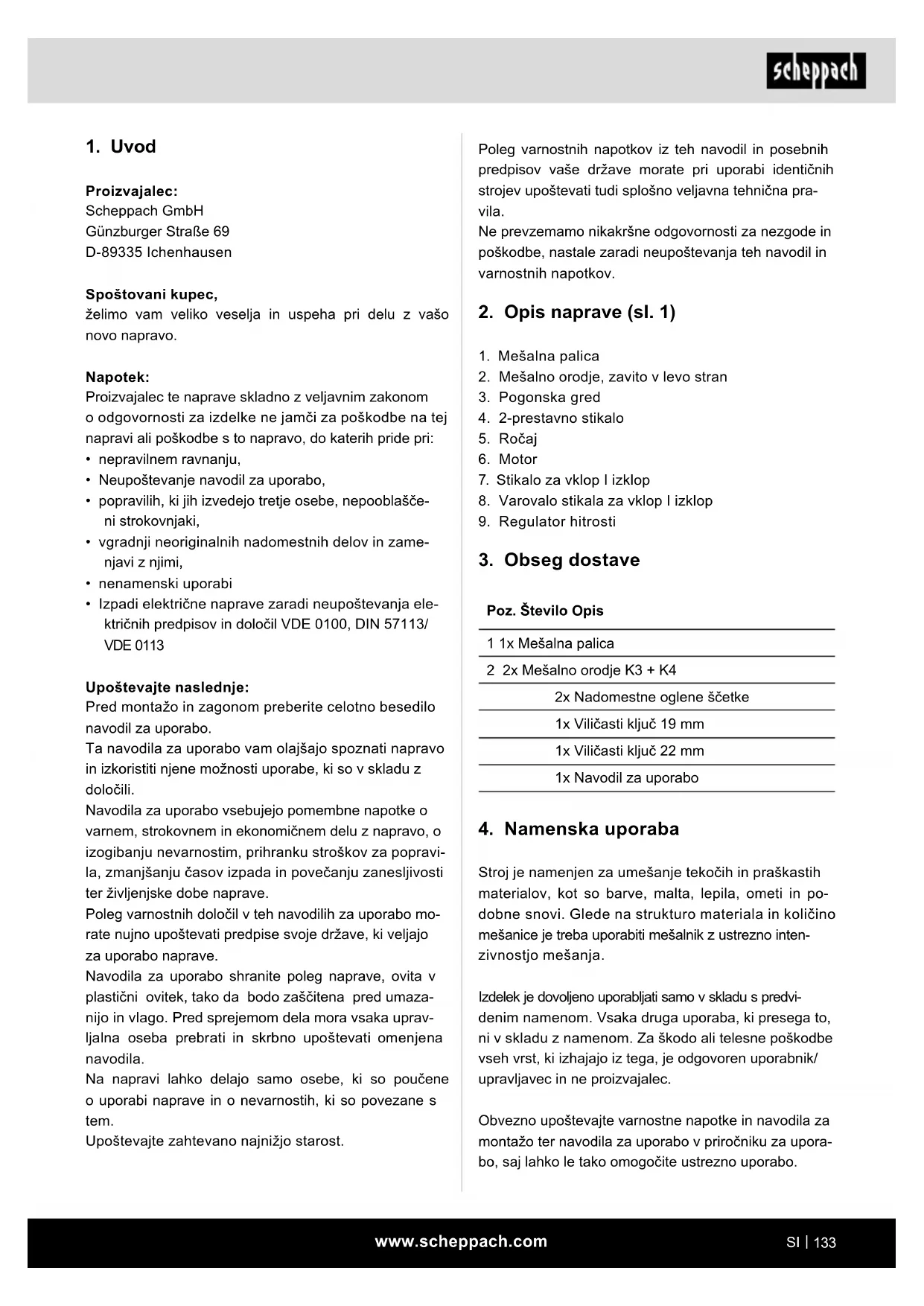 - Izpadi električne naprave zaradi neupoštevanja ele- ktričnih predpisov in določil VDE 0100, DIN 57113/ VDE 0113 Upoštevajte naslednje: Pred montažo in zagonom preberite celotno besedilo navodil za uporabo. Ta navodila za uporabo vam olajšajo spoznati napravo in izkoristiti njene možnosti uporabe, ki so v skladu z določili. Navodila za uporabo vsebujejo pomembne napotke o varnem, strokovnem in ekonomičnem delu z napravo, o izogibanju nevarnostim, prihranku stroškov za popravi- la, zmanjšanju časov izpada in povečanju zanesljivosti ter življenjske dobe naprave. Poleg varnostnih določil v teh navodilih za uporabo mo- rate nujno upoštevati predpise svoje države, ki veljajo za uporabo naprave. Navodila za uporabo shranite poleg naprave, ovita v plastični ovitek, tako da bodo zaščitena pred umaza- nijo in vlago. Pred sprejemom dela mora vsaka uprav- ljalna oseba prebrati in skrbno upoštevati omenjena navodila. Na napravi lahko delajo samo osebe, ki so poučene o uporabi naprave in o nevarnostih, ki so povezane s tem. Upoštevajte zahtevano najnižjo starost.www.scheppach.com