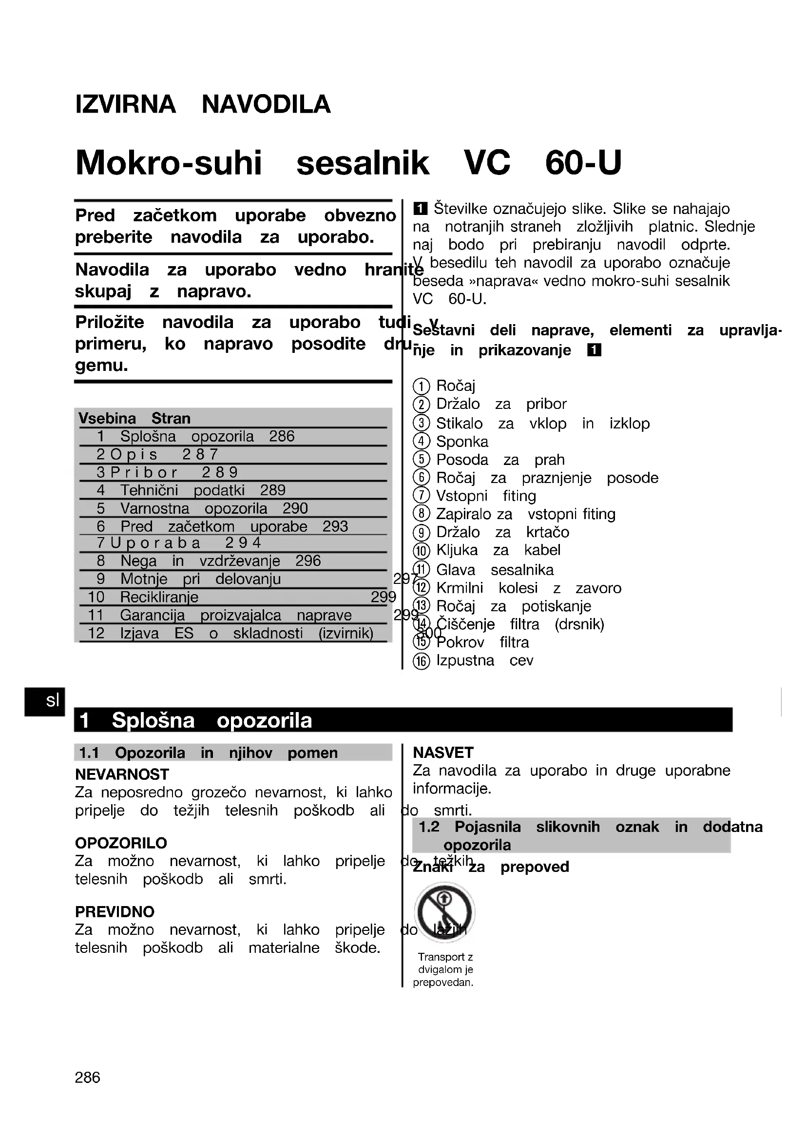 Printed: 05.12.2013 | Doc-Nr: PUB / 5071295 / 000 / 02IZVIRNA NAVODILA Mokro-suhi sesalnik VC 60‑U Pred začetkom uporabe obveznopreberite navodila za uporabo.Navodila za uporabo vedno hraniteskupaj z napravo.Priložite navodila za uporabo tudi vprimeru, ko napravo posodite dru-gemu.Vsebina Stran1 Splošna opozorila 2862Opis 2873Pribor 2894 Tehnični podatki 2895 Varnostna opozorila 2906 Pred začetkom uporabe 2937Uporaba 2948 Nega in vzdrževanje 2969 Motnje pri delovanju 29710 Recikliranje 29911 Garancija proizvajalca naprave 29912 Izjava ES o skladnosti (izvirnik) 300 1 Številke označujejo slike. Slike se nahajajo na notranjih straneh zložljivih platnic. Slednjenaj bodo pri prebiranju navodil odprte. V besedilu teh navodil za uporabo označuje beseda »naprava« vedno mokro-suhi sesalnik VC 60‑U.Sestavni deli naprave, elementi za upravlja-nje in prikazovanje 1 Ročaj Držalo za pribor Stikalo za vklop in izklop Sponka Posoda za prah Ročaj za praznjenje posode Vstopni fiting Zapiralo za vstopni fiting Držalo za krtačo Kljuka za kabel Glava sesalnika Krmilni kolesi z zavoro Ročaj za potiskanje Čiščenje filtra (drsnik) Pokrov filtra Izpustna cev 1 Splošna opozorila