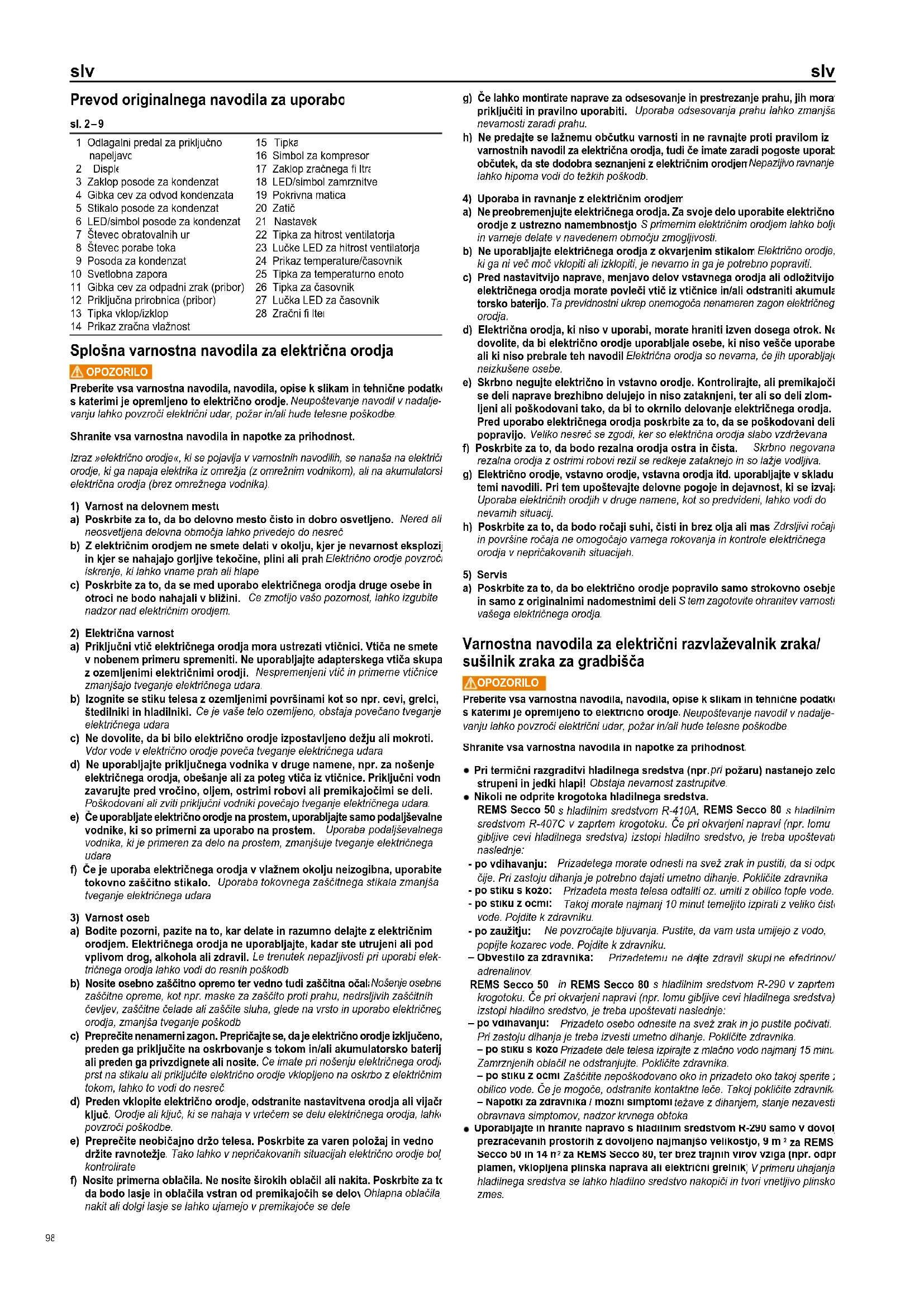 za REMS Secco 80, ter brez trajnih virov vžiga (npr. odprti plamen, vklopljena plinska naprava ali električni grelnik). V primeru uhajanja hladilnega sredstva se lahko hladilno sredstvo nakopiči in tvori vnetljivo plinsko zmes. sl. 2 – 9 1 Odlagalni predal za priključno napeljavo 2 Displej 3 Zaklop posode za kondenzat 4 Gibka cev za odvod kondenzata 5 Stikalo posode za kondenzat 6 LED/simbol posode za kondenzat 7 Števec obratovalnih ur 8 Števec porabe toka 9 Posoda za kondenzat 10 Svetlobna zapora 11 Gibka cev za odpadni zrak (pribor) 12 Priključna prirobnica (pribor) 13 Tipka vklop/izklop 14 Prikaz zračna vlažnost 15 Tipka 16 Simbol za kompresor 17 Zaklop zračnega fi ltra 18 LED/simbol zamrznitve 19 Pokrivna matica 20 Zatič 21 Nastavek 22 Tipka za hitrost ventilatorja 23 Lučke LED za hitrost ventilatorja 24 Prikaz temperature/časovnik 25 Tipka za temperaturno enoto 26 Tipka za časovnik 27 Lučka LED za časovnik 28 Zračni fi lter slv slv 98slv slv