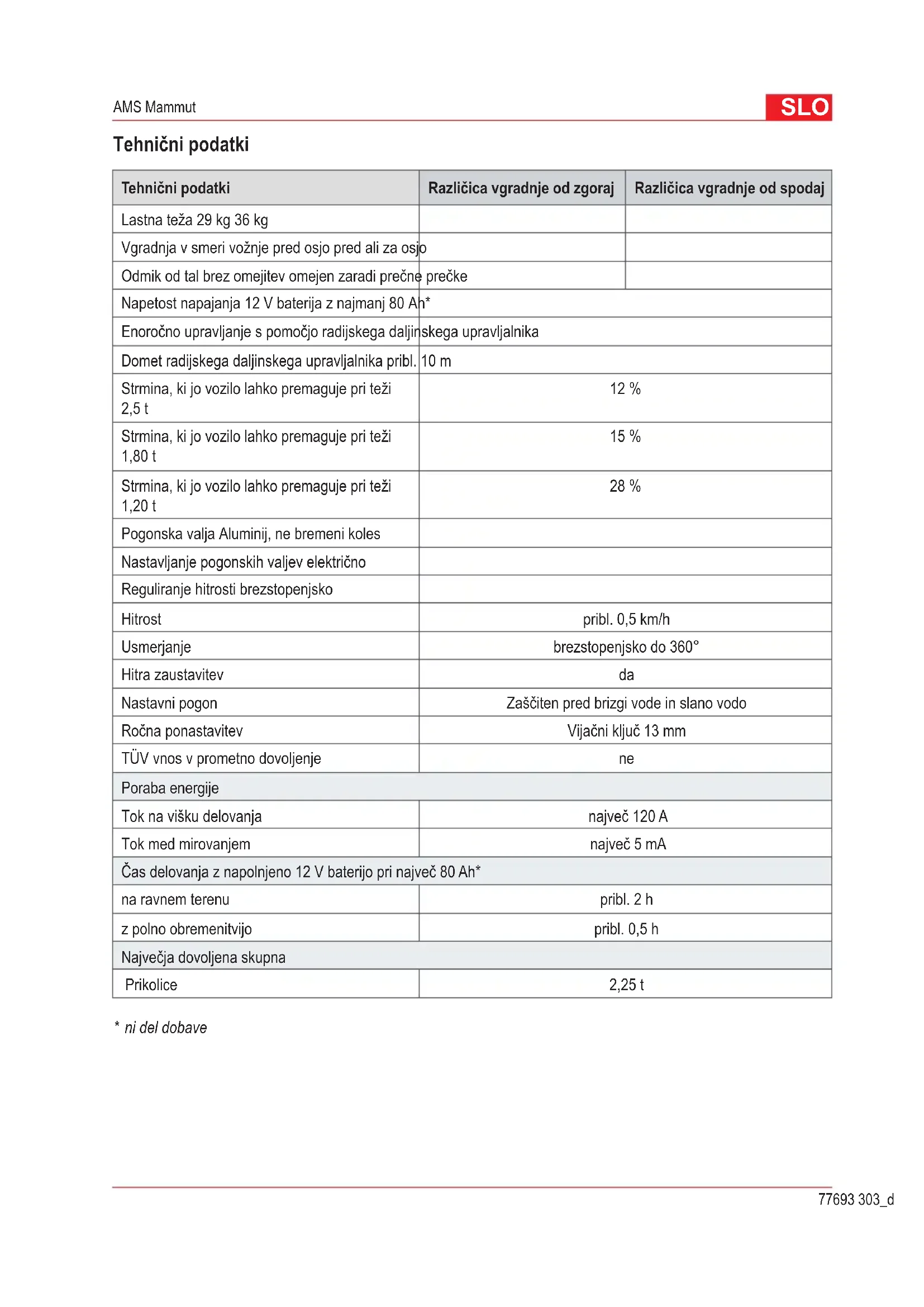 - Evropska deklaracija o skladnosti SLO 77693 303_d AMS Mammut Tehnični podatki Tehnični podatki Različica vgradnje od zgoraj Različica vgradnje od spodaj Lastna teža 29 kg 36 kg Vgradnja v smeri vožnje pred osjo pred ali za osjo Odmik od tal brez omejitev omejen zaradi prečne prečke Napetost napajanja 12 V baterija z najmanj 80 Ah* Enoročno upravljanje s pomočjo radijskega daljinskega upravljalnika Domet radijskega daljinskega upravljalnika pribl. 10 m Strmina, ki jo vozilo lahko premaguje pri teži 2,5 t 12 % Strmina, ki jo vozilo lahko premaguje pri teži 1,80 t 15 % Strmina, ki jo vozilo lahko premaguje pri teži 1,20 t 28 % Pogonska valja Aluminij, ne bremeni koles Nastavljanje pogonskih valjev električno Reguliranje hitrosti brezstopenjsko Hitrost pribl. 0,5 km/h Usmerjanje brezstopenjsko do 360° Hitra zaustavitev da Nastavni pogon Zaščiten pred brizgi vode in slano vodo Ročna ponastavitev Vijačni ključ 13 mm TÜV vnos v prometno dovoljenje ne Poraba energije Tok na višku delovanja največ 120 A Tok med mirovanjem največ 5 mA Čas delovanja z napolnjeno 12 V baterijo pri največ 80 Ah* na ravnem terenu pribl. 2 h z polno obremenitvijo pribl. 0,5 h Največja dovoljena skupna Prikolice 2,25 t p. 87