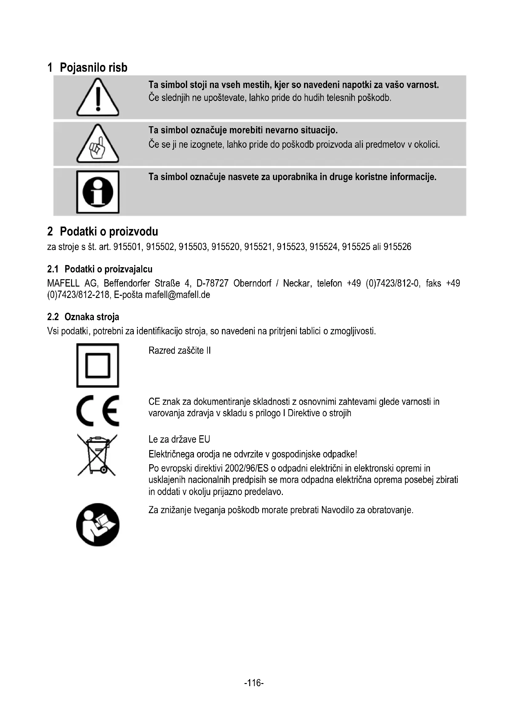 Nevarnost Pri namenski uporabi pa kljub upoštevanju varnostnih določil ostaja preostalo tveganje, ki je pogojeno z namenom uporabe in lahko vodi do zdravstvenih posledic. - Dotik rezkalne verige v odprtem območju. - Dotik dela rezkalne verige, ki štrli pod obdelovancem, med prebijanjem. - Dotik rezkalne verige s strani. - Prelom in izmet rezkalnih verig ali delov rezkalnih verig. - Dotik napetostno prevodnih delov, ko je ohišje odprto, omrežni vtič pa ni izvlečen. - Ogrožanje sluha pri daljšem delu brez zaščite za sluh. - Emisija zdravju nevarnega lesnega prahu pri daljšem obratovanju brez sesanja. 3 Varnostni napotki Nevarnost Vedno upoštevajte sledeče varnostne napotke in varnostna določila, ki veljajo v državi uporabe! Preberite tudi varnostne napotke v priloženi knjižici "Varnostni napotki". Splošni napotki: - Otroci in mladostniki ne smejo delati na tem stroju. Izjema so mladostniki, ki pod nadzorom strokovnjaka delajo na stroju v okviru svoje izobrazbe. - Nikoli ne delajte brez zaščitne opreme, ki je predpisana za določen delovni postopek, in na stroju nikoli ne spreminjajte ničesar, kar lahko vpliva na varnost. - Pri uporabi stroja na prostem priporočamo uporabo zaščitnega stikala za okvarni tok. - Poškodovane kable ali vtiče morate takoj zamenjati. Da se prepreči ogrožanje varnosti, sme zamenjavo izvesti le podjetje Mafell ali pooblaščeni servis MAFELL.-119- - Preprečite ostre pregibe kabla. Predvsem pri transportu in skladiščenju stroja ne smete ovijati kabla okoli stroja. Napotki za uporabo osebne varovalne opreme - Pri vseh delih s strojem vedno nosite osebno varovalno opremo: zaščito sluha, masko proti prahu, zaščitna očala in zaščitne rokavice. Napotki za obratovanje: - Poskrbite za prosto in pred zdrsom varno stojišče stroja z zadostno osvetlitvijo. - Ne obdelujte nobenih obdelovancev, ki so premajhni ali preveliki za zmogljivost stroja. - Rezkalne verige in vodila morate strokovno vpeti in vzdrževati. Pokvarjene rezkalne verige morate pred ponovno uporabo strokovno popraviti. Uporabljajte le ostre rezkalne verige! - Zaščito verige smete odstraniti le za zamenjavo orodja, takoj po zamenjavi pa jo morate znova pritrditi. Nikoli e delajte brez zaščite verige! - Verižnega prebijalnika nikoli ne transportirajte s tekočimi rezkalnimi verigami! Preprečite dotik tekoče rezkalne verige s tlemi. - Stikalo ne sme biti zataknjeno. - Pred vklopom preverite, ali so rezkalne verige pravilno napete. - Kadarkoli je možno, obdelovanec zavarujte pred zasukom ali zdrsom stran, pred prekucem in privzdigom, npr. s primežem. - Z dolbenjem obdelovanca pričnite šele, ko so rezkalne verige dosegle polno štev. vrtljajev. - Preverite, da se na obdelovancu ne nahajajo tujki. Ne prebijajte kovinskih delov, npr. žebljev. - Stroj že pred vklopom čvrsto držite, pri tem morajo biti rezkalne verige proste. S tekočimi rezkalnimi verigami stroj nastavite za dolbenje. Pri tem poskrbite za varno postavitev. - Med dolbenjem nikoli ne posegajte pod obdelovanec in se ga ne dotikajte s strani (nevarnost poškodb!). - Med prebijanjem priključni kabel vedno speljite v smeri nazaj, stran od stroja. - Pomik med prebijanjem prilagodite debelini materiala. Prehitra vdolbitev privede do preobremenitve motorja, nečistih vdolbin, rezkalne verige pa lahko hitro postanejo tope. - Stroj odstranite z obdelovanca šele, ko se rezkalne verige povsem ustavijo. - Ko stroj teče, nikoli ne posegajte v izmet ostružkov ali v nezavarovano območje rezkalne verige. - Pri prebijanju nastal lesni prah omejuje potrebno vidljivost in je deloma zdravju škodljiv. Zato mora biti stroj pri daljši uporabi, če ne obratuje na prostem ali v zadostno zračenih prostorih, priklopljen na napravo za sesanje ostružkov, npr. prenosni mali odpraševalnik. Hitrost zraka mora znašati najmanj 20 m/s. - Z dviganjem obdelovanca začnite šele, ko je stroj pritrjen v skladu s pogl. 5.3 in 5.4 na obdelovanec. - Podprite vpenjanje na obdelovancu tako, da ga držite. Napotki za servisiranje in vzdrževanje: - Pomemben varnostni faktor predstavlja redno čiščenje stroja, predvsem priprav za nastavitev in vodil. - Uporabljati smete le originalne MAFELL nadomestne dele in pribor. V nasprotnem primeru ugasne pravica do garancije in vsaka odgovornost proizvajalca. 4 Opremljanje / nastavitev