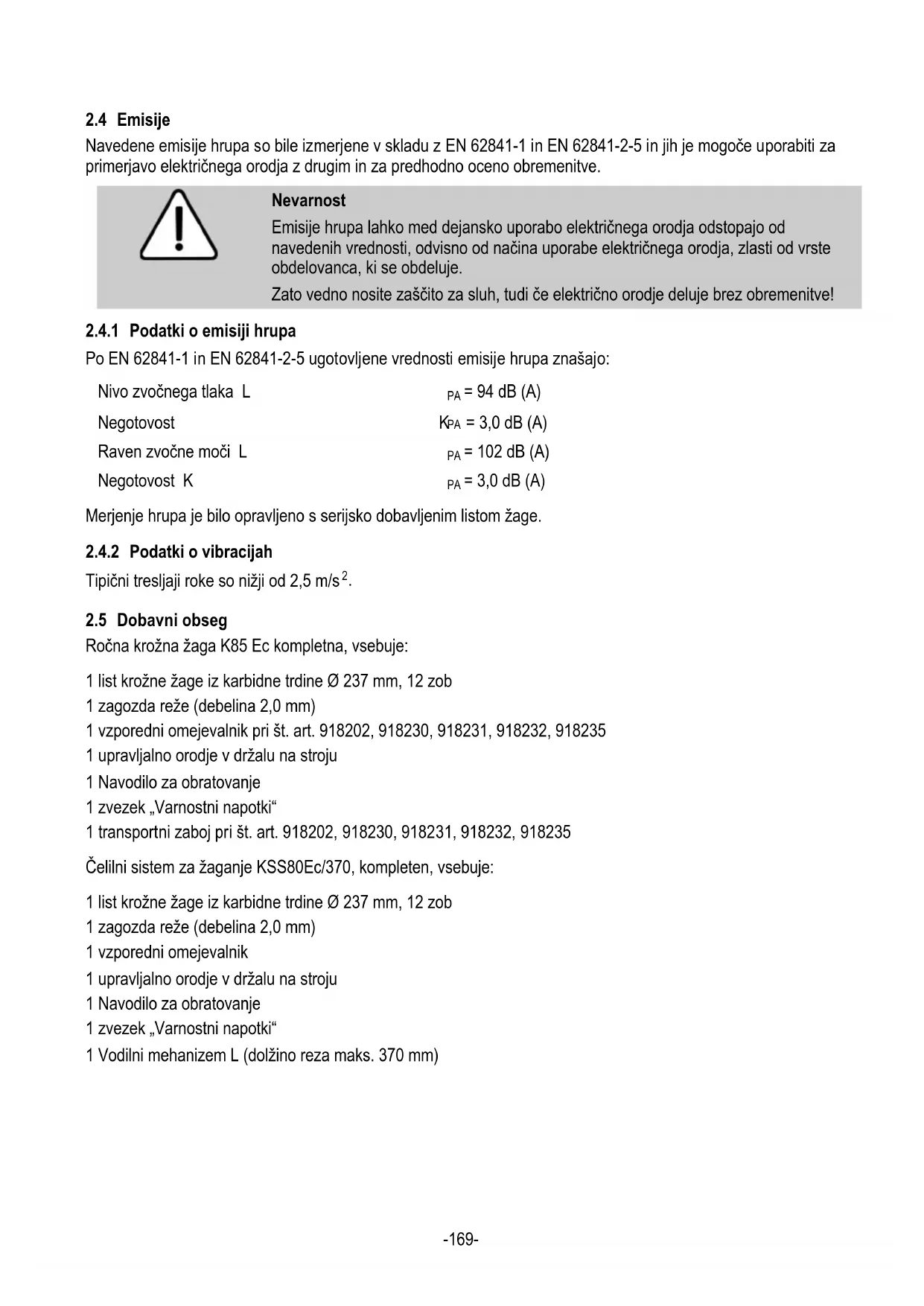 Ročna krožna žaga K85 Ec kompletna, vsebuje: 1 list krožne žage iz karbidne trdine Ø 237 mm, 12 zob 1 zagozda reže (debelina 2,0 mm) 1 vzporedni omejevalnik pri št. art. 918202, 918230, 918231, 918232, 918235 1 upravljalno orodje v držalu na stroju 1 Navodilo za obratovanje 1 zvezek „Varnostni napotki“ 1 transportni zaboj pri št. art. 918202, 918230, 918231, 918232, 918235 Čelilni sistem za žaganje KSS80Ec/370, kompleten, vsebuje: 1 list krožne žage iz karbidne trdine Ø 237 mm, 12 zob 1 zagozda reže (debelina 2,0 mm) 1 vzporedni omejevalnik 1 upravljalno orodje v držalu na stroju 1 Navodilo za obratovanje 1 zvezek „Varnostni napotki“ 1 Vodilni mehanizem L (dolžino reza maks. 370 mm)-170-