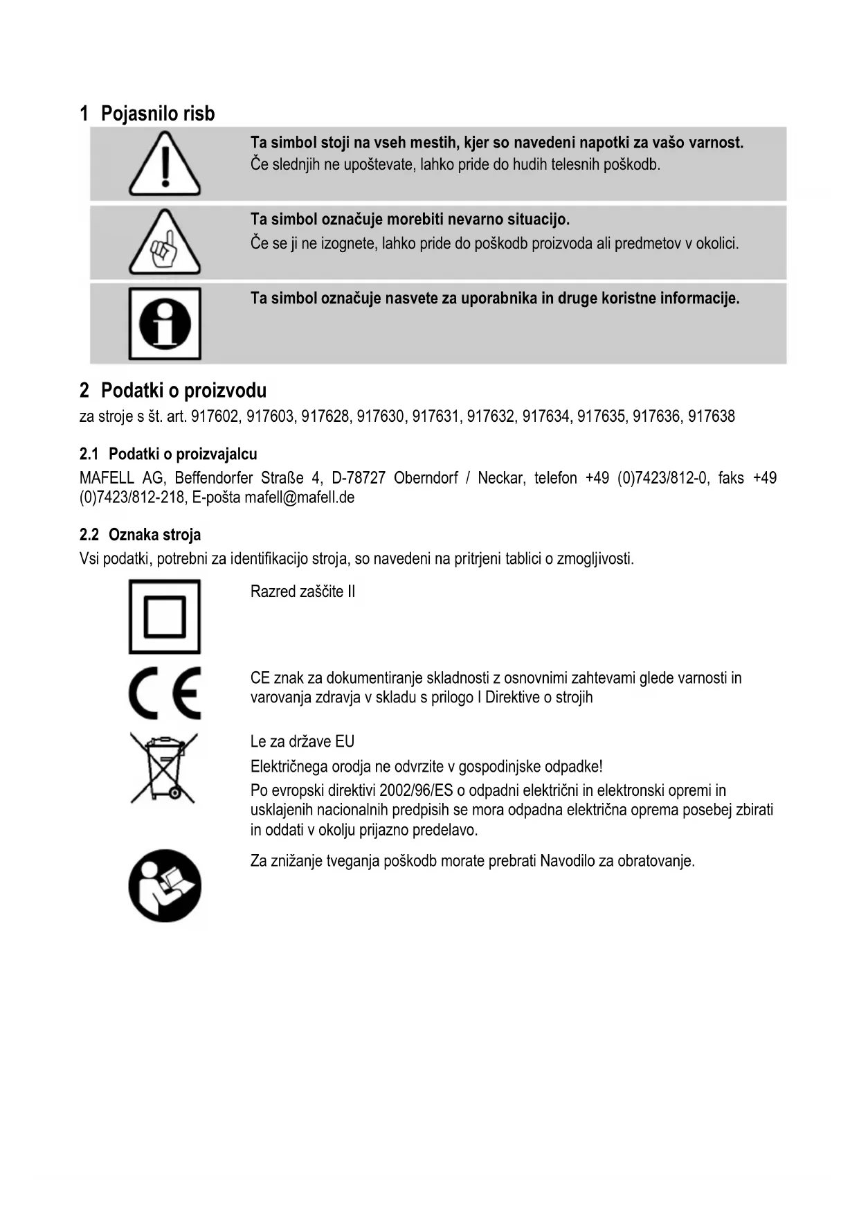 Za znižanje tveganja poškodb morate prebrati Navodilo za obratovanje.2.3 Tehnični podatki Obratovalna napetost