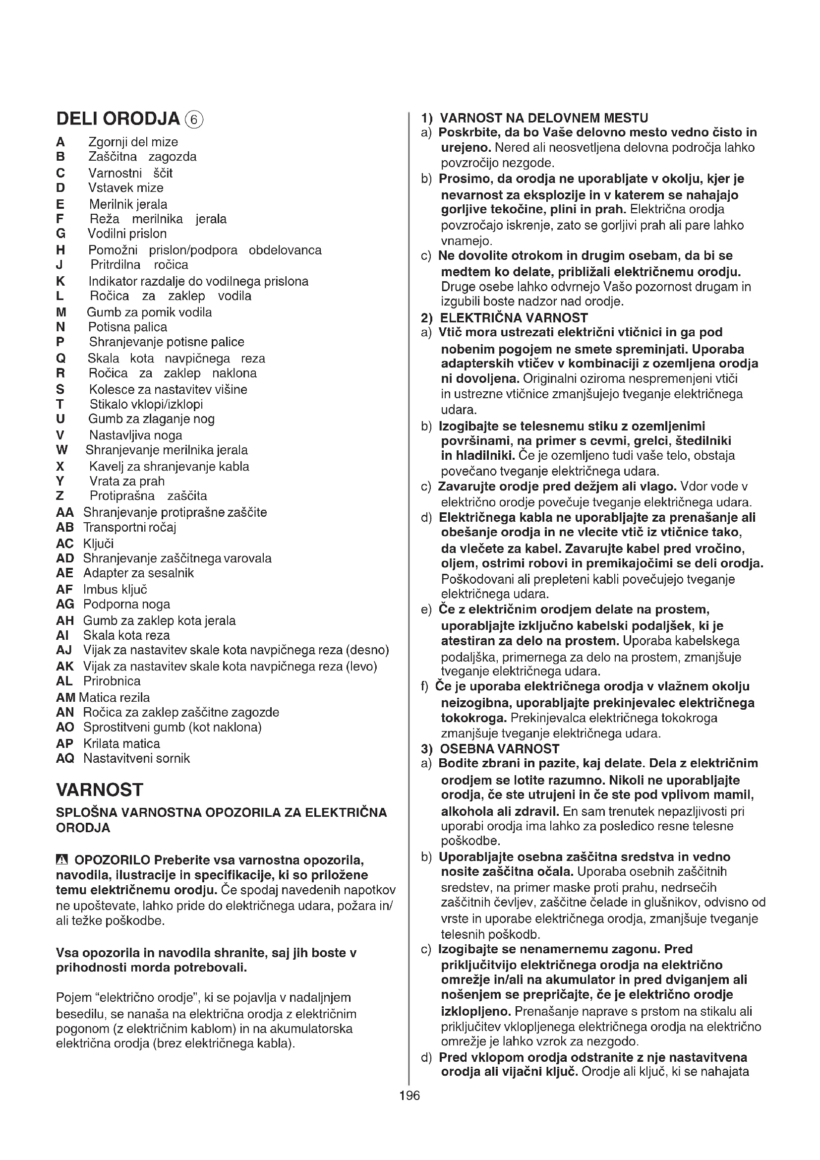 A Zgornji del mize B Zaščitna zagozda C Varnostni ščit D Vstavek mize E Merilnik jerala F Reža merilnika jerala G Vodilni prislon H Pomožni prislon/podpora obdelovanca J Pritrdilna ročica K Indikator razdalje do vodilnega prislona L Ročica za zaklep vodila M Gumb za pomik vodila N Potisna palica P Shranjevanje potisne palice Q Skala kota navpičnega reza R Ročica za zaklep naklona S Kolesce za nastavitev višine T Stikalo vklopi/izklopi U Gumb za zlaganje nog V Nastavljiva noga W Shranjevanje merilnika jerala X Kavelj za shranjevanje kabla Y Vrata za prah Z Protiprašna zaščita AA Shranjevanje protiprašne zaščite AB Transportni ročaj AC Ključi AD Shranjevanje zaščitnega varovala AE Adapter za sesalnik AF Imbus ključ AG Podporna noga AH Gumb za zaklep kota jerala AI Skala kota reza AJ Vijak za nastavitev skale kota navpičnega reza (desno) AK Vijak za nastavitev skale kota navpičnega reza (levo) AL Prirobnica AM Matica rezila AN Ročica za zaklep zaščitne zagozde AO Sprostitveni gumb (kot naklona) AP Krilata matica AQ Nastavitveni sornik VARNOST SPLOŠNA VARNOSTNA OPOZORILA ZA ELEKTRIČNA ORODJA - OPOZORILO Preberite vsa varnostna opozorila, navodila, ilustracije in specikacije, ki so priložene temu električnemu orodju. Če spodaj navedenih napotkov ne upoštevate, lahko pride do električnega udara, požara in/ ali težke poškodbe. Vsa opozorila in navodila shranite, saj jih boste v prihodnosti morda potrebovali. Pojem “električno orodje”, ki se pojavlja v nadaljnjem besedilu, se nanaša na električna orodja z električnim pogonom (z električnim kablom) in na akumulatorska električna orodja (brez električnega kabla).197