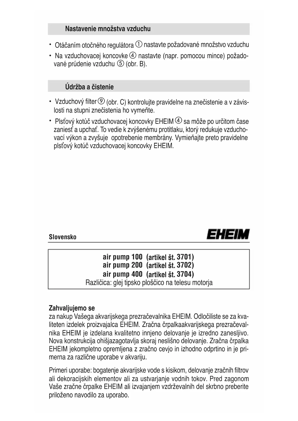 sa môže po určitom čase zaniesť a upchať. To vedie k zvýšenému protitlaku, ktorý redukuje vzducho- vací výkon a zvyšuje opotrebenie membrány. Vymieňajte preto pravidelne plsťový kotúč vzduchovacej koncovky EHEIM. Údržba a čistenie Slovensko air pump 100 ( artikel št. 3701) air pump 200 ( artikel št. 3702) air pump 400 ( artikel št. 3704) Različica: glej tipsko ploščico na telesu motorja Zahvaljujemo se za nakup Vašega akvarijskega prezračevalnika EHEIM. Odločiliste se za kva- liteten izdelek proizvajalca EHEIM. Zračna črpalkaakvarijskega prezračeval- nika EHEIM je izdelana kvalitetno innjeno delovanje je izredno zanesljivo. Nova konstrukcija ohišjazagotavlja skoraj neslišno delovanje. Zračna črpalka EHEIM jekompletno opremljena z zračno cevjo in izhodno odprtino in je pri- merna za različne uporabe v akvariju. Primeri uporabe: bogatenje akvarijske vode s kisikom, delovanje zračnih filtrov ali dekoracijskih elementov ali za ustvarjanje vodnih tokov. Pred zagonom Vaše zračne črpalke EHEIM ali izvajanjem vzdrževalnih del skrbno preberite priloženo navodilo za uporabo.Pred zagonom te naprave skrbno preberite in upoštevajte navodila za uporabo in varnostne na- potke. Ta navodila za uporabo obvezno skrbno shranite. Električnega vtiča nikdar ne prijemajte z mokrimi rokami.