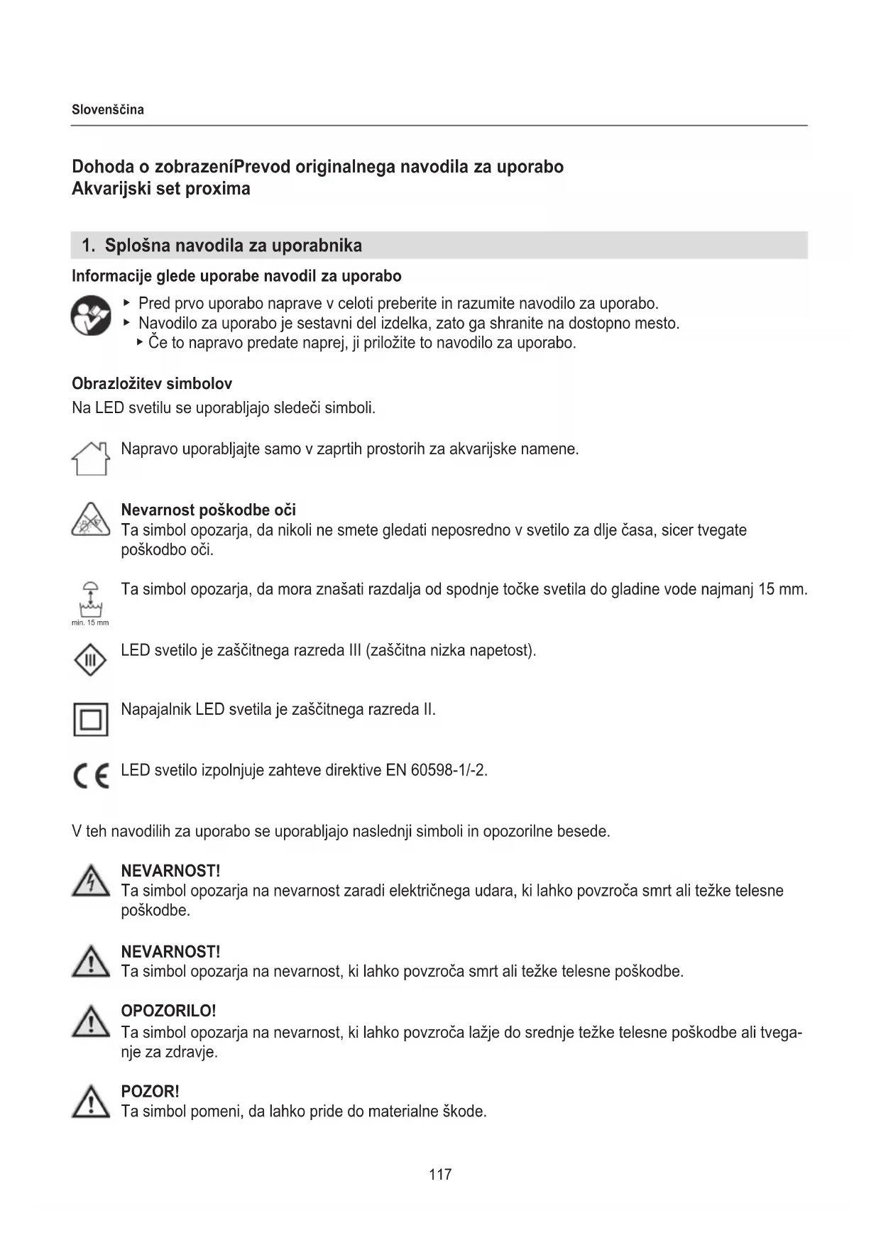 Informacije glede uporabe navodil za uporabo ▶ Pred prvo uporabo naprave v celoti preberite in razumite navodilo za uporabo. ▶ Navodilo za uporabo je sestavni del izdelka, zato ga shranite na dostopno mesto. ▶ Če to napravo predate naprej, ji priložite to navodilo za uporabo. Obrazložitev simbolov Na LED svetilu se uporabljajo sledeči simboli. Napravo uporabljajte samo v zaprtih prostorih za akvarijske namene. Nevarnost poškodbe oči Ta simbol opozarja, da nikoli ne smete gledati neposredno v svetilo za dlje časa, sicer tvegate poškodbo oči. Ta simbol opozarja, da mora znašati razdalja od spodnje točke svetila do gladine vode najmanj 15 mm. LED svetilo je zaščitnega razreda III (zaščitna nizka napetost). Napajalnik LED svetila je zaščitnega razreda II. LED svetilo izpolnjuje zahteve direktive EN 60598-1/-2. V teh navodilih za uporabo se uporabljajo naslednji simboli in opozorilne besede. NEVARNOST! Ta simbol opozarja na nevarnost zaradi električnega udara, ki lahko povzroča smrt ali težke telesne poškodbe. NEVARNOST! Ta simbol opozarja na nevarnost, ki lahko povzroča smrt ali težke telesne poškodbe. OPOZORILO! Ta simbol opozarja na nevarnost, ki lahko povzroča lažje do srednje težke telesne poškodbe ali tvega- nje za zdravje. POZOR! Ta simbol pomeni, da lahko pride do materialne škode. min. 15 mm118 Slovenščina Nasvet s koristnimi informacijami in namigi. Običajni prikazi: Sklic na sliko, tukaj sklic na sliko A Pozvani ste k izvedbi nekega ukrepa.