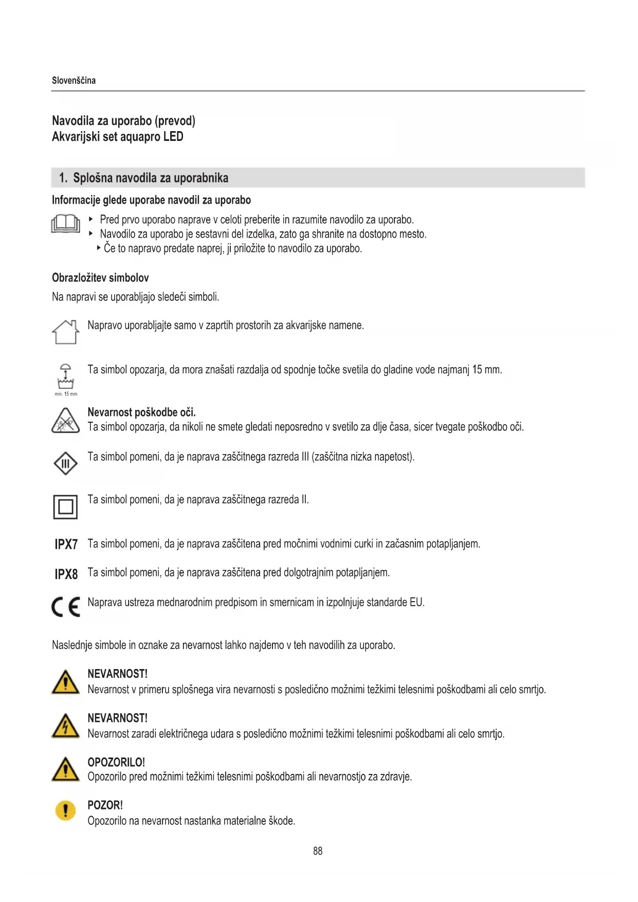 Informacije glede uporabe navodil za uporabo ▶ Pred prvo uporabo naprave v celoti preberite in razumite navodilo za uporabo. ▶ Navodilo za uporabo je sestavni del izdelka, zato ga shranite na dostopno mesto. ▶ Če to napravo predate naprej, ji priložite to navodilo za uporabo. Obrazložitev simbolov Na napravi se uporabljajo sledeči simboli. Napravo uporabljajte samo v zaprtih prostorih za akvarijske namene. Ta simbol opozarja, da mora znašati razdalja od spodnje točke svetila do gladine vode najmanj 15 mm. Nevarnost poškodbe oči. Ta simbol opozarja, da nikoli ne smete gledati neposredno v svetilo za dlje časa, sicer tvegate poškodbo oči. Ta simbol pomeni, da je naprava zaščitnega razreda III (zaščitna nizka napetost). Ta simbol pomeni, da je naprava zaščitnega razreda II. Ta simbol pomeni, da je naprava zaščitena pred močnimi vodnimi curki in začasnim potapljanjem. Ta simbol pomeni, da je naprava zaščitena pred dolgotrajnim potapljanjem. Naprava ustreza mednarodnim predpisom in smernicam in izpolnjuje standarde EU. Naslednje simbole in oznake za nevarnost lahko najdemo v teh navodilih za uporabo. NEVARNOST! Nevarnost v primeru splošnega vira nevarnosti s posledično možnimi težkimi telesnimi poškodbami ali celo smrtjo. NEVARNOST! Nevarnost zaradi električnega udara s posledično možnimi težkimi telesnimi poškodbami ali celo smrtjo. OPOZORILO! Opozorilo pred možnimi težkimi telesnimi poškodbami ali nevarnostjo za zdravje. POZOR! Opozorilo na nevarnost nastanka materialne škode. min. 15 mm IPX7 IPX889 Slovenščina Nasvet s koristnimi informacijami in namigi. Opis ustaljene rabe Sklic na sliko, tukaj sklic na sliko A Pozvani ste k izvedbi nekega ukrepa.