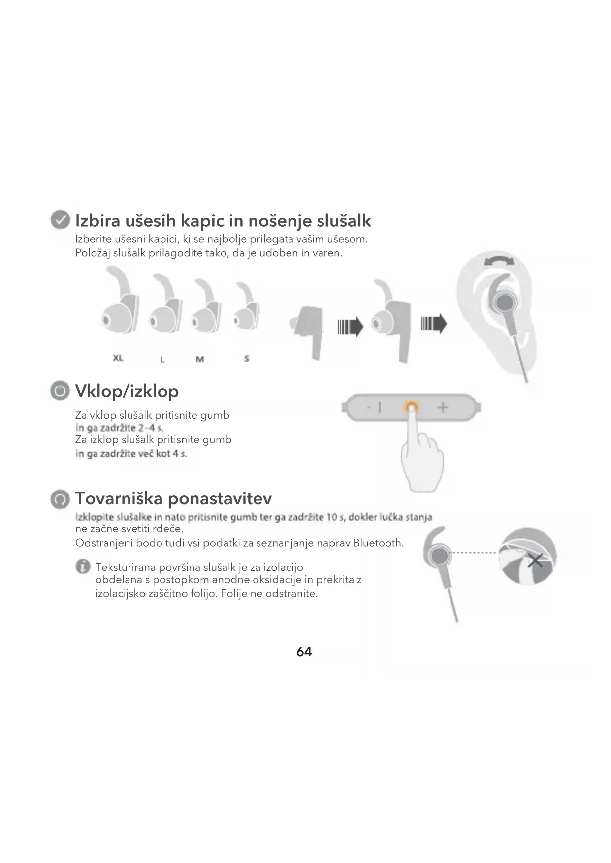 Izbira ušesih kapic in nošenje slušalk Izberite ušesni kapici, ki se najbolje prilegata vašim ušesom. Položaj slušalk prilagodite tako, da je udoben in varen. Vklop/izklop Za vklop slušalk pritisnite gumb Za izklop slušalk pritisnite gumb Tovarniška ponastavitev ne začne svetiti rdeče. Odstranjeni bodo tudi vsi podatki za seznanjanje naprav Bluetooth. Teksturirana površina slušalk je za izolacijo obdelana s postopkom anodne oksidacije in prekrita z izolacijsko zaščitno folijo. Folije ne odstranite.65 Seznanjanje Ob prvem vklopu se v slušalkah samodejno aktivira način za seznanjanje. Ko preklopite v način za seznanjanje, se slušalke samodejno izklopijo, Ko so slušalke izklopljene, pritisnite gumb in ga zadržite utripa rdeče in modro za preklop slušalk v način za seznanjenje. Ponovno vzpostavljanje povezave pri vklopu Ob vklopu slušalke samodejno znova vzpostavijo povezavo z zadnjim telefonom, s katerim je bila vzpostavljena povezava. Ponovno vzpostavljanje povezave po prekinitvi zaradi razdalje Ko slušalke prekinejo povezavo s telefonom: samodejno izklopijo. Zaradi razlik v tehnologijah Bluetooth nekateri modeli telefonov ne podpirajo samodejnega ponovnega vzpostavljanja povezave. To ne predstavlja težave s slušalkami. Vzpostavljanje povezave z dvema telefonoma