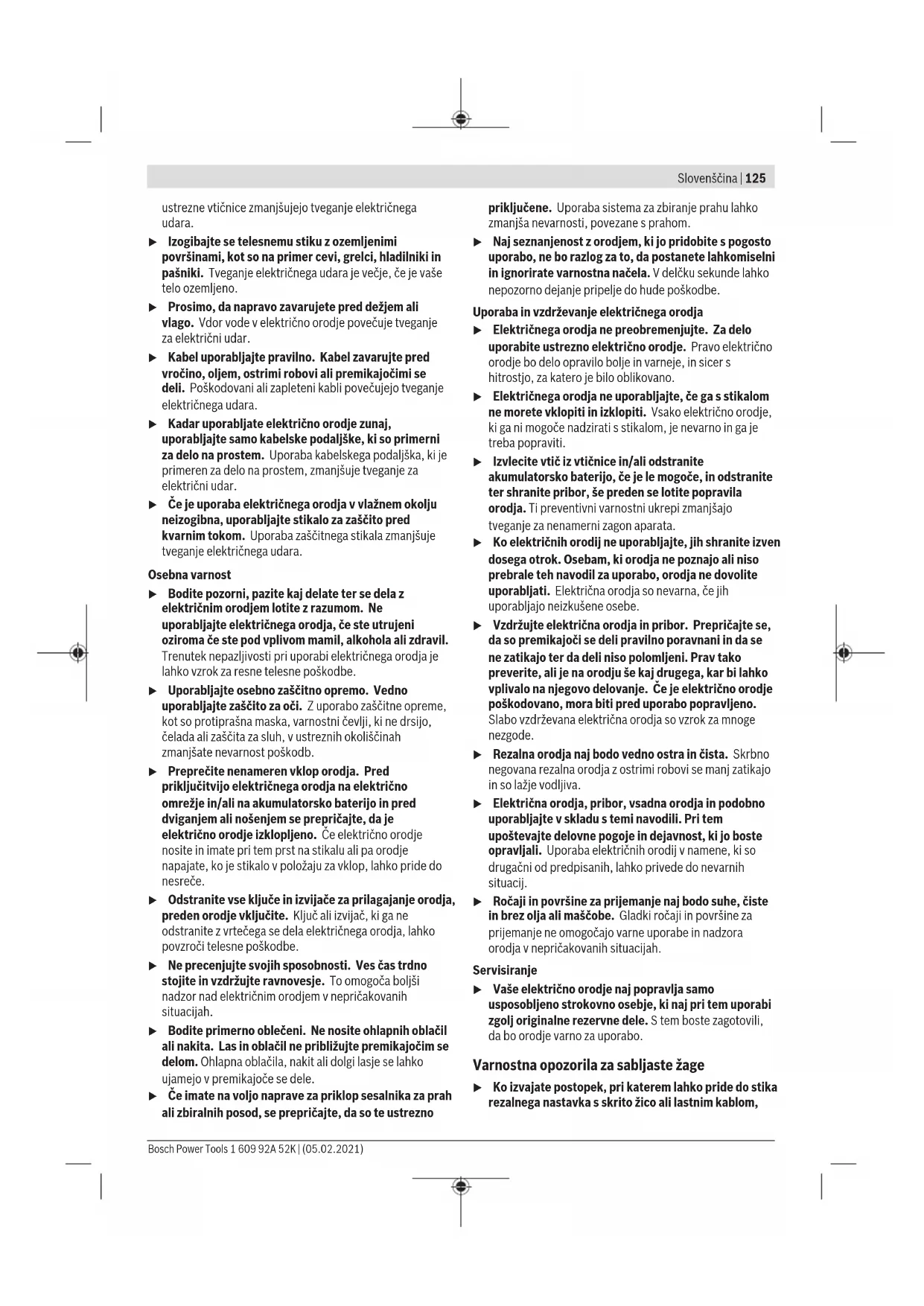 Vrednosti nivoja tresljajev in hrupa, podane v teh navodilih, so bile izmerjene v skladu s standardiziranim merilnim postopkom in se lahko uporabljajo za medsebojno primerjavo električnih orodij. Primerne so tudi za začasno oceno oddajanja tresljajev in hrupa. Naveden nivo tresljajev in hrupa je določen na osnovi glavnih načinov uporabe električnega orodja. Pri uporabi orodja v drugačne namene, z drugačnimi nastavki ali pri nezadostnem vzdrževanju lahko nivo hrupa in tresljajev odstopa. To lahko obremenjenost s hrupom in tresljaji v celotnem obdobju uporabe občutno poveča. Za natančnejšo oceno obremenjenosti s hrupom in tresljaji morate upoštevati tudi čas, ko je orodje izklopljeno, in čas, ko orodje deluje, vendar dejansko ni v uporabi. To lahko občutno zmanjša obremenjenost s hrupom in tresljaji, ki je razporejena na celotno obdobje uporabe. Določite dodatne varnostne ukrepe za zaščito uporabnika pred vplivi tresljajev, npr. vzdrževanje električnega orodja in nastavkov, segrevanje rok, organizacija delovnih postopkov. Namestitev u Pred začetkom kakršnih koli del na električnem orodju izvlecite omrežni vtič iz vtičnice. Namestitev/menjava žaginega lista u Pri namestitvi ali menjavi nastavkov nosite zaščitne rokavice. Nastavki so ostri in se lahko pri daljši uporabi močno segrejejo. u Pri zamenjavi žaginega lista pazite na to, da v prijemalu ne bo ostankov materiala, na primer lesa ali kovinskih ostružkov. u Prepričajte se, da v vpenjalu za list ni odlomljenega stebla. Izbira žaginega lista Pregled žaginih listov, ki jih priporoča proizvajalec, boste našli na koncu navodil. Namestite samo žagine liste z univerzalnim steblom 1/2". Žagin list ne sme biti daljši, kot je potrebno za predviden rez. Steblo žaginega lista mora imeti premer0,8–1,8mm. Namestitev žaginega lista (glejte slikoA) Pritisnite ročico SDS(9) naprej in namestite žagin list(1) za prijemalno ploščo v vpenjalo žaginega lista(3). Izpustite ročico SDS(9). u Povlecite žagin list, da preverite, ali je trdno nameščen. Razrahljan žagin list se lahko sname in vas poškoduje. Za določena dela lahko žagin list(1) tudi obrnete za 180° (zobje so obrnjeni navzgor) in znova vstavite. Odstranitev žaginega lista (glejteslikoB) u Pred odstranjevanjem pustite žagin list, da se ohladi. Ob stiku z vročim žaginim listom obstaja nevarnost poškodbe. Pritisnite ročico SDS(9) naprej in izvlecite žagin list(1). Izpustite ročico SDS(9). Odsesavanje prahu/ostružkov Prah nekaterih materialov, npr. svinčenega premaza, nekaterih vrst lesa, mineralov in kovin lahko škoduje zdravju. Dotik ali vdihavanje tega prahu lahko povzroči alergične reakcije in/ali obolenja dihal uporabnika ali drugih prisotnih oseb. Določene vrste prahu, kot je npr. prah hrastovine ali bukovja, so rakotvorne, še posebej skupaj z dodatnimi snovmi za obdelavo lesa (kromat, zaščitno sredstvo za les). Material z vsebnostjo azbesta smejo obdelovati le strokovnjaki. – Poskrbite za dobro zračenje delovnega mesta. – Priporočamo, da nosite zaščitno masko za prah s filtrirnim razredom P2. Upoštevajte veljavne nacionalne predpise za obdelovane materiale. u Preprečite nabiranje prahu na delovnem mestu. Prah se lahko hitro vname. Delovanje Uporaba u Upoštevajte omrežno napetost! Napetost vira električne energije se mora ujemati s podatki na označevalni tablici električnega orodja. Orodje, ki je označeno z 230V, lahko priključite tudi na napetost 220V. Vklop/izklop Za vklop električnega orodja pritisnite stikalo za vklop/izklop (6). Za zaklep stikala za vklop/izklop (6) pritisnite stikalo, ga pridržite in hkrati pritisnite na gumb za zaklep (5). Za izklop električnega orodja spustite stikalo za vklop/izklop (6). Če je stikalo za vklop/izklop (6) zapahnjeno, nanj najprej pritisnite in ga nato izpustite. Krmiljenje števila hodov Število hodov vklopljenega električnega orodja lahko brezstopenjsko upravljate z različno močnim pritiskanjem na stikalo za vklop/izklop (6). Rahel pritisk na stikalo za vklop/izklop (6) povzroči manjše število premikov. Z močnejšim pritiskanjem stikala se število hodov poveča. Nastavitev potrebnega števila hodov je odvisna od vrste obdelovanca in od delovnih pogojev, ugotovite pa ga lahko s praktičnim poizkusom. Zmanjšanje števila hodov je priporočljivo pri namestitvi žaginega lista na obdelovanec ter pri žaganju umetnih mas in aluminija. Kadar z manjšim številom hodov delate dalj časa, se lahko električno orodje močno segreje. Da bi se električno orodje lahko ohladilo, odstranite žagin list in pustite, da orodje pribl. 3min deluje z največjim številom hodov. Bosch Power Tools 1 609 92A 52K | (05.02.2021)