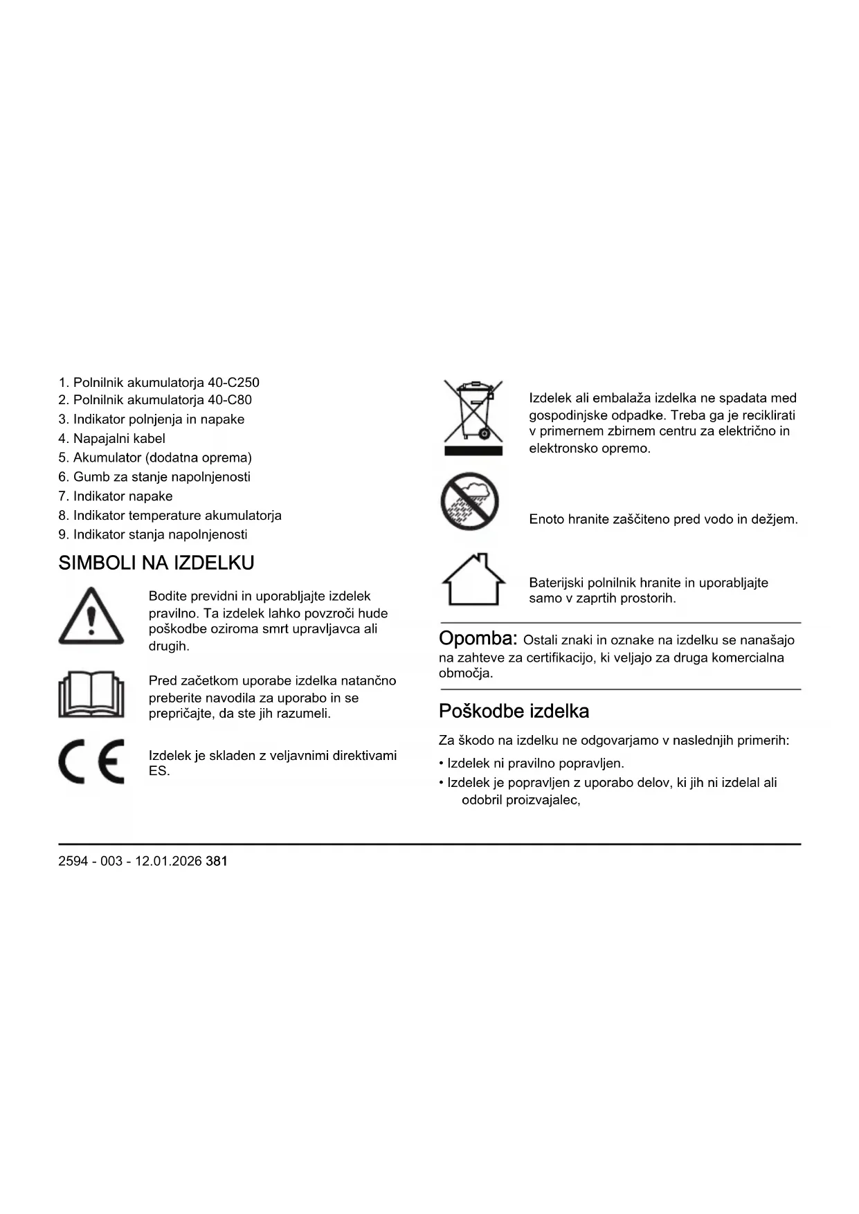 Bodite previdni in uporabljajte izdelek pravilno. Ta izdelek lahko povzroči hude poškodbe oziroma smrt upravljavca ali drugih. Pred začetkom uporabe izdelka natančno preberite navodila za uporabo in se prepričajte, da ste jih razumeli. Izdelek je skladen z veljavnimi direktivami ES. Izdelek ali embalaža izdelka ne spadata med gospodinjske odpadke. Treba ga je reciklirati v primernem zbirnem centru za električno in elektronsko opremo. Enoto hranite zaščiteno pred vodo in dežjem. Baterijski polnilnik hranite in uporabljajte samo v zaprtih prostorih. Opomba: Ostali znaki in oznake na izdelku se nanašajo na zahteve za certifikacijo, ki veljajo za druga komercialna območja. Poškodbe izdelka Za škodo na izdelku ne odgovarjamo v naslednjih primerih: