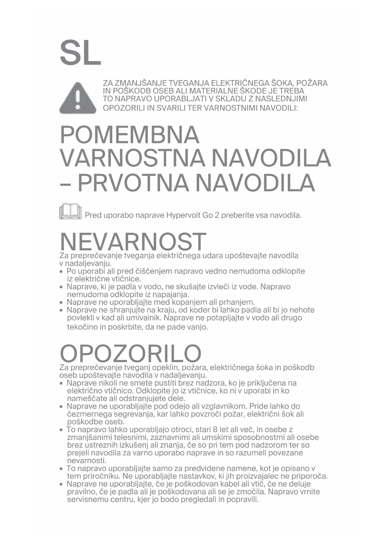 - nosečnost, sladkorna bolezen z zapleti, kot so nevropatija ali poškodbe mrežnice, uporaba srčnih spodbujevalnikov, nedavni kirurški poseg ali poškodba, epilepsija ali migrene, izbočenost medvretenčne ploščice, spondilolisteza, spondiloliza ali spondiloza, nedavne zamenjave sklepov ali vstavitev materničnega vložka, vstavljeni kovinski zatiči ali ploščice ali drugi pomisleki, povezani s fizičnim zdravjem. Bolehne posameznike in otroke mora med uporabo udarne ali vibracijske naprave spremljati odrasla oseba. Navedene kontraindikacije ne pomenijo, da uporaba udarne ali vibracijske naprave za vas ni primerna, vendar priporočamo, da se pred tem posvetujete z osebnim zdravnikom. Z nenehnimi raziskavami proučujemo učinke udarne masaže pri posebnih zdravstvenih težavah, da bi skrajšali seznam zgoraj navedenih kontraindikacij. Naprava Hypervolt Go 2 vsebuje baterijo, ki jo je treba varno odložiti v obratu zaodstranjevanje elektronske opreme ali obratu za recikliranje.POZOR V primeru nepravilne uporabe lahko baterija, uporabljena v tej napravi, predstavlja tveganje požara ali kemičnih opeklin. Ne razstavljajte, segrevajte nad 100°C ali zažigajte. Izrabljeno baterijo takoj zavrzite. Shranjujte nedosegljivo otrokom. Ne razstavljajte ali odvrzite v ogenj. TA NAVODILA SHRANITE Naprava Hypervolt Go 2 je ročna udarna masažna naprava, ki dovaja tlačne pulze za nego mišic, sproščanje napetosti, sproščujočo masažo, hitrejše ogrevanje in okrevanje ter ohranjanje gibljivosti in obsega gibanja. UPRAVLJANJE Pritisnite gumb za vklop/izklop/hitrost na hrbtni strani naprave. Pridržite gumb za dve sekundi, da indikator napolnjenosti baterije (LED-pas) zasveti, nato ga izpustite. Naprava Hypervolt Go 2 je zdaj pripravljena na uporabo. Izberite želeno hitrost (1–3) tako, da za posamezno nastavitev po enkrat pritisnete gumb za vklop/izklop/hitrost. Bele lučke na hrbtnem delu so indikator nastavitve hitrosti. Za izklop naprave preprosto pritisnite in dve sekundi pridržite gumb za vklop/izklop/hitrost.