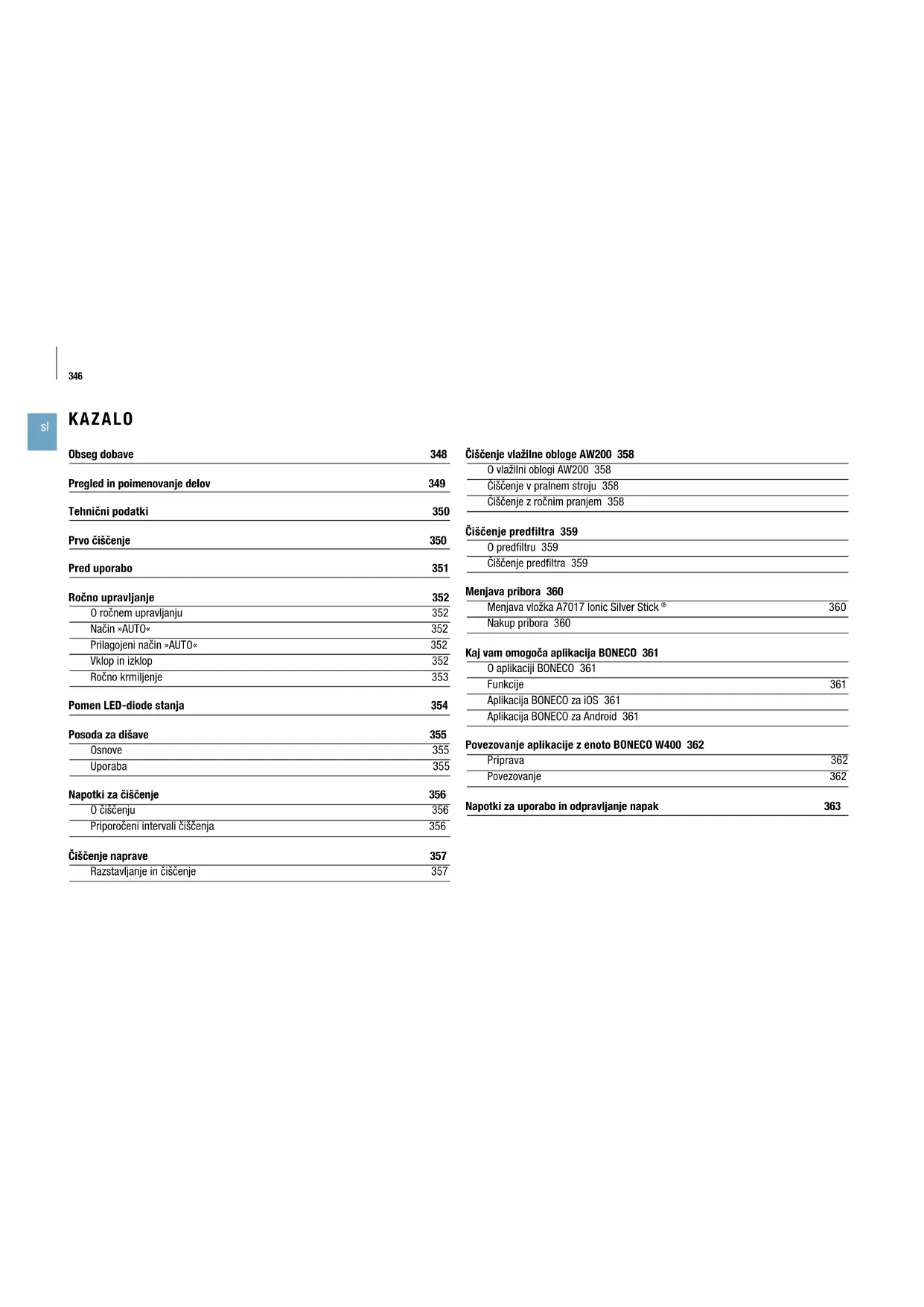 Nakup pribora 360 Kaj vam omogoča aplikacija BONECO 361 O aplikaciji BONECO 361 Funkcije 361 Aplikacija BONECO za iOS 361 Aplikacija BONECO za Android 361 Povezovanje aplikacije z enoto BONECO W400 362 Priprava 362 Povezovanje 362 Napotki za uporabo in odpravljanje napak 363 Obseg dobave 348 Pregled in poimenovanje delov 349 Tehnični podatki 350 Prvo čiščenje 350 Pred uporabo 351 Ročno upravljanje 352 O ročnem upravljanju 352 Način »AUTO« 352 Prilagojeni način »AUTO« 352 Vklop in izklop 352 Ročno krmiljenje 353 Pomen LED-diode stanja 354 Posoda za dišave 355 Osnove 355 Uporaba 355 Napotki za čiščenje 356 O čiščenju 356 Priporočeni intervali čiščenja 356 Čiščenje naprave 357 Razstavljanje in čiščenje 357 KAZALOBONECO APLIKACIJA Izkoristite prednost brezplačne aplikacije BONECO s številnimi koristnimi nasveti v zvezi z uporabo vašega vlažilnika zraka BONECO. Tako boste zagotovili higienično delovanje in izboljšanje kakovosti zraka v prostoru. Vaše prednosti: ■ Dodatne prednosti naprav BONECO Bluetooth ■ Spletni nakupi pribora in naprav ■ Informacije o izdelkih ■ Uporabniški priročnik ■ Praktičen koledar vzdrževanja ■ … in še več348