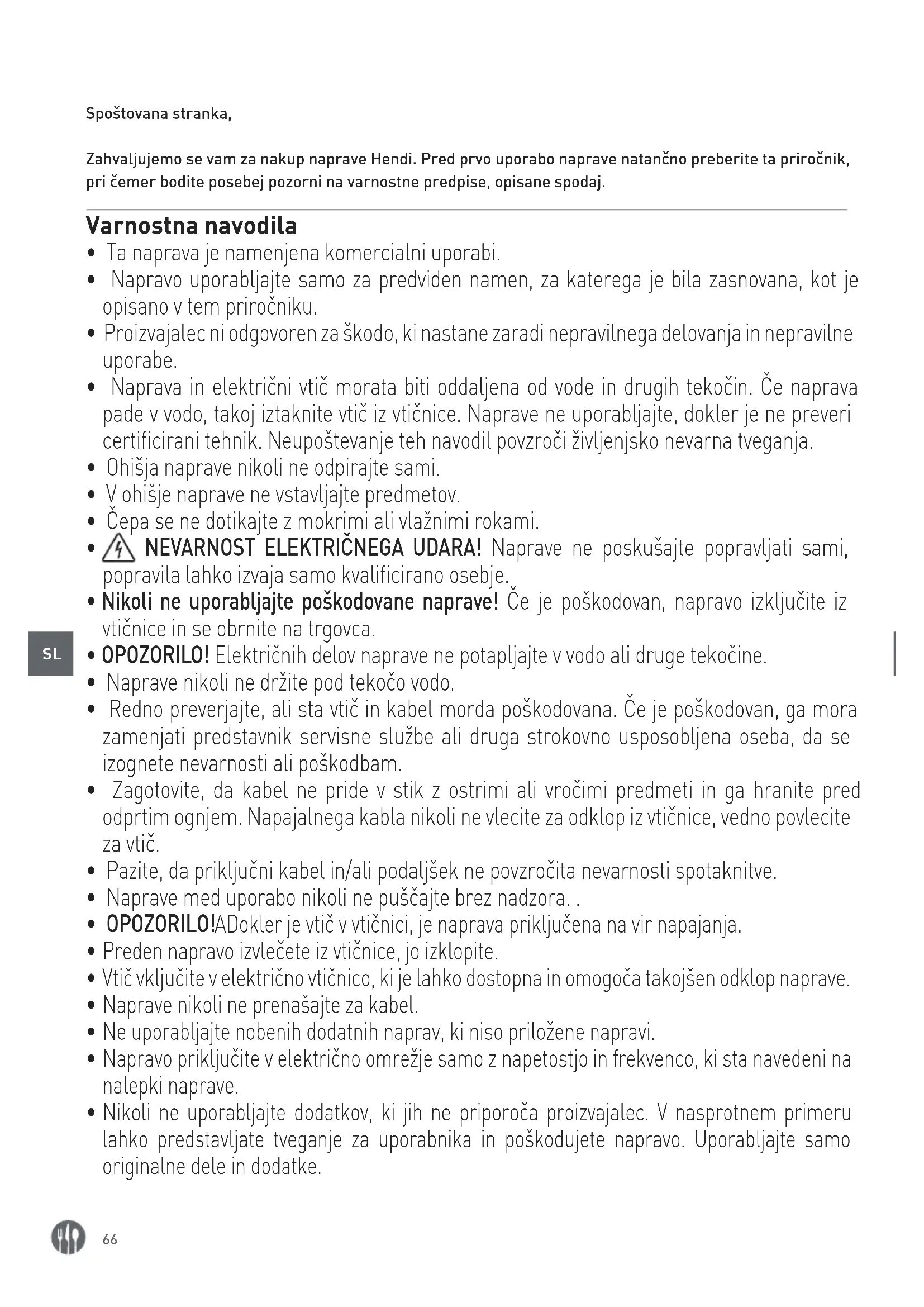 Spoštovana stranka, Zahvaljujemo se vam za nakup naprave Hendi. Pred prvo uporabo naprave natančno preberite ta priročnik, pri čemer bodite posebej pozorni na varnostne predpise, opisane spodaj. Varnostna navodila