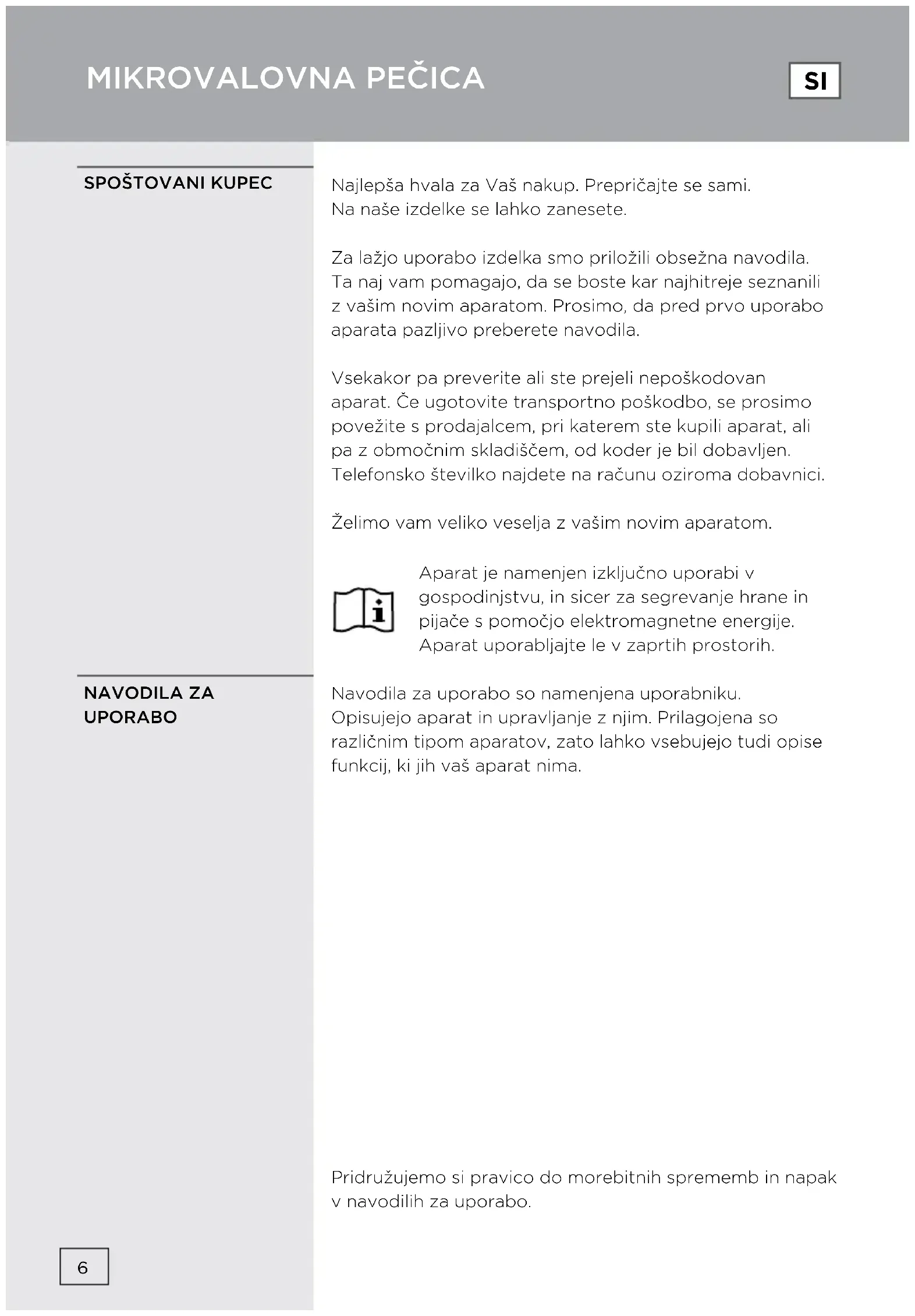 Za informacije ali v primeru težav se obrnite na Gorenjev center za pomoč uporabnikom v vaši državi (telefonsko številko najdete v mednarodnem garancijskem listu). Če v vaši državi takšnega centra ni, se obrnite na lokalnega Gorenjevega prodajalca ali Gorenjev oddelek za male gospodinjske aparate. Do morebitnega neujemanja barvnih nians med različnimi aparati ali sestavnimi elementi znotraj ene design linije lahko prihaja zaradi različnih dejavnikov, kot so npr. različni koti, pod katerimi gledamo aparate, različna barvna ozadja, materiali ter osvetljenost prostora. Samo za osebno uporabo! Dodatna priporočila za pečenje z mikrovalovi ter koristne nasvete najdete na spletni strani: http://www.gorenje.si VELIKO UŽITKA OB UPORABI VAŠE MIKROVALOVNE