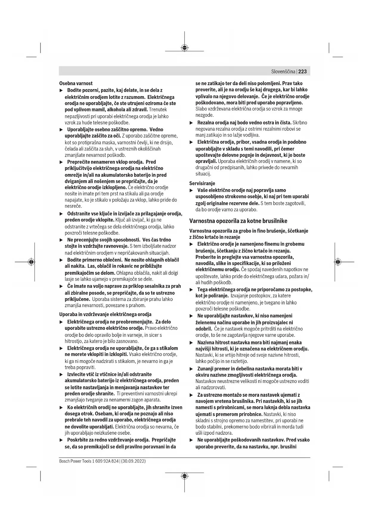 Raven tresljajev, podana v teh navodilih, je bila izmerjena v skladu s standardiziranim merilnim postopkom in se lahko uporablja za primerjavo električnih orodij med seboj. Primerna je tudi za začasno oceno obremenjenosti s tresljaji. Navedena raven tresljajev je določena na osnovi glavnega načina uporabe električnega orodja. Če se električno orodje uporablja v druge namene, z drugačnimi nastavki ali pri nezadostnem vzdrževanju, lahko raven tresljajev odstopa. To lahko obremenjenost s tresljaji v obdobju uporabe občutno poveča. Za natančnejšo oceno obremenjenosti s tresljaji morate upoštevati tudi čas, ko je orodje izklopljeno, in čas, ko orodje deluje, vendar dejansko ni v uporabi. To lahko obremenjenost s tresljaji v obdobju uporabe občutno zmanjša. Določite dodatne varnostne ukrepe za zaščito uporabnika pred vplivi tresljajev, npr. vzdrževanje električnega orodja in nastavkov, segrevanje rok, organizacija delovnih postopkov. Montaža Namestitev zaščitne opreme u Pred začetkom kakršnih koli del na električnem orodju izvlecite omrežni vtič iz vtičnice. Opomba: po lomu brusilnega koluta med obratovanjem ali pri poškodovanju prijemal na zaščitnem pokrovu/na električnem orodju, morate električno orodje takoj poslati na servsno službo; naslovi so navedeni v odstavku „Servisna služba in svetovanje uporabnikom“. Zaščitni pokrov za brušenje Zaščitni pokrov (6) namestite na steblo vretena. Položaj zaščitnega pokrova (6) prilagodite svojemu delu in pritrdite zaščitni pokrov (6) z nastavitvenim vijakom (7). u Nastavite zaščitni pokrov (6) tako, da se prepreči izmet isker v smer uporabnika. Zaščitni pokrov za rezanje u Pri rezanju z vezanimi brusilnimi sredstvi vedno uporabljajte zaščitni pokrov za rezanje (14). u Pri rezanju kamna morate poskrbeti za zadostno odsesavanje prahu. Zaščitni pokrov za rezanje (14) se namesti tako kot zaščitni pokrov za brušenje (6). Pokrov za odsesavanje za rezanje z vodili Za montažo odsesovalnega pokrova za rezanje z vodili(23) upoštevajte navodila za uporabo odsesovalnega pokrova. Dodatni ročaj u Svoje električno orodje uporabljajte zgolj z dodatnim ročajem (3). Dodatni ročaj (3) privijte glede na način izvajanja dela desno ali levo od glave gonila. Zaščita za roke u Za izvajanje dela z gumijastim brusilnim krožnikom (18) ali z lončasto ščetko/kolutno ščetko/lamelno brusilno ploščo montirajte vedno tudi zaščito za roke. (16). Zaščito za roke (16) pritrdite skupaj z dodatnim ročajem (3). Namestitev brusilnih pripomočkov u Pred začetkom kakršnih koli del na električnem orodju izvlecite omrežni vtič iz vtičnice. u Brusilnih in rezalnih plošč se ne dotikajte, dokler se ne ohladijo. Plošče se med delom močno segrejejo. Očistite brusilno vreteno (5) in vse dele, ki jih je treba montirati. Za vpenjanje in sprostitev brusilnih nastavkov pritisnite tipko za zaklep vretena (1), da pritrdite brusilno vreteno. u Tipko za zaklep vretena pritiskajte le, ko brusilno vreteno miruje. V nasprotnem primeru se lahko električno orodje poškoduje. Brusilna/rezalna plošča Bodite pozorni na dimenzije brusilnih nastavkov. Premer odprtine mora ustrezati prijemalni prirobnici. Ne uporabljajte adapterjev ali reducirnih obročev. Če uporabljate diamantne rezalne plošče, bodite pozorni, da se puščica smeri vrtenja na diamantni rezalni plošči in smer vrtenja električnega orodja (glejte puščico smeri vrtenja na glavi gonila) ujemata. Korake namestitve najdete na strani s shemami. Za pritrditev brusilne/rezalne plošče najprej namestite zatezno matico(10) in jo nato privijte s ključem za dve luknji (glejte „Hitrozatezna matica “, Stran228). u Po montaži brusilnega orodja pred vklopom preverite, ali je brusilno orodje pravilno montirano in ali se lahko prosto vrti. Poskrbite, da se brusilno orodje ne dotika zaščitnega pokrova ali drugih delov. V prijemalni prirobnici (8) je okrog centrirnega venca nameščen plastični del (tesnilni obroček). Če tesnilnega obročka ni ali pa je ta poškodovan, je treba pred nadaljnjo uporabo obvezno zamenjati prijemalno prirobnico (8). Lamelna brusilna plošča u Za delo z lamelno brusilno ploščo je treba vedno namestiti zaščito za roke (16). Gumijasti brusilni krožnik u Za delo z gumijastim brusilnim krožnikom (18) je treba vedno namestiti zaščito za roke (16). Vrstni red pri montaži je prikazan na strani z grafičnim prikazom. Pred montažo gumijastega brusilnega krožnika (18) namestite 2 distančni podložki (17) na brusilno vreteno (5). Bosch Power Tools 1 609 92A 824 | (30.09.2022)228 | Slovenščina Privijte okroglo matico (20) in jo zategnite s ključem za dve luknji. Lončasta ščetka/kolutna ščetka u Za delo z lončasto ščetko ali kolutno ščetko je treba vedno namestiti zaščito za roke (16). Vrstni red pri montaži je prikazan na strani z grafičnim prikazom. Lončasto ščetko/kolutno ščetko je treba priviti tako globoko na brusilno vreteno, da bo prirobnica brusilnega vretena na koncu navoja brusilnega vretena nameščena tesno ob nastavku. Zategnite lončasto ščetko/kolutno ščetko z viličastim ključem. Hitrozatezna matica Za preprosto menjavo brusilnega nastavka brez uporabe drugih orodij lahko namesto zatezne matice (10) uporabite hitrovpenjalno matico (12). u Hitrozatezna matica(12) se lahko uporablja zgolj z brusilnimi ali rezalnimi ploščami s premerom luknje 22,2mm. Uporabljajte le brezhibno, nepoškodovano hitrovpenjalno matico (12). Pri privijanju pazite na to, da stran z napisom na hitrovpenjalni matici (12) ne bo obrnjena proti brusilni plošči; puščica mora biti obrnjena proti indeksni oznaki (24). (24) Pritisnite tipko za blokado vretena (1) za blokado brusilnega vretena. Če želite hitrovpenjalno matico zategniti, privijte brusilno ploščo močno v desno. Ustrezno pritrjeno in nepoškodovano hitrovpenjalno matico lahko ročno odvijete z vrtenjem narebričenega obroča v levo. Zategnjene h