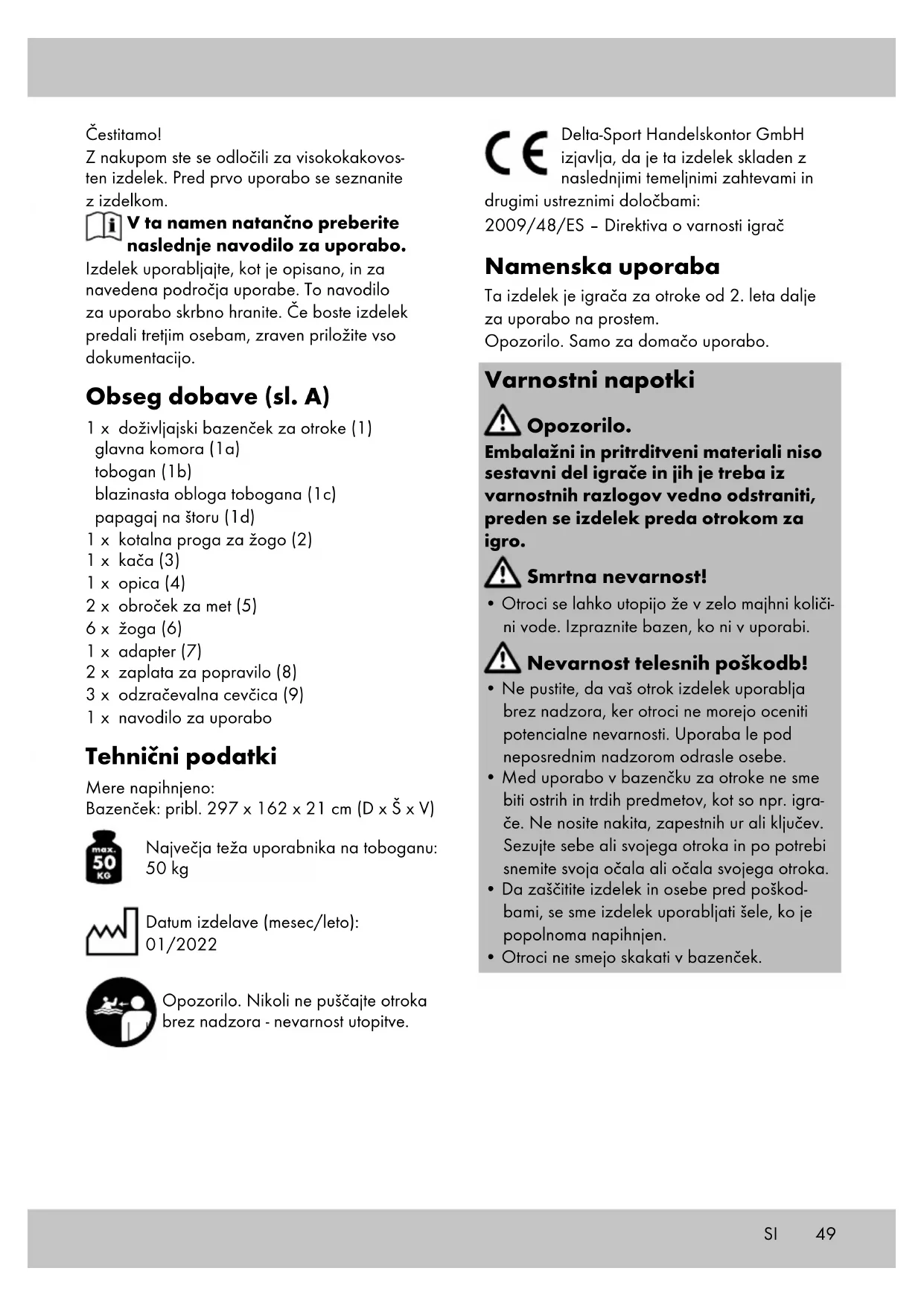 poškodovano področje in jo trdno pritisnite. Shranjevanje, čiščenje Vodo v izdelku pogosto zamenjajte, zlasti v vro- čem vremenu ali če je umazana! Če izdelka ne uporabljate, ga vedno nenapihnjenega shranite na suho, čisto mesto pri sobni temperaturi. Ventili morajo biti med shranjevanjem vedno zaprti. Čistite le z vodo ali milnico, nikoli z ostrimi čistil- nimi sredstvi. Pri shranjevanju za zimsko obdobje na izdelek ne postavljajte predmetov z ostrimi robovi in ne napudrajte ga s smukcem. Napotki za odlaganje v smeti Izdelek in embalažne materiale zavrzite v skladu z aktualnimi lokalnimi predpisi. Emba- lažni materiali, npr. folijske vrečke, ne sodijo v roke otrok. Embalažni material shranite otrokom nedosegljivo. Izdelke in embalažo odstranite okolju prijazno. Koda za recikliranje označuje različne materiale za vračanje v reciklirni krog. Vsebuje simbol za recikliranje, ki označu- je reciklirni krog, in številko, ki označuje material. Napotki za garancijo in izvajanje servisne storitve Izdelek je bil izdelan z veliko skrbnostjo in pod stalno kontrolo. DELTA-SPORT HANDELSKON- TOR GmbH zasebnim končnim kupcem od datuma nakupa (garancijskega obdobja) v skladu z naslednjimi določbami odobri triletno garancijo na to postavko. Garancija velja samo za napake v materialu in obdelavi. Garancija ne velja za dele, ki so podvrženi običajni obrabi in jih je zato treba šteti za obrabljive dele (npr. baterije), in za lomljive dele, kot so npr. stikala, akumulatorji ali deli iz stekla. Zahtevki iz te garancije so izključeni, če je bil izdelek uporabljen nepravilno ali pretirano ali če ni bil uporabljen v okviru predvidenega namena ali predvidenega obsega uporabe ali če niso bile upoštevane specifikacije v navodilih za uporabo, razen če končni kupec lahko dokaže, da gre za napako v materialu ali izdelavi, ki ne temelji na eni od zgoraj navedenih okoliščin. Garancijski zahtevki se lahko uveljavljajo le v garancijskem roku ob predložitvi originalnega računa. Zato originalni račun shranite. Garancij- ski čas se zaradi morebitnih popravil na podlagi garancije, zakonskega jamstva ali kulance ne podaljša. To velja tudi za zamenjane in popra- vljene dele. Pri morebitnih reklamacijah se najprej obrnite na spodaj navedeno servisno številko za nujne primere ali stopite z nami v stik po elektronski pošti. Če obstaja garancijski primer, vam bomo izdelek po naši izbiri brezplačno popravili, zamenjali ali pa vam bomo povrnili kupnino. Druge pravice iz garancije ne obstajajo. Ta garancija ne omejuje vaših zakonskih pravic, še posebej garancijskih zahtevkov do prodajalca. IAN: 385205_2107 Servis Slovenija Tel.: 080080917 E-Mail: deltasport@lidl.si53SI Garancijski list