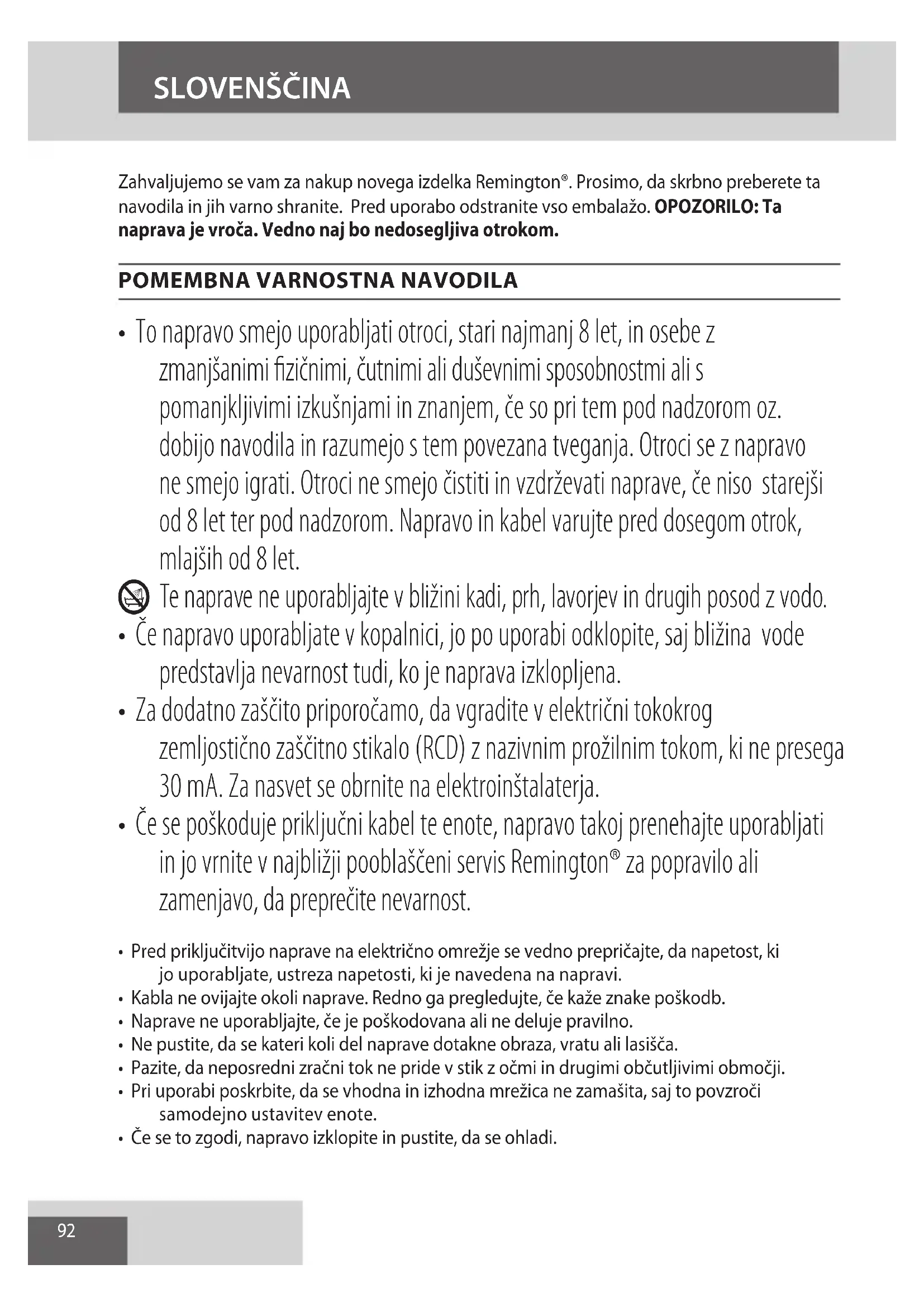 - Če se poškoduje priključni kabel te enote, napravo takoj prenehajte uporabljati in jo vrnite v najbližji pooblaščeni servis Remington® za popravilo ali zamenjavo, da preprečite nevarnost.