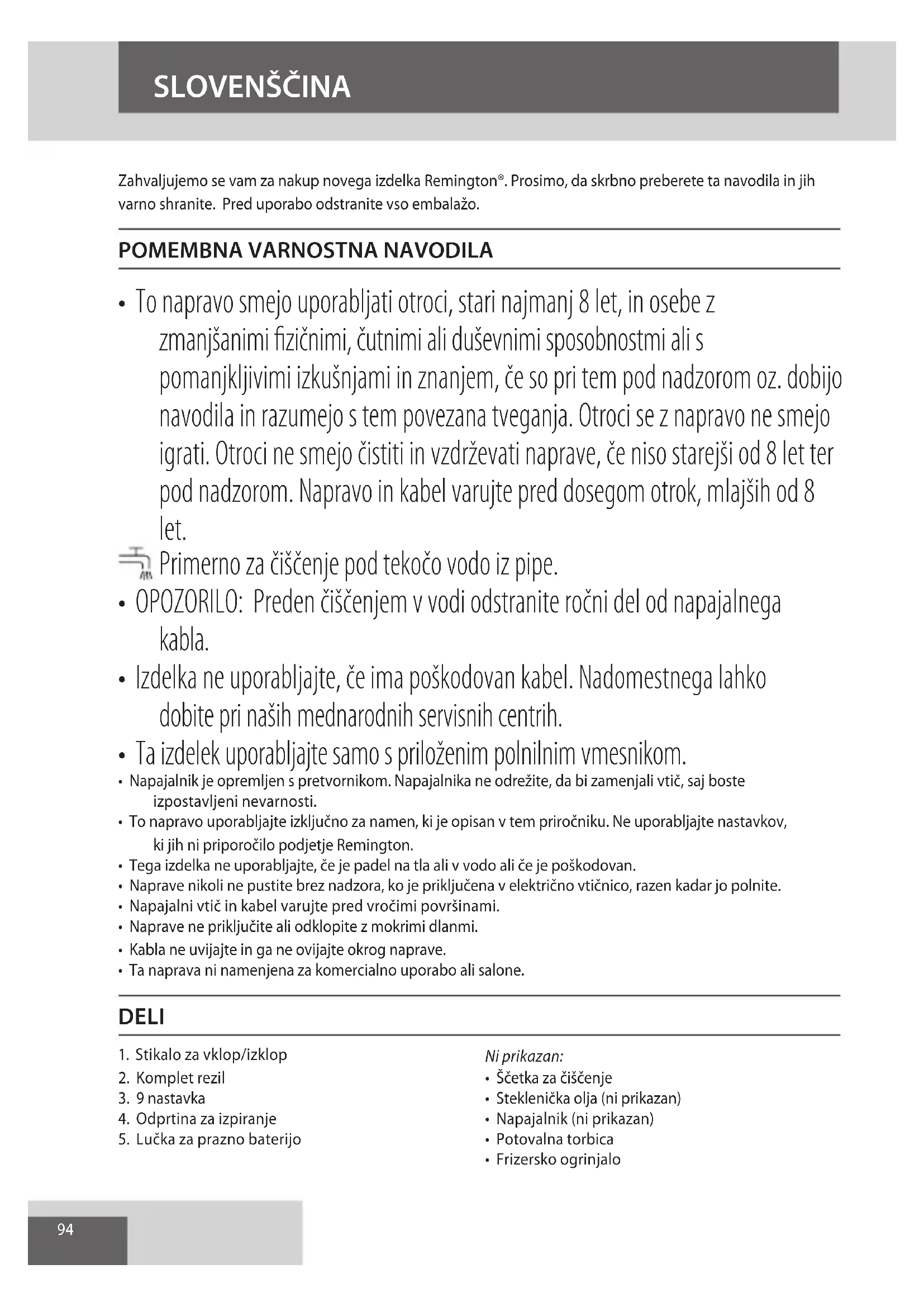 - To napravo uporabljajte izključno za namen, ki je opisan v tem priročniku. Ne uporabljajte nastavkov, ki jih ni priporočilo podjetje Remington.