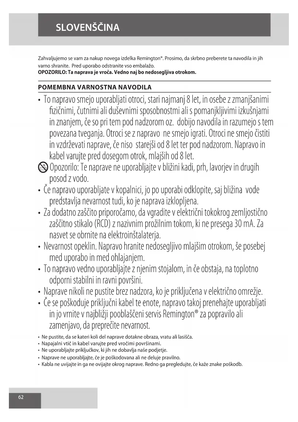 - Če se poškoduje priključni kabel te enote, napravo takoj prenehajte uporabljati in jo vrnite v najbližji pooblaščeni servis Remington® za popravilo ali zamenjavo, da preprečite nevarnost.