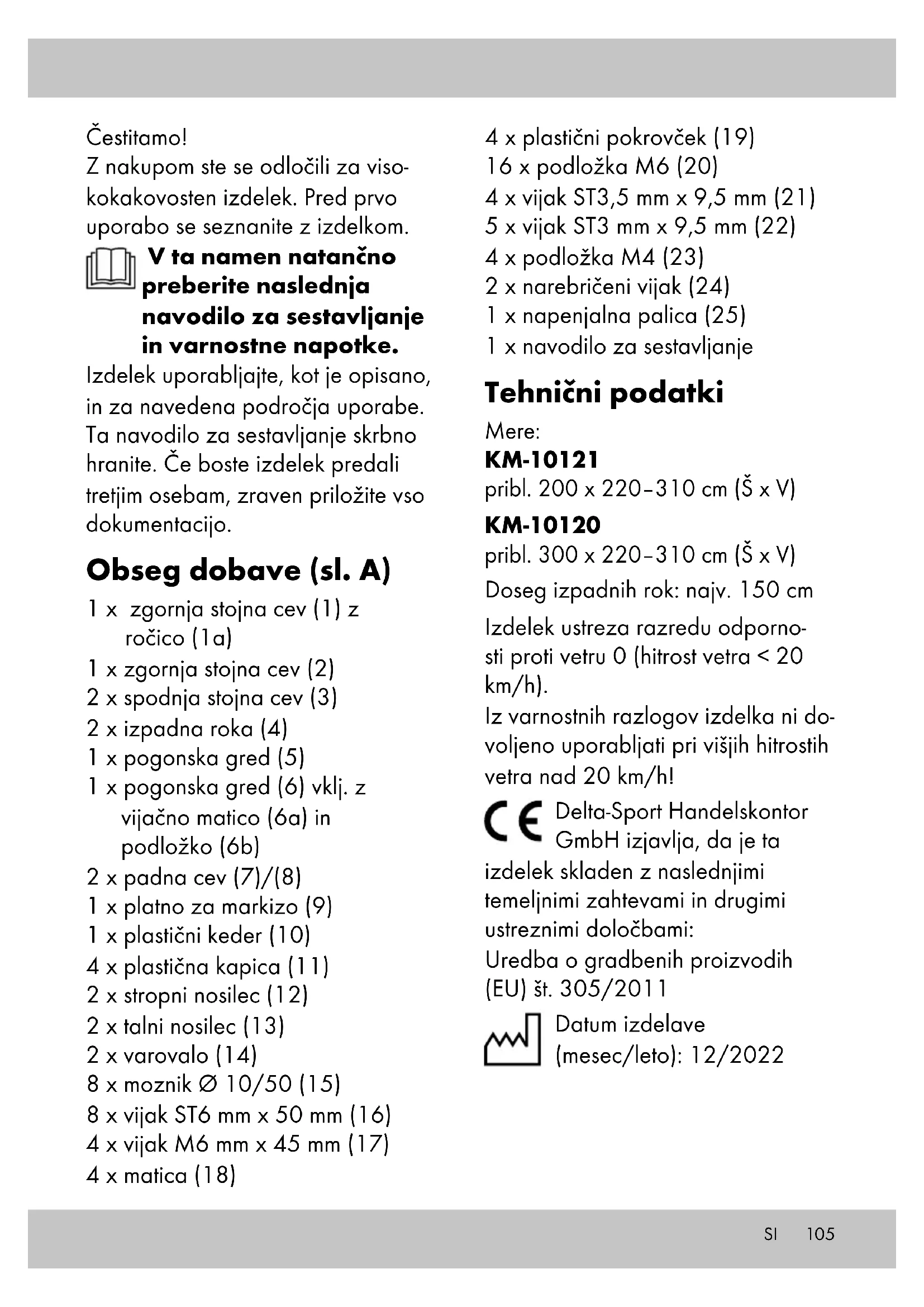 Čestitamo! Z nakupom ste se odločili za viso- kokakovosten izdelek. Pred prvo uporabo se seznanite z izdelkom. V ta namen natančno preberite naslednja navodilo za sestavljanje in varnostne napotke. Izdelek uporabljajte, kot je opisano, in za navedena področja uporabe. Ta navodilo za sestavljanje skrbno hranite. Če boste izdelek predali tretjim osebam, zraven priložite vso dokumentacijo. Obseg dobave (sl. A) 1 x zgornja stojna cev (1) z ročico (1a) 1 x zgornja stojna cev (2) 2 x spodnja stojna cev (3) 2 x izpadna roka (4) 1 x pogonska gred (5) 1 x pogonska gred (6) vklj. z vijačno matico (6a) in podložko (6b) 2 x padna cev (7)/(8) 1 x platno za markizo (9) 1 x plastični keder (10) 4 x plastična kapica (11) 2 x stropni nosilec (12) 2 x talni nosilec (13) 2 x varovalo (14) 8 x moznik Ø 10/50 (15) 8 x vijak ST6 mm x 50 mm (16) 4 x vijak M6 mm x 45 mm (17) 4 x matica (18) 4 x plastični pokrovček (19) 16 x podložka M6 (20) 4 x vijak ST3,5 mm x 9,5 mm (21) 5 x vijak ST3 mm x 9,5 mm (22) 4 x podložka M4 (23) 2 x narebričeni vijak (24) 1 x napenjalna palica (25) 1 x navodilo za sestavljanje Tehnični podatki Mere: KM-10121 pribl. 200 x 220–310 cm (Š x V) KM-10120 pribl. 300 x 220–310 cm (Š x V) Doseg izpadnih rok: najv. 150 cm Izdelek ustreza razredu odporno- sti proti vetru 0 (hitrost vetra < 20 km/h). Iz varnostnih razlogov izdelka ni do- voljeno uporabljati pri višjih hitrostih vetra nad 20 km/h! Delta-Sport Handelskontor GmbH izjavlja, da je ta izdelek skladen z naslednjimi temeljnimi zahtevami in drugimi ustreznimi določbami: Uredba o gradbenih proizvodih (EU) št. 305/2011 Datum izdelave (mesec/leto): 12/2022 SI106 Namenska uporaba Izdelek je zasnovan kot zaslon pred soncem za zunanje površine, kot je npr. balkon ali terasa, ter za za- sebno rabo. Izdelek ni namenjen za komercialno uporabo. Varnostni napotki Smrtna nevarnost!