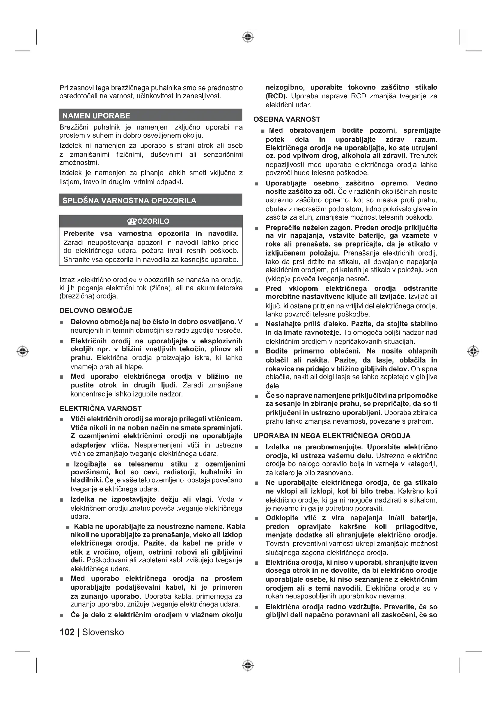■ Baterijo polnite le s polnilnikom, ki ga določa proizvajalec. Polnilnik, ki ustreza eni vrsti baterij, morda lahko povzroči požar, če z njim polnite drugo vrsto baterij. ■ Baterijska orodja uporabljajte samo s predpisano vrsto baterij. Uporaba katerih koli drugih baterij ustvari tveganje poškodb in požara. ■ Ko baterije ne uporabljajte, pazite, da bo odmaknjena od kovinskih predmetov, kot so papirne sponke, kovanci, ključi, žeblji, vijaki ali drugih majhni kovinski predmeti, ki bi lahko povzročili povezavo med obema terminaloma. Kratek stik zaradi povezanih terminalov baterije lahko povzroči opekline ali požar. ■ Ob zlorabi baterije lahko iz nje steče tekočina. Če se po nesreči dotaknete tekočine, mesto dotika sperite z vodo. Če pride tekočina v stik z očmi, poiščite zdravstveno pomoč. Tekočina, ki izteče iz baterije, lahko povzroči vnetje ali opekline. SERVISIRANJE ■ Električno orodje naj servisira usposobljena oseba, uporabljati pa sme le originalne nadomestne dele. To bo zagotovilo vzdrževanje varnostni električnega orodja. VARNOSTNA OPOZORILA ZA BREZŽIČNI PUHALNIK ■ V nekaterih regijah predpisi omejujejo uporabo izdelka na določene namene. Za nasvet se obrnite na lokalne oblasti ■ Nikoli ne dovolite otrokom, osebam z zmanjšanimi fizičnimi, senzoričnimi ali mentalnimi zmožnostmi ali osebam s pomanjkanjem izkušenj ali znanja ter osebam, ki niso seznanjene s temi navodili, da uporabljajo izdelek. Lokalni predpisi se morda nanašajo tudi na minimalno starost upravitelja. ■ Pomnite, da je upravitelj oz. uporabnik odgovoren za nesreče ali nevarnosti, ki se pripetijo ostalim ljudem ali njihovi lastnini. ■ Prisotni, otroci in živali naj bodo vsaj 15 m oddaljeni od delovnega območja. Ugasnite izdelek, če kdo vstopi v območje. ■ Med upravljanjem izdelka vedno nosite ustrezno obutev in dolge hlače. Naprave ne uporabljajte, če ste bosi ali nosite odprte sandale. Izogibajte se nošenju ohlapnih oblačil ali oblačil z odstopajočimi dodatki, saj se lahko ujamejo med premične dele. ■ Ne nosite ohlapnih oblačil ali nakita, ki bi se lahko ujel v dovod zraka. ■ Dolge lase si spnite nad rameni in tako preprečite njihovo ujetje v premikajoče se dele. ■ Med celotnim upravljanjem izdelka vedno nosite popolno zaščito za ušesa. Izdelek je izredno hrupen; če navodil glede omejevanja izpostavljenosti, zmanjševanja hrupa in nošenja zaščite za sluh ne upoštevate strogo, lahko pride do trajnih poškodb sluha. ■ Med celotnim upravljanjem tega izdelka vedno nosite popolno zaščito za oči. Proizvajalec močno priporoča ščitnik za celotni obraz in popolnoma zaprta očala. Navadna očala ali sončna očala niso zadostna zaščita. Močan zračni vrtinec lahko kadarkoli zelo hitro vrže predmete, ki se lahko od trde površine odbijejo proti uporabniku. ■ Pred vsako uporabo zagotovite, da vse kontrole in varnostne naprave delujejo pravilno. Orodja ne uporabljajte, če stikalo za izklop ne ustavi izdelka. ■ Pred vsako uporabo vedno preglejte, ali je ohišje morda poškodovano. Poskrbite, da bodo varovala in ročaji nameščeni in pravilno pritrjeni. ■ Nikoli ne upravljaje izdelka s poškodovanimi varovali ali zaščitami, brez varovalnih naprav kot na primer brez nameščenega zbiralca ostankov. ■ Poskrbite, da bodo odprtine za zračenje čiste. ■ Pred začetkom uporabe puhalnika material zrahljajte z grabljami in metlami. ■ Pred vsako uporabo temeljito očistite območje obratovanja. Odstranite vse predmete, kot so skale, razlomljeno steklo, žeblji, žice ali dele vrvi, ki bi med delovanjem lahko odleteli zaradi pihanega zraka ali ki bi se lahko zapletli v ventilator.