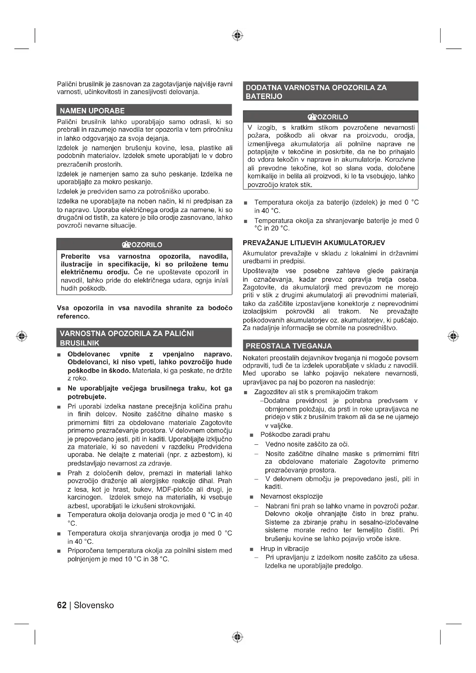 Akumulator prevažajte v skladu z lokalnimi in državnimi uredbami in predpisi. Upoštevajte vse posebne zahteve glede pakiranja in označevanja, kadar prevoz opravlja tretja oseba. Zagotovite, da akumulatorji med prevozom ne morejo priti v stik z drugimi akumulatorji ali prevodnimi materiali, tako da zaščitite izpostavljene konektorje z neprevodnimi izolacijskim pokrovčki ali trakom. Ne prevažajte poškodovanih akumulatorjev oz. akumulatorjev, ki puščajo. Za nadaljnje informacije se obrnite na posredništvo. PREOSTALA TVEGANJA Nekateri preostalih dejavnikov tveganja ni mogoče povsem odpraviti, tudi če ta izdelek uporabljate v skladu z navodili. Med uporabo se lahko pojavijo nekatere nevarnosti, upravljavec pa naj bo pozoren na naslednje: ■ Zagozditev ali stik s premikajočim trakom – Dodatna previdnost je potrebna predvsem v obrnjenem položaju, da prsti in roke upravljavca ne pridejo v stik z brusilnim trakom ali da se ne ujamejo v valjčke. ■ Poškodbe zaradi prahu – Vedno nosite zaščito za oči. – Nosite zaščitne dihalne maske s primernimi filtri za obdelovane materiale Zagotovite primerno prezračevanje prostora. – V delovnem območju je prepovedano jesti, piti in kaditi. ■ Nevarnost eksplozije – Nabrani fini prah se lahko vname in povzroči požar. Delovno okolje ohranjajte čisto in brez prahu. Sisteme za zbiranje prahu in sesalno-izločevalne sisteme morate redno ter temeljito čistiti. Pri brušenju kovine se lahko pojavijo vroče iskre. ■ Hrup in vibracije – Pri upravljanju z izdelkom nosite zaščito za ušesa. Izdelka ne uporabljajte predolgo.63 Slovensko |