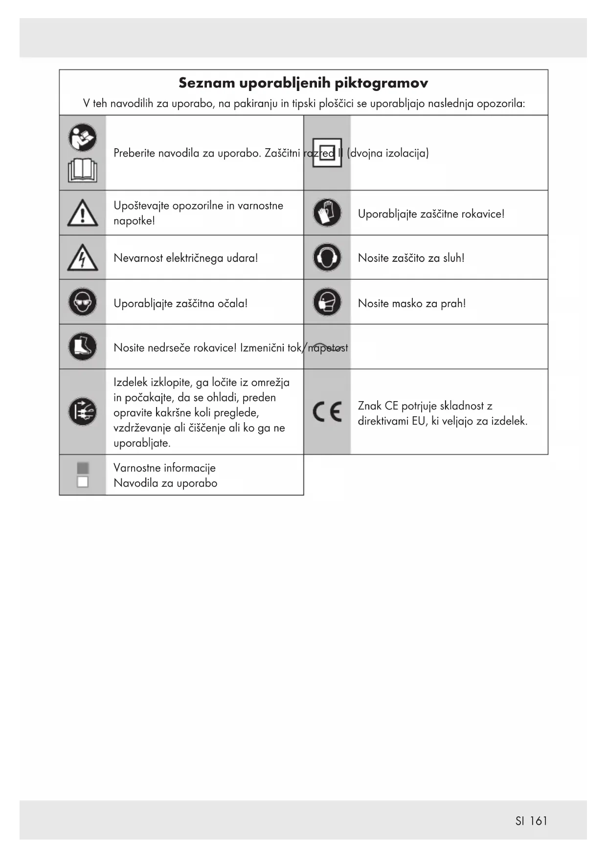 Seznam uporabljenih piktogramov V teh navodilih za uporabo, na pakiranju in tipski ploščici se uporabljajo naslednja opozorila: Preberite navodila za uporabo. Zaščitni razred II (dvojna izolacija) Upoštevajte opozorilne in varnostne napotke! Uporabljajte zaščitne rokavice! Nevarnost električnega udara!