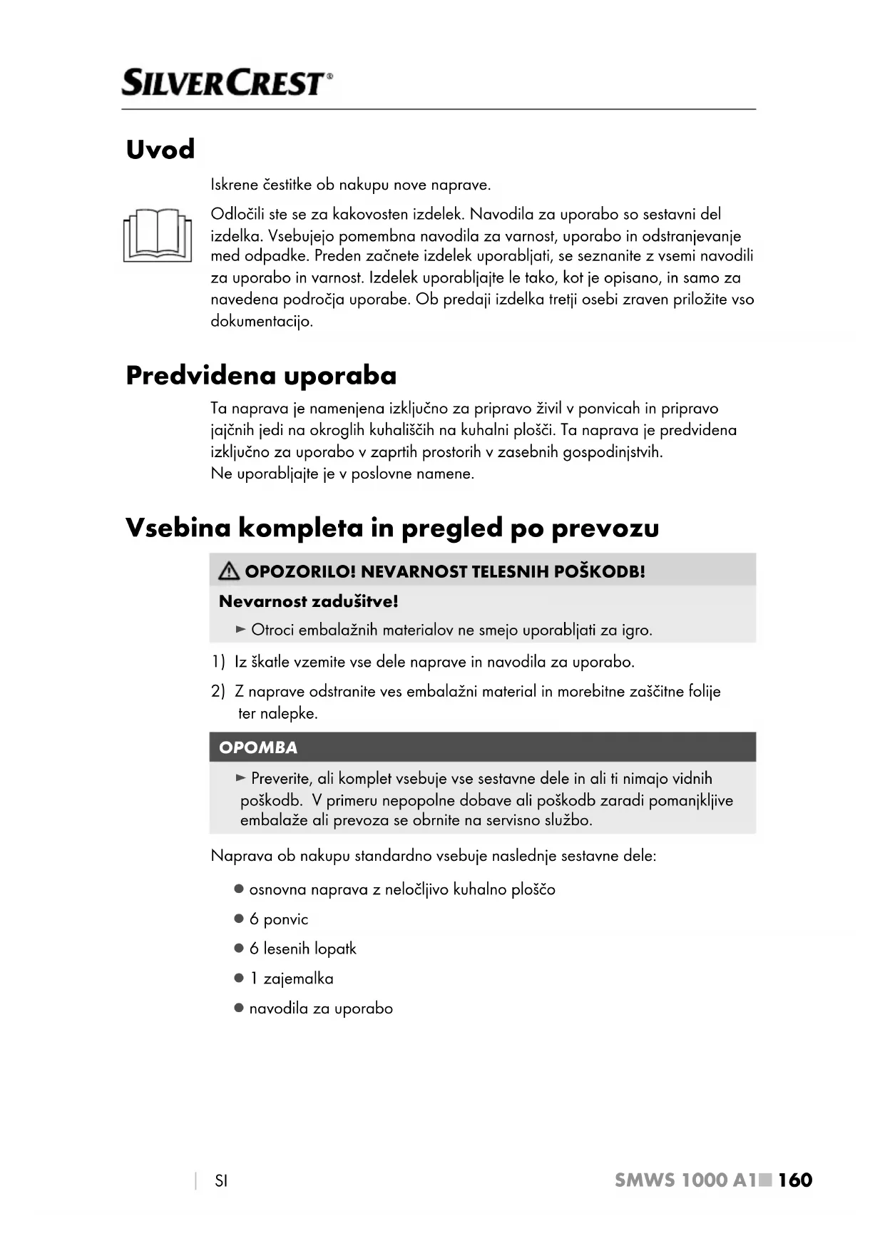 SI Uvod Iskrene čestitke ob nakupu nove naprave. Odločili ste se za kakovosten izdelek. Navodila za uporabo so sestavni del izdelka. Vsebujejo pomembna navodila za varnost, uporabo in odstranjevanje med odpadke. Preden začnete izdelek uporabljati, se seznanite z vsemi navodili za uporabo in varnost. Izdelek uporabljajte le tako, kot je opisano, in samo za navedena področja uporabe. Ob predaji izdelka tretji osebi zraven priložite vso dokumentacijo. Predvidena uporaba Ta naprava je namenjena izključno za pripravo živil v ponvicah in pripravo jajčnih jedi na okroglih kuhališčih na kuhalni plošči. Ta naprava je predvidena izključno za uporabo v zaprtih prostorih v zasebnih gospodinjstvih. Ne uporabljajte je v poslovne namene. Vsebina kompleta in pregled po prevozu OPOZORILO! NEVARNOST TELESNIH POŠKODB! Nevarnost zadušitve! ► Otroci embalažnih materialov ne smejo uporabljati za igro.