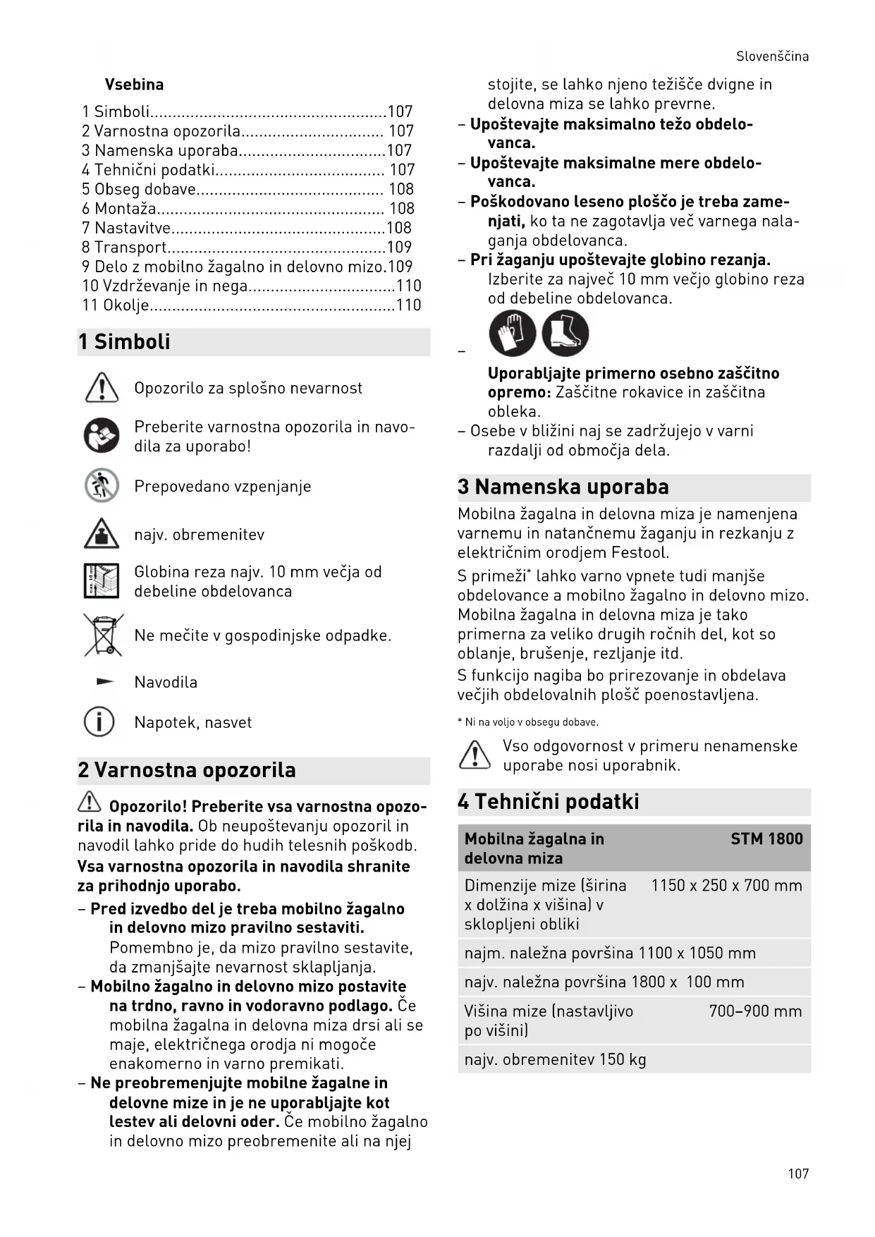 Uporabljajte primerno osebno zaščitno opremo: Zaščitne rokavice in zaščitna obleka. – Osebe v bližini naj se zadržujejo v varni razdalji od območja dela. 3 Namenska uporaba Mobilna žagalna in delovna miza je namenjena varnemu in natančnemu žaganju in rezkanju z električnim orodjem Festool. S primeži