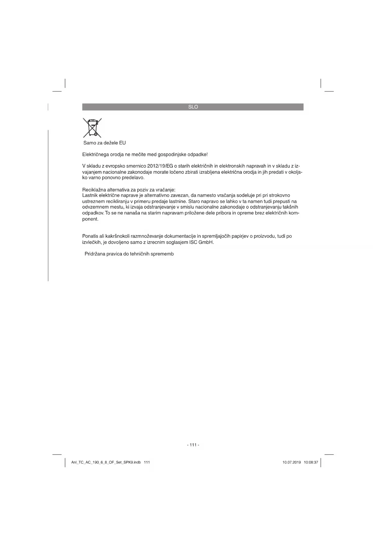 Samo za dežele EU Električnega orodja ne mečite med gospodinjske odpadke! V skladu z evropsko smernico 2012/19/EG o starih električnih in elektronskih napravah in v skladu z iz- vajanjem nacionalne zakonodaje morate ločeno zbirati izrabljena električna orodja in jih predati v okoljs- ko varno ponovno predelavo. Reciklažna alternativa za poziv za vračanje: Lastnik električne naprave je alternativno zavezan, da namesto vračanja sodeluje pri pri strokovno ustreznem recikliranju v primeru predaje lastnine. Staro napravo se lahko v ta namen tudi prepusti na odvzemnem mestu, ki izvaja odstranjevanje v smislu nacionalne zakonodaje o odstranjevanju takšnih odpadkov. To se ne nanaša na starim napravam priložene dele pribora in opreme brez električnih kom- ponent. Ponatis ali kakršnokoli razmnoževanje dokumentacije in spremljajočih papirjev o proizvodu, tudi po izvlečkih, je dovoljeno samo z izrecnim soglasjem ISC GmbH. Pridržana pravica do tehničnih sprememb Anl_TC_AC_190_6_8_OF_Set_SPK9.indb 111Anl_TC_AC_190_6_8_OF_Set_SPK9.indb 111 10.07.2019 10:08:3710.07.2019 10:08:37SLO