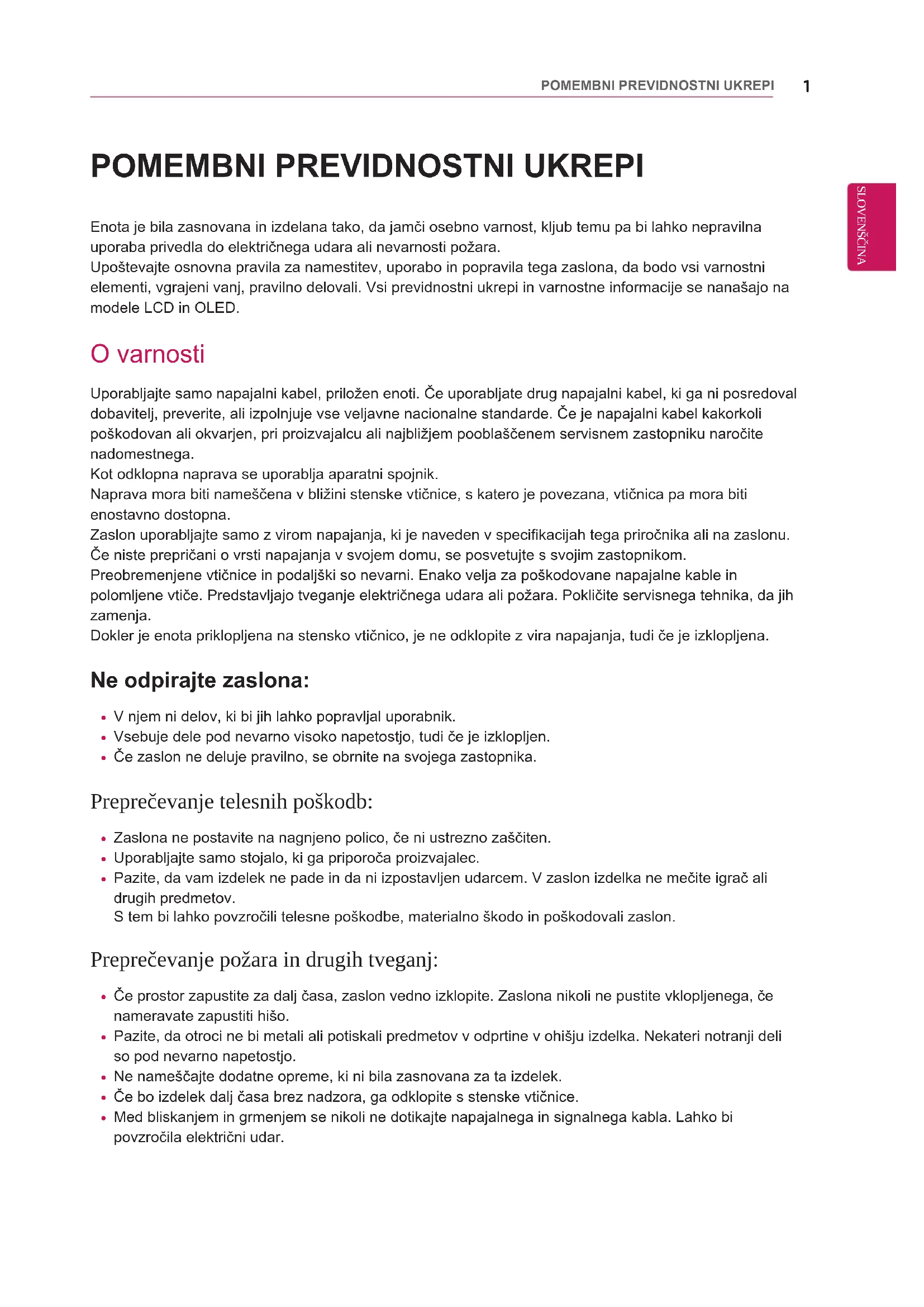 Enota je bila zasnovana in izdelana tako, da jamči osebno varnost, kljub temu pa bi lahko nepravilna uporaba privedla do električnega udara ali nevarnosti požara.Upoštevajte osnovna pravila za namestitev, uporabo in popravila tega zaslona, da bodo vsi varnostni elementi, vgrajeni vanj, pravilno delovali. Vsi previdnostni ukrepi in varnostne informacije se nanašajo na modele LCD in OLED. O varnosti Uporabljajte samo napajalni kabel, priložen enoti. Če uporabljate drug napajalni kabel, ki ga ni posredoval dobavitelj, preverite, ali izpolnjuje vse veljavne nacionalne standarde. Če je napajalni kabel kakorkoli poškodovan ali okvarjen, pri proizvajalcu ali najbližjem pooblaščenem servisnem zastopniku naročite nadomestnega.Kot odklopna naprava se uporablja aparatni spojnik. Naprava mora biti nameščena v bližini stenske vtičnice, s katero je povezana, vtičnica pa mora biti enostavno dostopna.Zaslon uporabljajte samo z virom napajanja, ki je naveden v specifikacijah tega priročnika ali na zaslonu.Če niste prepričani o vrsti napajanja v svojem domu, se posvetujte s svojim zastopnikom.Preobremenjene vtičnice in podaljški so nevarni. Enako velja za poškodovane napajalne kable in polomljene vtiče. Predstavljajo tveganje električnega udara ali požara. Pokličite servisnega tehnika, da jih zamenja.Dokler je enota priklopljena na stensko vtičnico, je ne odklopite z vira napajanja, tudi če je izklopljena. Ne odpirajte zaslona: