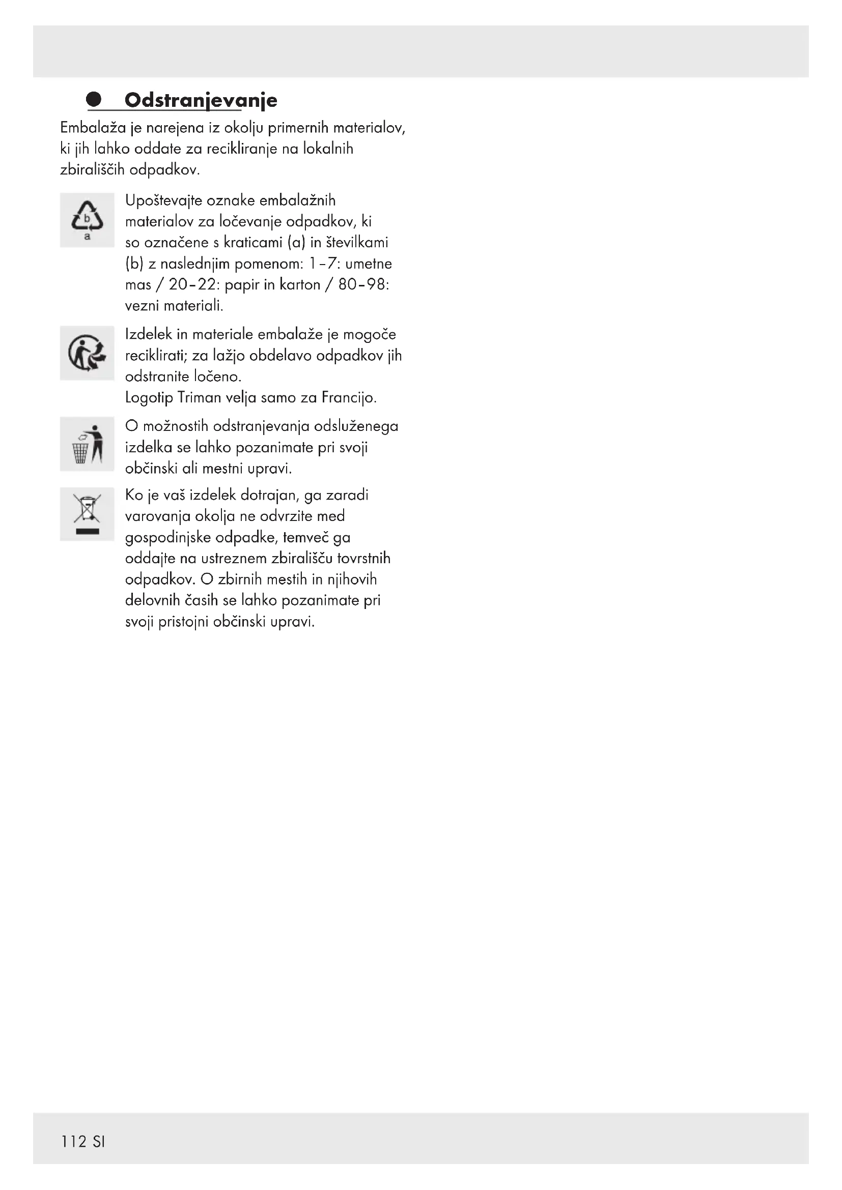 Odstranjevanje Embalaža je narejena iz okolju primernih materialov, ki jih lahko oddate za recikliranje na lokalnih zbirališčih odpadkov. Upoštevajte oznake embalažnih materialov za ločevanje odpadkov, ki so označene s kraticami (a) in številkami (b) z naslednjim pomenom: 1–7: umetne mas / 20–22: papir in karton / 80–98: vezni materiali. Izdelek in materiale embalaže je mogoče reciklirati; za lažjo obdelavo odpadkov jih odstranite ločeno. Logotip Triman velja samo za Francijo. O možnostih odstranjevanja odsluženega izdelka se lahko pozanimate pri svoji občinski ali mestni upravi. Ko je vaš izdelek dotrajan, ga zaradi varovanja okolja ne odvrzite med gospodinjske odpadke, temveč ga oddajte na ustreznem zbirališču tovrstnih odpadkov. O zbirnih mestih in njihovih delovnih časih se lahko pozanimate pri svoji pristojni občinski upravi.113