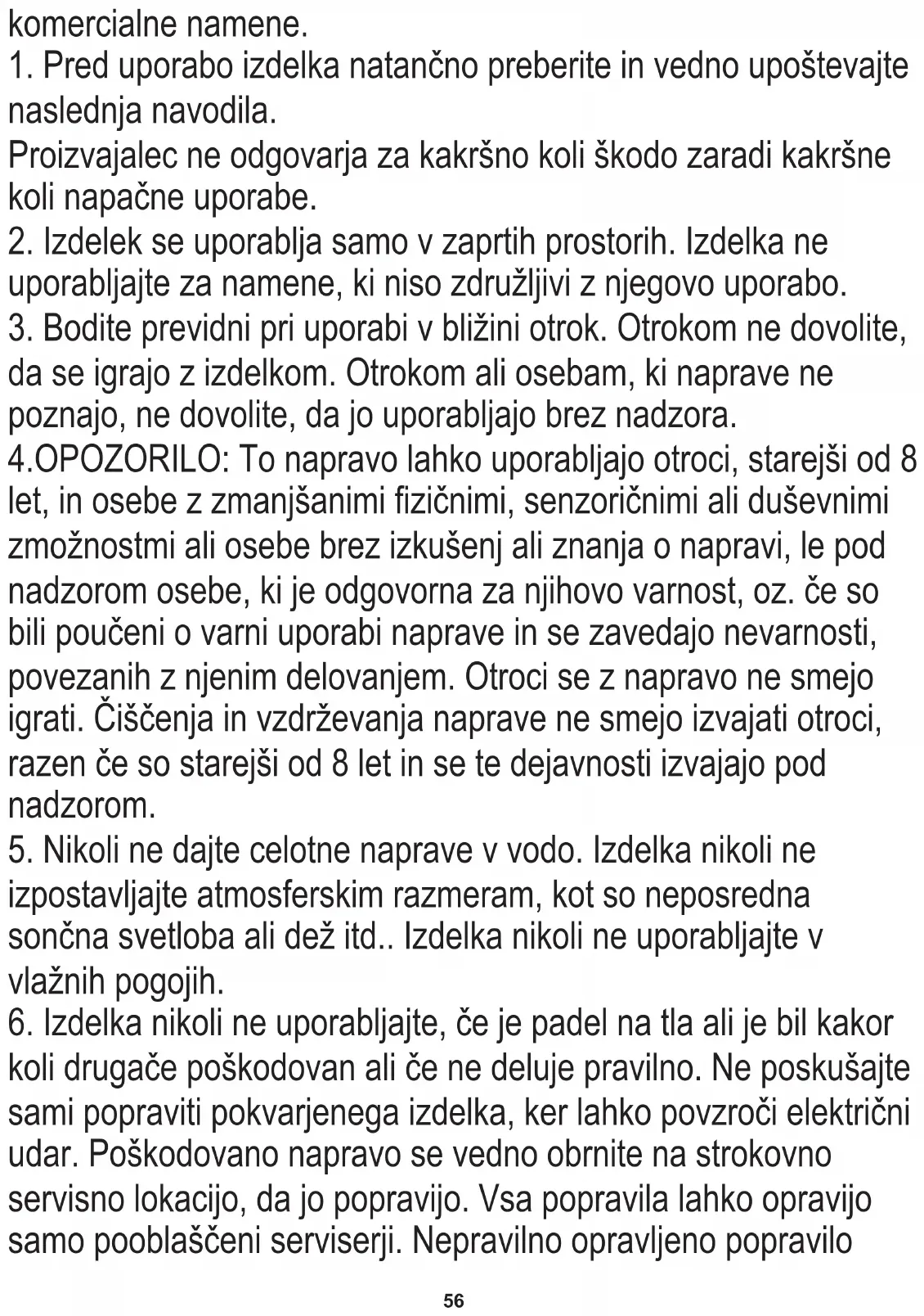 uporabljajte za namene, ki niso združljivi z njegovo uporabo. 4.OPOZORILO: To napravo lahko uporabljajo otroci, starejši od 8 let, in osebe z zmanjšanimi fizičnimi, senzoričnimi ali duševnimi zmožnostmi ali osebe brez izkušenj ali znanja o napravi, le pod nadzorom osebe, ki je odgovorna za njihovo varnost, oz. če so bili poučeni o varni uporabi naprave in se zavedajo nevarnosti, povezanih z njenim delovanjem. Otroci se z napravo ne smejo igrati. Čiščenja in vzdrževanja naprave ne smejo izvajati otroci, razen če so starejši od 8 let in se te dejavnosti izvajajo pod nadzorom.57