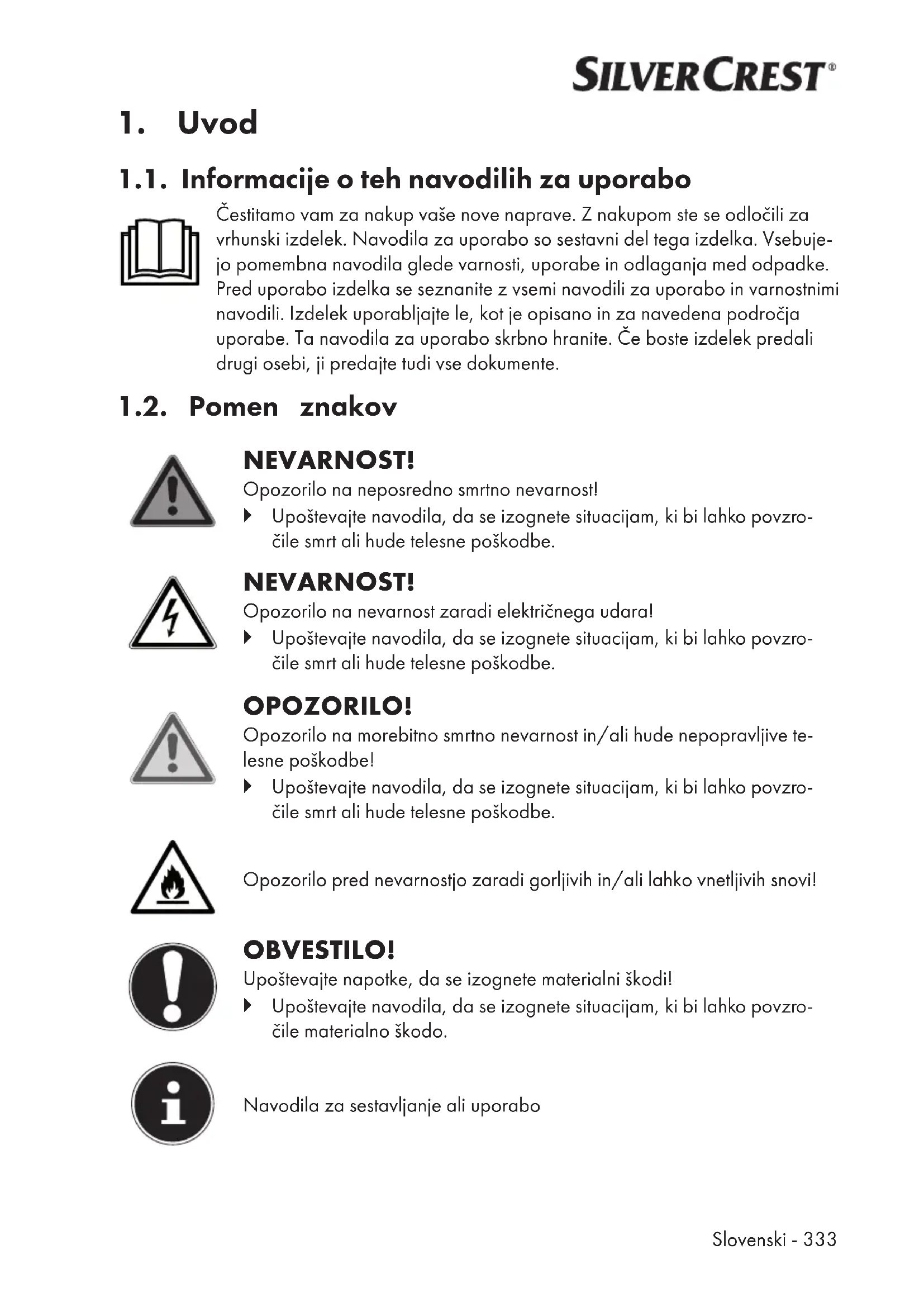 1.1. Informacije o teh navodilih za uporabo Čestitamo vam za nakup vaše nove naprave. Z nakupom ste se odločili za vrhunski izdelek. Navodila za uporabo so sestavni del tega izdelka. Vsebuje- jo pomembna navodila glede varnosti, uporabe in odlaganja med odpadke. Pred uporabo izdelka se seznanite z vsemi navodili za uporabo in varnostnimi navodili. Izdelek uporabljajte le, kot je opisano in za navedena področja uporabe. Ta navodila za uporabo skrbno hranite. Če boste izdelek predali drugi osebi, ji predajte tudi vse dokumente. 1.2. Pomen znakov NEVARNOST! Opozorilo na neposredno smrtno nevarnost! Upoštevajte navodila, da se izognete situacijam, ki bi lahko povzro- čile smrt ali hude telesne poškodbe. NEVARNOST! Opozorilo na nevarnost zaradi električnega udara! Upoštevajte navodila, da se izognete situacijam, ki bi lahko povzro- čile smrt ali hude telesne poškodbe. OPOZORILO! Opozorilo na morebitno smrtno nevarnost in/ali hude nepopravljive te- lesne poškodbe! Upoštevajte navodila, da se izognete situacijam, ki bi lahko povzro- čile smrt ali hude telesne poškodbe. Opozorilo pred nevarnostjo zaradi gorljivih in/ali lahko vnetljivih snovi! OBVESTILO! Upoštevajte napotke, da se izognete materialni škodi! Upoštevajte navodila, da se izognete situacijam, ki bi lahko povzro- čile materialno škodo. Navodila za sestavljanje ali uporabo334 - Slovenski Upoštevajte obvestila v navodilih za uporabo! Izmenična napetost