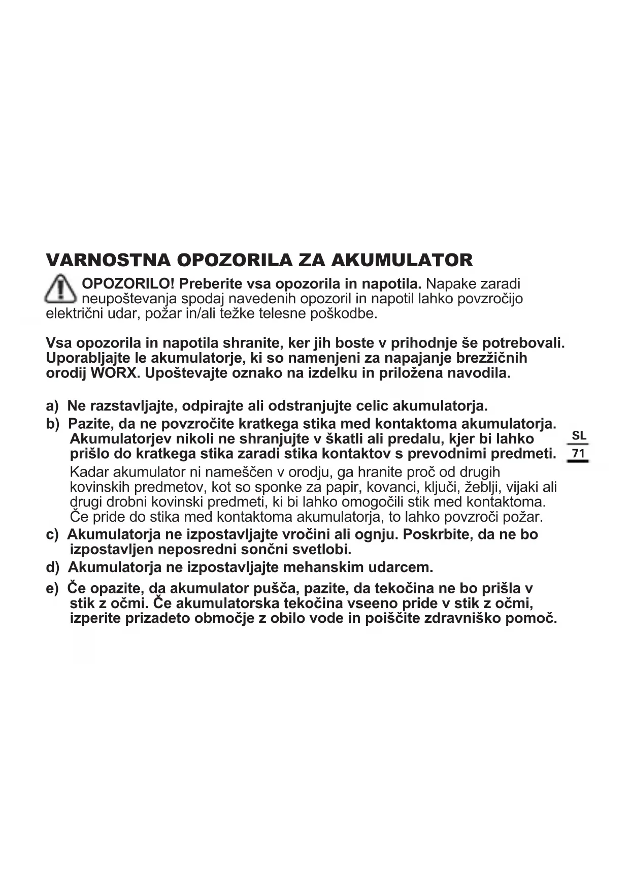 OPOZORILO! Preberite vsa opozorila in napotila. Napake zaradi neupoštevanja spodaj navedenih opozoril in napotil lahko povzročijo električni udar, požar in/ali težke telesne poškodbe. Vsa opozorila in napotila shranite, ker jih boste v prihodnje še potrebovali. Uporabljajte le akumulatorje, ki so namenjeni za napajanje brezžičnih orodij WORX. Upoštevajte oznako na izdelku in priložena navodila. a) Ne razstavljajte, odpirajte ali odstranjujte celic akumulatorja. b) Pazite, da ne povzročite kratkega stika med kontaktoma akumulatorja. Akumulatorjev nikoli ne shranjujte v škatli ali predalu, kjer bi lahko prišlo do kratkega stika zaradi stika kontaktov s prevodnimi predmeti. Kadar akumulator ni nameščen v orodju, ga hranite proč od drugih kovinskih predmetov, kot so sponke za papir, kovanci, ključi, žeblji, vijaki ali drugi drobni kovinski predmeti, ki bi lahko omogočili stik med kontaktoma. Če pride do stika med kontaktoma akumulatorja, to lahko povzroči požar. c) Akumulatorja ne izpostavljajte vročini ali ognju. Poskrbite, da ne bo izpostavljen neposredni sončni svetlobi. d) Akumulatorja ne izpostavljajte mehanskim udarcem. e) Če opazite, da akumulator pušča, pazite, da tekočina ne bo prišla v stik z očmi. Če akumulatorska tekočina vseeno pride v stik z očmi, izperite prizadeto območje z obilo vode in poiščite zdravniško pomoč.72
