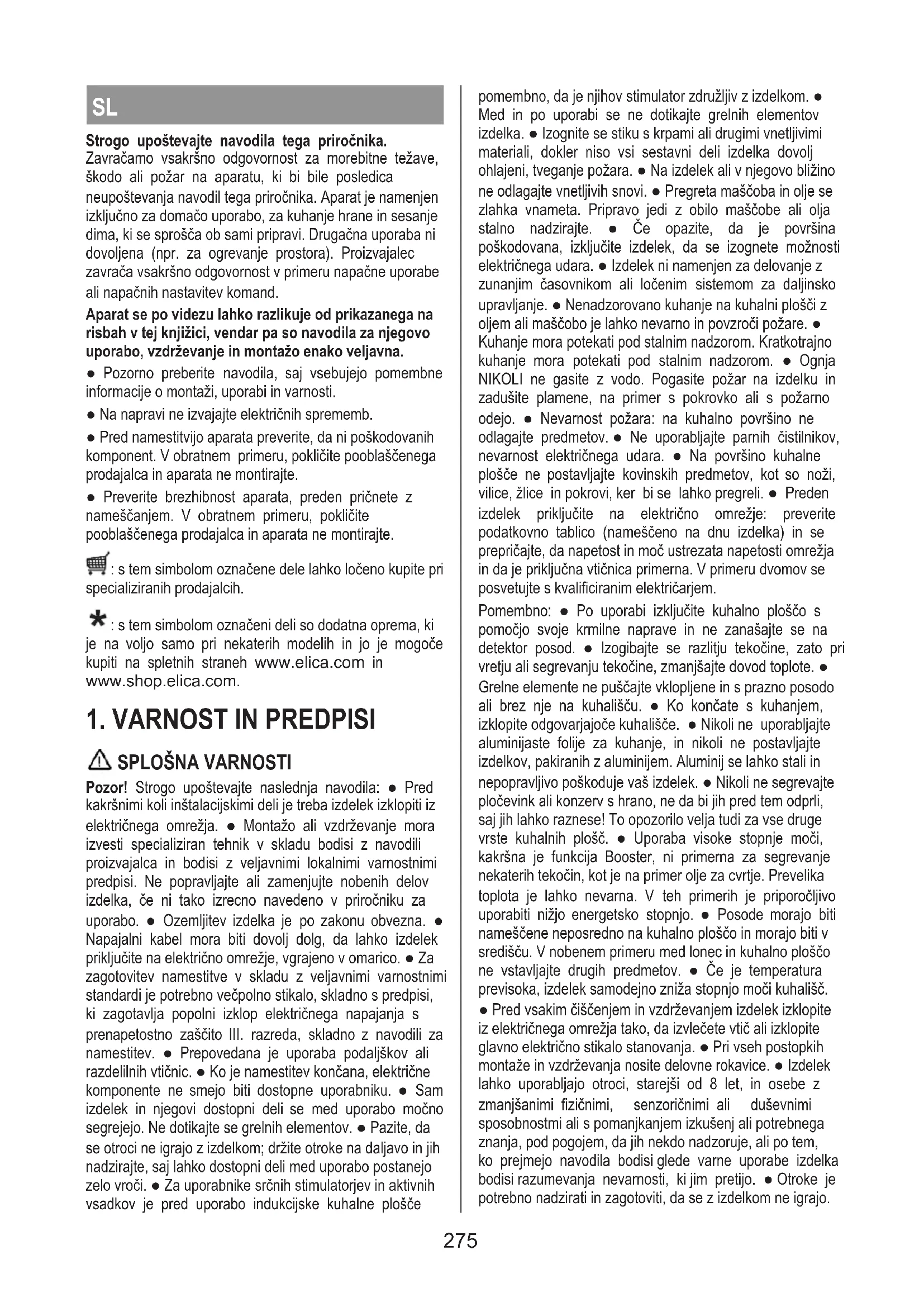 Pozor! Strogo upoštevajte naslednja navodila: ● Pred kakršnimi koli inštalacijskimi deli je treba izdelek izklopiti iz električnega omrežja. ● Montažo ali vzdrževanje mora izvesti specializiran tehnik v skladu bodisi z navodili proizvajalca in bodisi z veljavnimi lokalnimi varnostnimi predpisi. Ne popravljajte ali zamenjujte nobenih delov izdelka, če ni tako izrecno navedeno v priročniku za uporabo. ● Ozemljitev izdelka je po zakonu obvezna. ● Napajalni kabel mora biti dovolj dolg, da lahko izdelek priključite na električno omrežje, vgrajeno v omarico. ● Za zagotovitev namestitve v skladu z veljavnimi varnostnimi standardi je potrebno večpolno stikalo, skladno s predpisi, ki zagotavlja popolni izklop električnega napajanja s prenapetostno zaščito III. razreda, skladno z navodili za namestitev. ● Prepovedana je uporaba podaljškov ali razdelilnih vtičnic. ● Ko je namestitev končana, električne komponente ne smejo biti dostopne uporabniku. ● Sam izdelek in njegovi dostopni deli se med uporabo močno segrejejo. Ne dotikajte se grelnih elementov. ● Pazite, da se otroci ne igrajo z izdelkom; držite otroke na daljavo in jih nadzirajte, saj lahko dostopni deli med uporabo postanejo zelo vroči. ● Za uporabnike srčnih stimulatorjev in aktivnih vsadkov je pred uporabo indukcijske kuhalne plošče pomembno, da je njihov stimulator združljiv z izdelkom. ● Med in po uporabi se ne dotikajte grelnih elementov izdelka. ● Izognite se stiku s krpami ali drugimi vnetljivimi materiali, dokler niso vsi sestavni deli izdelka dovolj ohlajeni, tveganje požara. ● Na izdelek ali v njegovo bližino ne odlagajte vnetljivih snovi. ● Pregreta maščoba in olje se zlahka vnameta. Pripravo jedi z obilo maščobe ali olja stalno nadzirajte. ● Če opazite, da je površina poškodovana, izključite izdelek, da se izognete možnosti električnega udara. ● Izdelek ni namenjen za delovanje z zunanjim časovnikom ali ločenim sistemom za daljinsko upravljanje. ● Nenadzorovano kuhanje na kuhalni plošči z oljem ali maščobo je lahko nevarno in povzroči požare. ● Kuhanje mora potekati pod stalnim nadzorom. Kratkotrajno kuhanje mora potekati pod stalnim nadzorom. ● Ognja NIKOLI ne gasite z vodo. Pogasite požar na izdelku in zadušite plamene, na primer s pokrovko ali s požarno odejo. ● Nevarnost požara: na kuhalno površino ne odlagajte predmetov. ● Ne uporabljajte parnih čistilnikov, nevarnost električnega udara. ● Na površino kuhalne plošče ne postavljajte kovinskih predmetov, kot so noži, vilice, žlice in pokrovi, ker bi se lahko pregreli. ● Preden izdelek priključite na električno omrežje: preverite podatkovno tablico (nameščeno na dnu izdelka) in se prepričajte, da napetost in moč ustrezata napetosti omrežja in da je priključna vtičnica primerna. V primeru dvomov se posvetujte s kvalificiranim električarjem. Pomembno: ● Po uporabi izključite kuhalno ploščo s pomočjo svoje krmilne naprave in ne zanašajte se na detektor posod. ● Izogibajte se razlitju tekočine, zato pri vretju ali segrevanju tekočine, zmanjšajte dovod toplote. ● Grelne elemente ne puščajte vklopljene in s prazno posodo ali brez nje na kuhališču. ● Ko končate s kuhanjem, izklopite odgovarjajoče kuhališče. ● Nikoli ne uporabljajte aluminijaste folije za kuhanje, in nikoli ne postavljajte izdelkov, pakiranih z aluminijem. Aluminij se lahko stali in nepopravljivo poškoduje vaš izdelek. ● Nikoli ne segrevajte pločevink ali konzerv s hrano, ne da bi jih pred tem odprli, saj jih lahko raznese! To opozorilo velja tudi za vse druge vrste kuhalnih plošč. ● Uporaba visoke stopnje moči, kakršna je funkcija Booster, ni primerna za segrevanje nekaterih tekočin, kot je na primer olje za cvrtje. Prevelika toplota je lahko nevarna. V teh primerih je priporočljivo uporabiti nižjo energetsko stopnjo. ● Posode morajo biti nameščene neposredno na kuhalno ploščo in morajo biti v središču. V nobenem primeru med lonec in kuhalno ploščo ne vstavljajte drugih predmetov. ● Če je temperatura previsoka, izdelek samodejno zniža stopnjo moči kuhališč. ● Pred vsakim čiščenjem in vzdrževanjem izdelek izklopite iz električnega omrežja tako, da izvlečete vtič ali izklopite glavno električno stikalo stanovanja. ● Pri vseh postopkih montaže in vzdrževanja nosite delovne rokavice. ● Izdelek lahko uporabljajo otroci, starejši od 8 let, in osebe z zmanjšanimi fizičnimi, senzoričnimi ali duševnimi sposobnostmi ali s pomanjkanjem izkušenj ali potrebnega znanja, pod pogojem, da jih nekdo nadzoruje, ali po tem, ko prejmejo navodila bodisi glede varne uporabe izdelka bodisi razumevanja nevarnosti, ki jim pretijo. ● Otroke je potrebno nadzirati in zagotoviti, da se z izdelkom ne igrajo.
