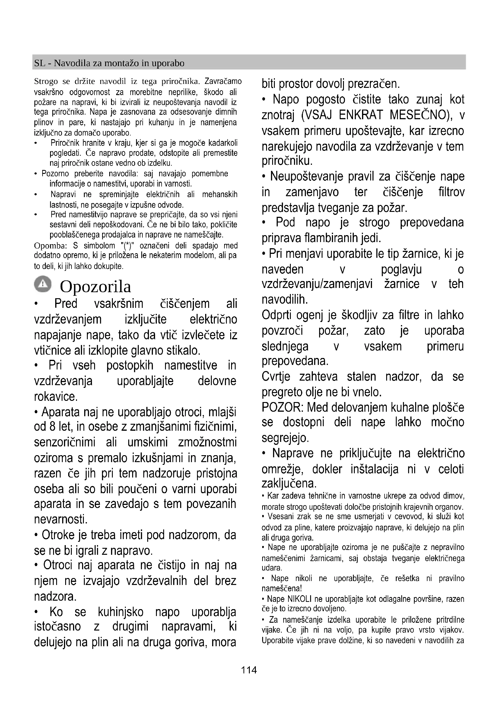 - Ko se kuhinjsko napo uporablja istočasno z drugimi napravami, ki delujejo na plin ali na druga goriva, mora biti prostor dovolj prezračen.