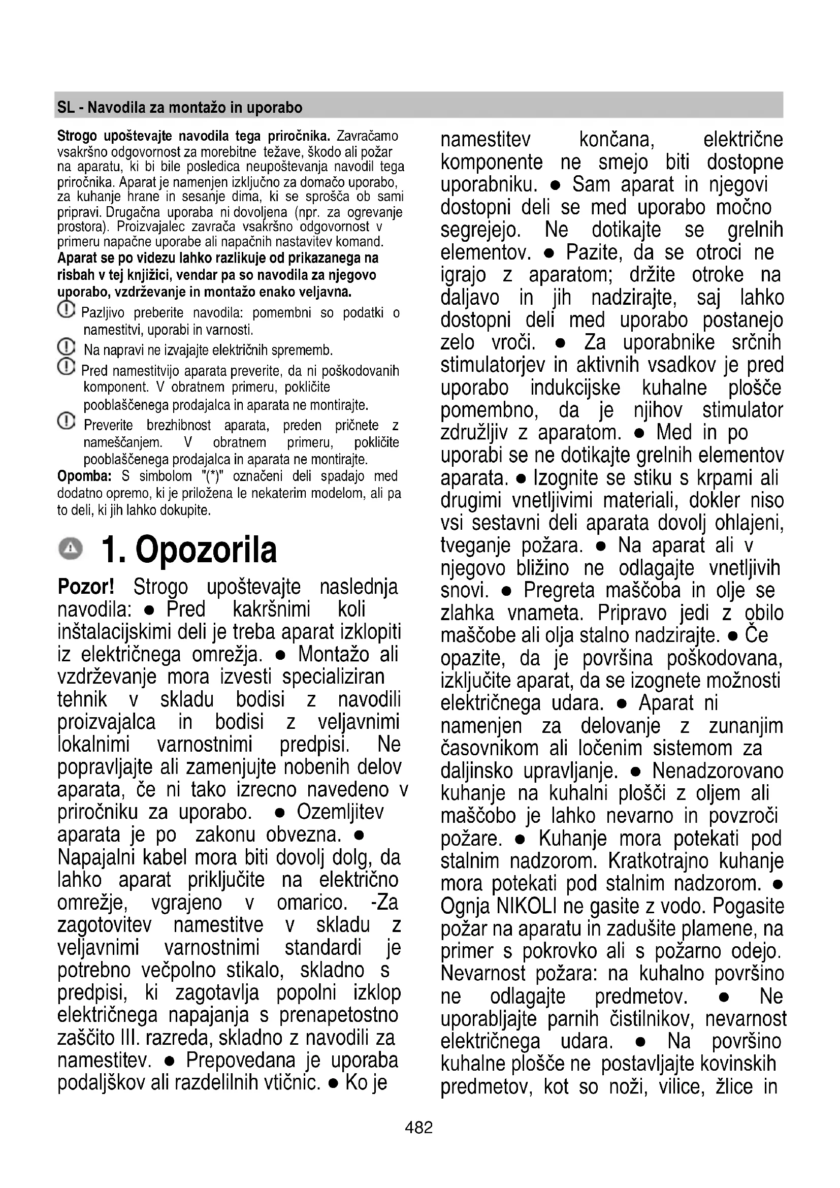 Pozor! Strogo upoštevajte naslednja navodila: ● Pred kakršnimi koli inštalacijskimi deli je treba aparat izklopiti iz električnega omrežja. ● Montažo ali vzdrževanje mora izvesti specializiran tehnik v skladu bodisi z navodili proizvajalca in bodisi z veljavnimi lokalnimi varnostnimi predpisi. Ne popravljajte ali zamenjujte nobenih delov aparata, če ni tako izrecno navedeno v priročniku za uporabo. ● Ozemljitev aparata je po zakonu obvezna. ● Napajalni kabel mora biti dovolj dolg, da lahko aparat priključite na električno omrežje, vgrajeno v omarico. -Za zagotovitev namestitve v skladu z veljavnimi varnostnimi standardi je potrebno večpolno stikalo, skladno s predpisi, ki zagotavlja popolni izklop električnega napajanja s prenapetostno zaščito III. razreda, skladno z navodili za namestitev. ● Prepovedana je uporaba podaljškov ali razdelilnih vtičnic. ● Ko je namestitev končana, električne komponente ne smejo biti dostopne uporabniku. ● Sam aparat in njegovi dostopni deli se med uporabo močno segrejejo. Ne dotikajte se grelnih elementov. ● Pazite, da se otroci ne igrajo z aparatom; držite otroke na daljavo in jih nadzirajte, saj lahko dostopni deli med uporabo postanejo zelo vroči. ● Za uporabnike srčnih stimulatorjev in aktivnih vsadkov je pred uporabo indukcijske kuhalne plošče pomembno, da je njihov stimulator združljiv z aparatom. ● Med in po uporabi se ne dotikajte grelnih elementov aparata. ● Izognite se stiku s krpami ali drugimi vnetljivimi materiali, dokler niso vsi sestavni deli aparata dovolj ohlajeni, tveganje požara. ● Na aparat ali v njegovo bližino ne odlagajte vnetljivih snovi. ● Pregreta maščoba in olje se zlahka vnameta. Pripravo jedi z obilo maščobe ali olja stalno nadzirajte. ● Če opazite, da je površina poškodovana, izključite aparat, da se izognete možnosti električnega udara. ● Aparat ni namenjen za delovanje z zunanjim časovnikom ali ločenim sistemom za daljinsko upravljanje. ● Nenadzorovano kuhanje na kuhalni plošči z oljem ali maščobo je lahko nevarno in povzroči požare. ● Kuhanje mora potekati pod stalnim nadzorom. Kratkotrajno kuhanje mora potekati pod stalnim nadzorom. ● Ognja NIKOLI ne gasite z vodo. Pogasite požar na aparatu in zadušite plamene, na primer s pokrovko ali s požarno odejo. Nevarnost požara: na kuhalno površino ne odlagajte predmetov. ● Ne uporabljajte parnih čistilnikov, nevarnost električnega udara. ● Na površino kuhalne plošče ne postavljajte kovinskih predmetov, kot so noži, vilice, žlice in483 pokrovi, ker bi se lahko pregreli. ● Preden aparat priključite v električno omrežje: preverite podatkovno tablico (nameščeno na dnu aparata) in se prepričajte, da napetost in moč ustrezata napetosti omrežja in da je priključna vtičnica primerna. V primeru dvomov se posvetujte s kvalificiranim električarjem. Pomembno: ● Po uporabi izključite kuhalno ploščo s pomočjo svoje krmilne naprave in ne zanašajte se na detektor posod. ● Izogibajte se razlitju tekočine, zato pri vretju ali segrevanju tekočine, zmanjšajte dovod toplote. ● Grelne elemente ne puščajte vklopljene in s prazno posodo ali brez nje na kuhališču. ● Ko končate s kuhanjem, izklopite odgovarjajoče kuhališče. ● Nikoli ne uporabljajte aluminijaste folije za kuhanje, in nikoli ne postavljajte izdelkov, pakiranih z aluminijem. Aluminij se lahko stali in nepopravljivo poškoduje vaš aparat. ● Nikoli ne segrevajte pločevink ali konzerv s hrano, ne da bi jih pred tem odprli, saj jih lahko raznese! To opozorilo velja tudi za vse druge vrste kuhalnih plošč. ● Uporaba visoke stopnje moči, kakršna je funkcija "Booster", ni primerna za segrevanje nekaterih tekočin, kot je na primer olje za cvrtje. Prevelika toplota je lahko nevarna. V teh primerih je priporočljivo uporabiti nižjo energetsko stopnjo. ● posode morajo biti nameščene neposredno na kuhalno ploščo in morajo biti v središču. V nobenem primeru med lonec in kuhalno ploščo ne vstavljajte drugih predmetov. ● Če je temperatura previsoka, aparat samodejno zniža stopnjo moči kuhališč. ● Pred vsakim postopkom čiščenja ali vzdrževanja aparat izklopite iz električnega omrežja tako, da izvlečete vtič ali odklopite z glavnim stikalom stanovanja. ● Pri vseh postopkih montaže in vzdrževanja nosite delovne rokavice. ● Aparat lahko uporabljajo otroci, starejši od 8 let, in osebe z zmanjšanimi fizičnimi, senzoričnimi ali duševnimi sposobnostmi ali s pomanjkanjem izkušenj ali potrebnega znanja, pod pogojem, da jih nekdo nadzoruje, ali po tem, ko prejmejo navodila bodisi glede varne uporabe aparata bodisi razumevanja nevarnosti, ki jim pretijo. ● Otroke je potrebno nadzorovati in zagotoviti, da se z aparatom ne igrajo. ● Otroci ne smejo čistiti in vzdrževati aparata, če niso pod nadzorom. ● Prostor mora imeti zadostno prezračevanje, kadar aparat uporabljate sočasno z drugimi aparati, ki za zgorevanje uporabljajo plin ali druga goriva. ● Aparat je treba pogosto čistiti, tako notranjost kot tudi zunanjost (VSAJ ENKRAT MESEČNO), v vsakem primeru pa upoštevajte, kar je izrecno navedeno v navodilih za vzdrževanje. ● Neupoštevanje pravil za čiščenje aparata in zamenjavo ter čiščenje filtrov pomeni tveganje za požar. ● Kuhanje s flambiranjem je strogo prepovedano. ● Uporaba prostega plamena je škodljiva za filtre in lahko povzroči požar, zato se je v vsakem primeru temu treba izogniti. ● Cvrtje je potrebno nadzirati, da se prepreči vnetje pregretega olja. ● POZOR: Med delovanjem kuhališča se dostopni deli aparata lahko segrejejo. ● Pozor! Aparata ne priključujte na električno omrežje, dokler namestitev ni popolnoma končana. ● Kar zadeva tehnične in varnostne ukrepe, ki jih je treba sprejeti za odvajanje hlapov, dosledno upoštevajte določbe predpisov pristojnih lokalnih organov. ● Vsesanega zraka se ne sme odvajati v vod, ki se up