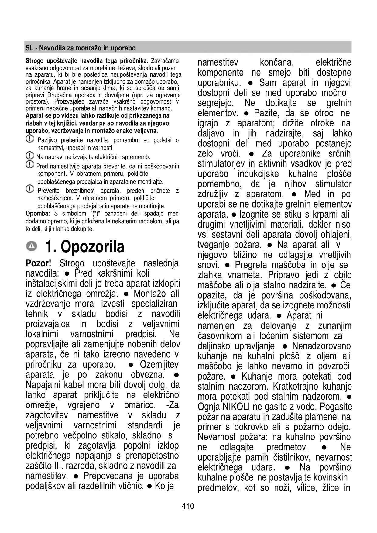 Pozor! Strogo upoštevajte naslednja navodila: ● Pred kakršnimi koli inštalacijskimi deli je treba aparat izklopiti iz električnega omrežja. ● Montažo ali vzdrževanje mora izvesti specializiran tehnik v skladu bodisi z navodili proizvajalca in bodisi z veljavnimi lokalnimi varnostnimi predpisi. Ne popravljajte ali zamenjujte nobenih delov aparata, če ni tako izrecno navedeno v priročniku za uporabo. ● Ozemljitev aparata je po zakonu obvezna. ● Napajalni kabel mora biti dovolj dolg, da lahko aparat priključite na električno omrežje, vgrajeno v omarico. -Za zagotovitev namestitve v skladu z veljavnimi varnostnimi standardi je potrebno večpolno stikalo, skladno s predpisi, ki zagotavlja popolni izklop električnega napajanja s prenapetostno zaščito III. razreda, skladno z navodili za namestitev. ● Prepovedana je uporaba podaljškov ali razdelilnih vtičnic. ● Ko je namestitev končana, električne komponente ne smejo biti dostopne uporabniku. ● Sam aparat in njegovi dostopni deli se med uporabo močno segrejejo. Ne dotikajte se grelnih elementov. ● Pazite, da se otroci ne igrajo z aparatom; držite otroke na daljavo in jih nadzirajte, saj lahko dostopni deli med uporabo postanejo zelo vroči. ● Za uporabnike srčnih stimulatorjev in aktivnih vsadkov je pred uporabo indukcijske kuhalne plošče pomembno, da je njihov stimulator združljiv z aparatom. ● Med in po uporabi se ne dotikajte grelnih elementov aparata. ● Izognite se stiku s krpami ali drugimi vnetljivimi materiali, dokler niso vsi sestavni deli aparata dovolj ohlajeni, tveganje požara. ● Na aparat ali v njegovo bližino ne odlagajte vnetljivih snovi. ● Pregreta maščoba in olje se zlahka vnameta. Pripravo jedi z obilo maščobe ali olja stalno nadzirajte. ● Če opazite, da je površina poškodovana, izključite aparat, da se izognete možnosti električnega udara. ● Aparat ni namenjen za delovanje z zunanjim časovnikom ali ločenim sistemom za daljinsko upravljanje. ● Nenadzorovano kuhanje na kuhalni plošči z oljem ali maščobo je lahko nevarno in povzroči požare. ● Kuhanje mora potekati pod stalnim nadzorom. Kratkotrajno kuhanje mora potekati pod stalnim nadzorom. ● Ognja NIKOLI ne gasite z vodo. Pogasite požar na aparatu in zadušite plamene, na primer s pokrovko ali s požarno odejo. Nevarnost požara: na kuhalno površino ne odlagajte predmetov. ● Ne uporabljajte parnih čistilnikov, nevarnost električnega udara. ● Na površino kuhalne plošče ne postavljajte kovinskih predmetov, kot so noži, vilice, žlice in411 pokrovi, ker bi se lahko pregreli. ● Preden aparat priključite v električno omrežje: preverite podatkovno tablico (nameščeno na dnu aparata) in se prepričajte, da napetost in moč ustrezata napetosti omrežja in da je priključna vtičnica primerna. V primeru dvomov se posvetujte s kvalificiranim električarjem. Pomembno: ● Po uporabi izključite kuhalno ploščo s pomočjo svoje krmilne naprave in ne zanašajte se na detektor posod. ● Izogibajte se razlitju tekočine, zato pri vretju ali segrevanju tekočine, zmanjšajte dovod toplote. ● Grelne elemente ne puščajte vklopljene in s prazno posodo ali brez nje na kuhališču. ● Ko končate s kuhanjem, izklopite odgovarjajoče kuhališče. ● Nikoli ne uporabljajte aluminijaste folije za kuhanje, in nikoli ne postavljajte izdelkov, pakiranih z aluminijem. Aluminij se lahko stali in nepopravljivo poškoduje vaš aparat. ● Nikoli ne segrevajte pločevink ali konzerv s hrano, ne da bi jih pred tem odprli, saj jih lahko raznese! To opozorilo velja tudi za vse druge vrste kuhalnih plošč. ● Uporaba visoke stopnje moči, kakršna je funkcija "Booster", ni primerna za segrevanje nekaterih tekočin, kot je na primer olje za cvrtje. Prevelika toplota je lahko nevarna. V teh primerih je priporočljivo uporabiti nižjo energetsko stopnjo. ● posode morajo biti nameščene neposredno na kuhalno ploščo in morajo biti v središču. V nobenem primeru med lonec in kuhalno ploščo ne vstavljajte drugih predmetov. ● Če je temperatura previsoka, aparat samodejno zniža stopnjo moči kuhališč. ● Pred vsakim postopkom čiščenja ali vzdrževanja aparat izklopite iz električnega omrežja tako, da izvlečete vtič ali odklopite z glavnim stikalom stanovanja. ● Pri vseh postopkih montaže in vzdrževanja nosite delovne rokavice. ● Aparat lahko uporabljajo otroci, starejši od 8 let, in osebe z zmanjšanimi fizičnimi, senzoričnimi ali duševnimi sposobnostmi ali s pomanjkanjem izkušenj ali potrebnega znanja, pod pogojem, da jih nekdo nadzoruje, ali po tem, ko prejmejo navodila bodisi glede varne uporabe aparata bodisi razumevanja nevarnosti, ki jim pretijo. ● Otroke je potrebno nadzorovati in zagotoviti, da se z aparatom ne igrajo. ● Otroci ne smejo čistiti in vzdrževati aparata, če niso pod nadzorom. ● Prostor mora imeti zadostno prezračevanje, kadar aparat uporabljate sočasno z drugimi aparati, ki za zgorevanje uporabljajo plin ali druga goriva. ● Aparat je treba pogosto čistiti, tako notranjost kot tudi zunanjost (VSAJ ENKRAT MESEČNO), v vsakem primeru pa upoštevajte, kar je izrecno navedeno v navodilih za vzdrževanje. ● Neupoštevanje pravil za čiščenje aparata in zamenjavo ter čiščenje filtrov pomeni tveganje za požar. ● Kuhanje s flambiranjem je strogo prepovedano. ● Uporaba prostega plamena je škodljiva za filtre in lahko povzroči požar, zato se je v vsakem primeru temu treba izogniti. ● Cvrtje je potrebno nadzirati, da se prepreči vnetje pregretega olja. ● POZOR: Med delovanjem kuhališča se dostopni deli aparata lahko segrejejo. ● Pozor! Aparata ne priključujte na električno omrežje, dokler namestitev ni popolnoma končana. ● Kar zadeva tehnične in varnostne ukrepe, ki jih je treba sprejeti za odvajanje hlapov, dosledno upoštevajte določbe predpisov pristojnih lokalnih organov. ● Vsesanega zraka se ne sme odvajati v vod, ki se up