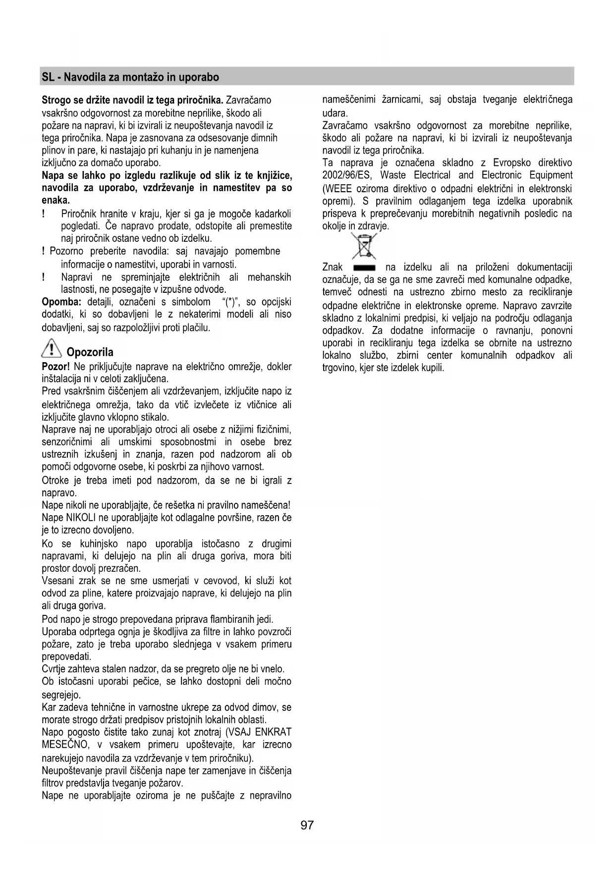 Inštalacija Minimalna razdalja med podporno površino posod na kuhalni površini in spodnjim delom nape za kuhinjske prostore ne sme biti manjša od 60cm pri električnih štedilnikih in 70cm pri plinskih ali mešanih štedilnikih. Če je v navodilih za instalacijo plinskega kuhalnika napisana večja razdalja, jo je treba tudi upoštevati. Električna povezava Omrežna napetost mora ustrezati napetosti, navedeni na nalepki z lastnostmi, nameščeni v notranjosti nape. Če ima napa vtič, slednjega vstavite v vtičnico, ki je skladna z veljavnimi predpisi in se nahaja na takem mestu, ki bo dostopno tudi po vgradnji naprave. Če napa nima vtiča (neposredna povezava na omrežje) ali se vtič nahaja na takem mestu, ki po vgradnji naprave ne bi bilo dostopno, namestite dvopolno stikalo, skladno s predpisi, ki zagotavlja popoln izklop iz omrežja v pogojih prenapetostnega razreda III, skladno s predpisi o inštalaciji. Pozor! pred ponovnim priklopom tokokroga nape na omrežno napajanje in kontrolo pravilnega delovanja, vselej preverite, ali je omrežni kabel pravilno nameščen. Napa ima poseben napajalni kabel. V primeru poškodb kabla lahko novega naročite pri servisni službi. Montaža Napi so priloženi pritrdilni vložki, primerni za večji del sten/stropov. Vseeno pa se je treba obrniti na usposobljenega tehnika, ki vam bo potrdil ustreznost materialov glede na vrsto stene/stropa. Stena/Strop morata biti dovolj trdna, da lahko prenašata težo nape.99 Delovanje V primeru posebno visoke koncentracije dimov v kuhinji uporabite najvišjo hitrost. Priporočamo vam, da prezračevanje vključite 5 minut pred pričetkom kuhanja in ga pustite delovati še približno 15 minut po končanem kuhanju. Za izbiro funkcij nape zadošča dotakniti se ukazov.