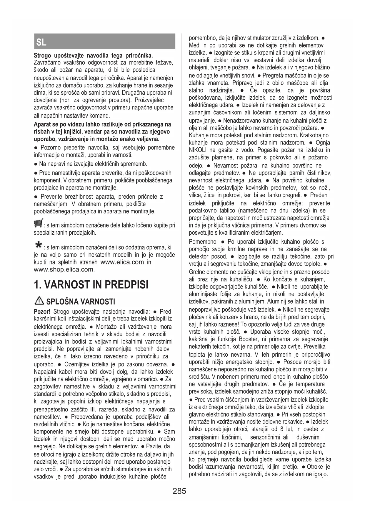 - Taka dna zmanjšujejo kontaktno površino med induktorjem in posodo, zmanjšajo svojo učinkovitost in poslabšajo kuharsko izkušnjo. ●Že obstoječa posoda Ali je material, iz katerega je narejena posoda, magneten, lahko preverite z običajnim magnetom. Če se magnet posode ne prime, ni primerna. Navedbe iz prejšnjega odstavka veljajo tudi v tem primeru. ● Priporočeni premer dna posode POMEMBNO: če ponve niso pravilne velikosti, se kuhalna polja ne bodo vklopila. Če želite videti najmanjši premer lonca, ki ga je treba uporabiti na vsakem posameznem polju, glejte ilustrirani del tega priročnika. ● Varčevanje z energijo Uporabite ponve in lonce s premerom dna, ki je enak premeru kuhališča; Uporabljajte samo lonce in ponve z ravnim dnom; - Če je mogoče, naj med kuhanjem lonci ostanejo pokriti; Kuhajte zelenjavo, krompir itd. z majhno količino vode, da skrajšate čas kuhanja; Uporaba lonca na pritisk dodatno zmanjša porabo energije in čas kuhanja; Lonec postavite na sredino kuhalnega mesta, ki je narisano na kuhalno ploščo. UPORABA ASPIRATORJA Sesalni sistem lahko uporabljate v sesalni različici z zunanjo evakuacijo ali z notranjim filtriranjem in recikliranjem. Na spletnih straneh www.elica.com in www.shop.elica.com si oglejte celotno ponudbo kompletov, da boste lahko izvedli različne namestitve, tako pri filtriranju kot tudi pri sesanju. ● Sesalna različica: Hlapi se izločijo na zunanjo stran skozi celo vrsto cevi (kupite jih ločeno). Izdelek povežite s cevmi in odprtinami za odvajanje skozi steno enakega premera, kot je izstop zraka (priključna prirobnica). Za dodatne informacije o ceveh in njihovih dimenzijah glejte stran z dodatki v priročniku za namestitev - Različica za sesanje. Uporaba cevi in odtočnih lukenj na steni z manjšim premerom bo določila zmanjšanje zmogljivosti sesanja in drastično povečanje hrupa. S tem v zvezi zavračamo vsako odgovornost. Da bi dosegli največjo učinkovitost sesanja: Priporoča se največ 7 m dolgo cev. • Priporočljivo je, da uporabite največ dva 90° ovinka na skupno 7 m • Izogibajte se drastičnim spremembam v prerezu cevi, vedno raje izbirajte v prerezu Ø 150 mm (ali pravokotno 222 x 89 mm) . ● Različica s filtriranjem: Vsesani zrak se filtrira v posebnih filtrih za maščobe in filtrih za vonjave ter se nato znova vrne v prostor. Izdelek je opremljen z vsem potrebnim za standardno namestitev in izhodom za zrak na sprednji strani podnožja omarice. Izdelek je opremljen s kompletom filtrov za vonjave. Za podrobnejše informacije glejte stran z opisi pribora različice s filtriranjem (v ilustriranem delu tega priročnika). 2883. OPIS DELOVANJA