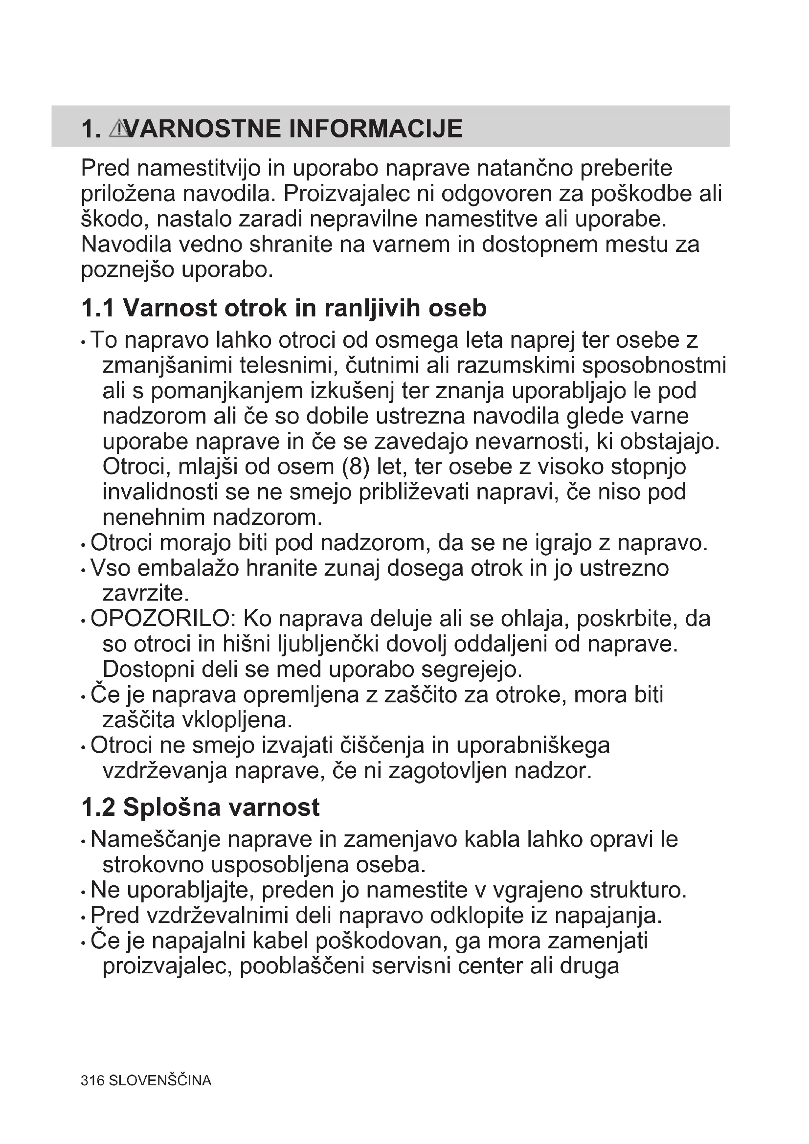 - To napravo lahko otroci od osmega leta naprej ter osebe z zmanjšanimi telesnimi, čutnimi ali razumskimi sposobnostmi ali s pomanjkanjem izkušenj ter znanja uporabljajo le pod nadzorom ali če so dobile ustrezna navodila glede varne uporabe naprave in če se zavedajo nevarnosti, ki obstajajo. Otroci, mlajši od osem (8) let, ter osebe z visoko stopnjo invalidnosti se ne smejo približevati napravi, če niso pod nenehnim nadzorom.
