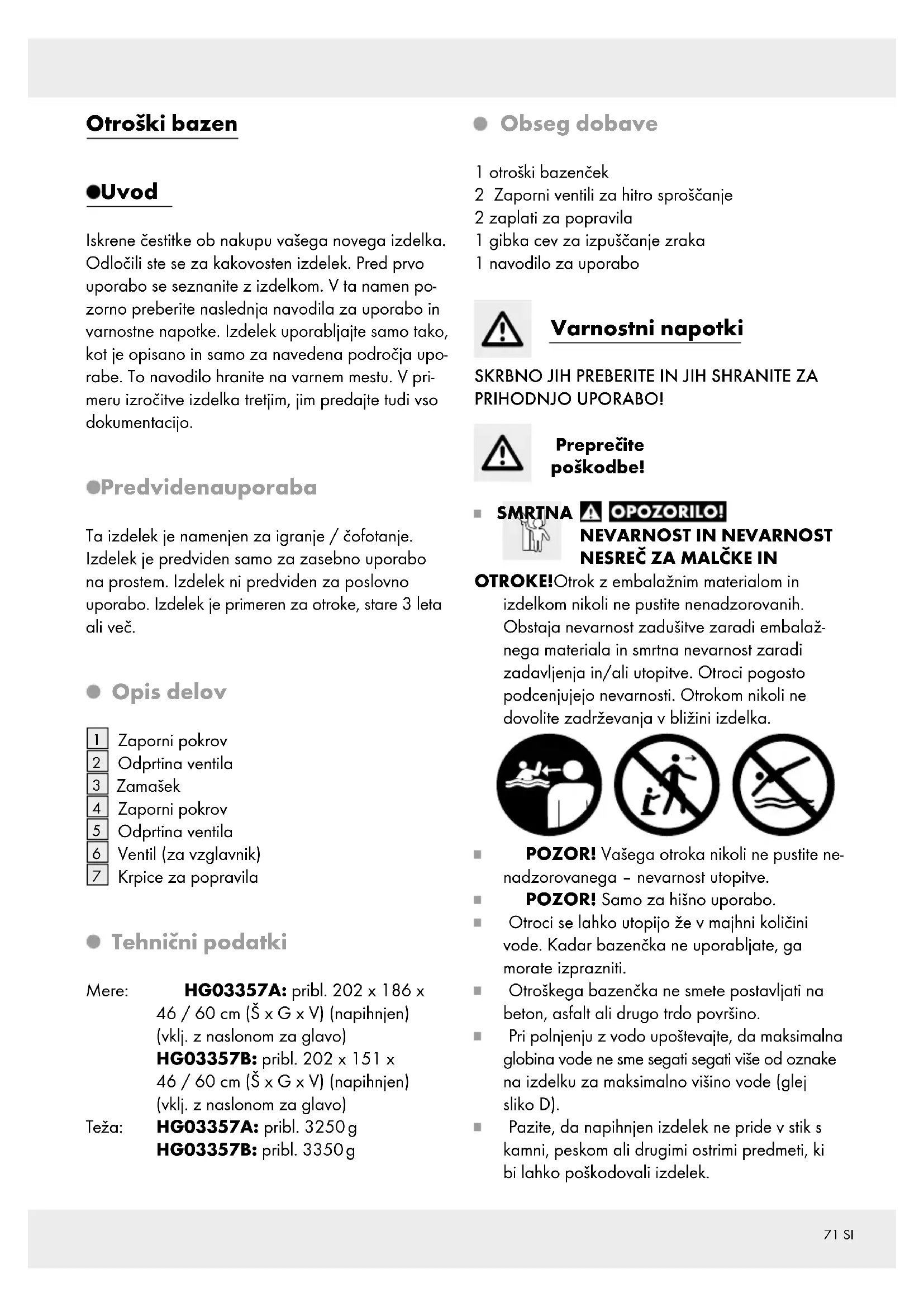 POZOR! Vašega otroka nikoli ne pustite ne- nadzorovanega – nevarnost utopitve. POZOR! Samo za hišno uporabo. Otroci se lahko utopijo že v majhni količini vode. Kadar bazenčka ne uporabljate, ga morate izprazniti. Otroškega bazenčka ne smete postavljati na beton, asfalt ali drugo trdo površino. Pri polnjenju z vodo upoštevajte, da maksimalna globina vode ne sme segati segati više od oznake na izdelku za maksimalno višino vode (glej sliko D). Pazite, da napihnjen izdelek ne pride v stik s kamni, peskom ali drugimi ostrimi predmeti, ki bi lahko poškodovali izdelek.72 SI Varnost neplavalcev Usposobljena odrasla oseba mora neprekinjeno, aktivno in pozorno izvajati nadzor slabih pla- valcev in neplavalcev (pomislite, da pri otrocih, mlajših od pet let, obstaja največja nevarnost utopitve). Določite primerno odraslo osebo, ki bo med uporabo nadzorovala bazen. Slabi plavalci ali neplavalci morajo pri uporabi mini bazena nositi rešilne jopiče ali plavalne pripomočke. Kadar mini bazena ne uporabljate, odstranite vse igrače in vse privlačne predmete iz vode ter s pokrova, da ne bodo privlačili otrok. Če mini bazena ne uporabljate, iz njegove okolice odstranite vse igrače ali druge predmete, ki bi jih lahko otroci uporabili kot pomoč za ple- zanje v mini bazen (npr. stole, velike igrače itn.). Zaščitne naprave Priporočamo, da pripravite zaporo (in po potrebi zavarujete vsa vrata in okna), da pre- prečite nedovoljeni dostop do mini bazena. Osebna zaščitna oprema, zapore, pokrivala bazena, alarmi za bazen ali podobne zaščitne naprave so koristni pripomočki, vendar ne zamenjujejo neprekinjenega in strokovnega nadzora s strani odrasle osebe. Varnostna oprema V bližini mini bazena imejte seznam telefonskih številk za nujne primere in delujoči telefon. Varna uporaba mini bazena Spodbujajte vse uporabnike, zlasti otroke, da se naučijo plavati. Naučite se temeljnih ukrepov za oživljanje (oživljanje z masažo srca, umetnim dihanjem) in redno obnavljajte ta znanja. To je lahko v nujnem primeru razlika, ki reši življenje. Vse uporabnike mini bazena, tudi otroke, pou- čite o tem, kaj morajo storiti v nujnem primeru. Nikoli ne skačite v plitko vodo. Posledica so lahko hude ali smrtne telesne poškodbe. Mini bazena ne uporabljajte pod vplivom alko- hola ali zdravil, kar bi lahko vplivalo na vašo sposobnost za varno uporabo mini bazena. Če uporabljate pokrivalo bazena, ga povsem odstranite s površine bazena, preden stopite v bazen. Redno zamenjujte vodo skladno s priporočili proizvajalca in glede na higienične pogoje, čistost, bistrost in vonj vode ali če se v mini ba- zenu nabere umazanija ali nastanejo madeži. Uporaba kemikalij v mini bazenih brez krože- nja vode lahko privede do neposrednega stika s kemikalijami, v območjih z visoko koncentra- cijo kemikalij pa lahko pride do telesnih poškodb uporabnikov. Če kemikalije uporabljate občasno, da ni treba tako pogosto menjavati vode, strogo upoštevajte navodila proizvajalca (predvsem ne uporabljajte več, kot je priporočeno) in poskrbite za pravilno razmerje kemikalij, da boste preprečili morebitne telesne poškodbe oseb. Kemikalije shranite zu- naj dosega otrok. Uporaba in nameščanje električnih naprav v okolico mini bazena se mora izvesti skladno z nacionalnimi predpisi. Po potrebi odstranite vse pripomočke za dostop do mini bazena in jih vedno shranite zunaj do- sega otrok, kadar mini bazen ni v uporabi. Uporaba dodatne opreme, ki je proizvajalec mini bazena ni odobril (npr. lestev, pokrival, črpalk itn.), lahko povzroči telesne poškodbe oseb ali materialno škodo. Uporaba Opozorilo: Pred prvo uporabo izdelek temeljito preverite, ali ima kakšne luknje, porozna mesta in netesne šive. Priporočilo: Postavitev naj vedno izvede odrasla oseba. Upoštevajte posamezne korake za postav- ljanje v navedenem vrstnem redu.73 SI Priporočilo: Izberite primerno ravno in čisto po- vršino z dovolj prostora, da boste lahko izdelek razpakirali in raztegnili. Izdelek razprostrite tam, kjer bo pozneje postavljen. Priporočilo: Izdelek napihnite in ga pustite en dan ležati. Nove izdelke nekaj dni zračite na svežem zraku. Priporočilo: Igračo postavite na ravni površini in najmanj 2 m od drugih zgradb ali ovir, npr. ograj, garaže, hiše, vej, vrvi za perilo ali električnih napeljav. Napihovanje izdelka POZOR! Napihljivi plastični izdelki občutljivo rea- girajo na mraz in vročino. Zato izdelka ne upo- rabljajte, če se temperatura okolice spusti pod 15 °C oz. naraste nad 40 °C. Sicer se izdelek lahko poškoduje. Opozorilo: Napihovanje naj praviloma izvajajo odrasli. Pazite na to, da v izdelek ne napihnete preveč zraka. V nobenem primeru ne uporabljajte kompresorja. Postopek zaustavite, če med napihovanjem upor narašča in se šivi napnejo. V nasprotnem primeru se material lahko raztrga. Uporabljajte samo ročne zračne tlačilke in / ali zračne tlačilke, ki so predvi- dene posebej za napihljive plastične izdelke. Izdelek najprej razprostrite in prekontrolirajte, ali ima kakšne luknje, razpoke ali druge poškodbe (glejte sl. A). Napotek: Za polnjenje izdelka potrebujete za zračni ventil