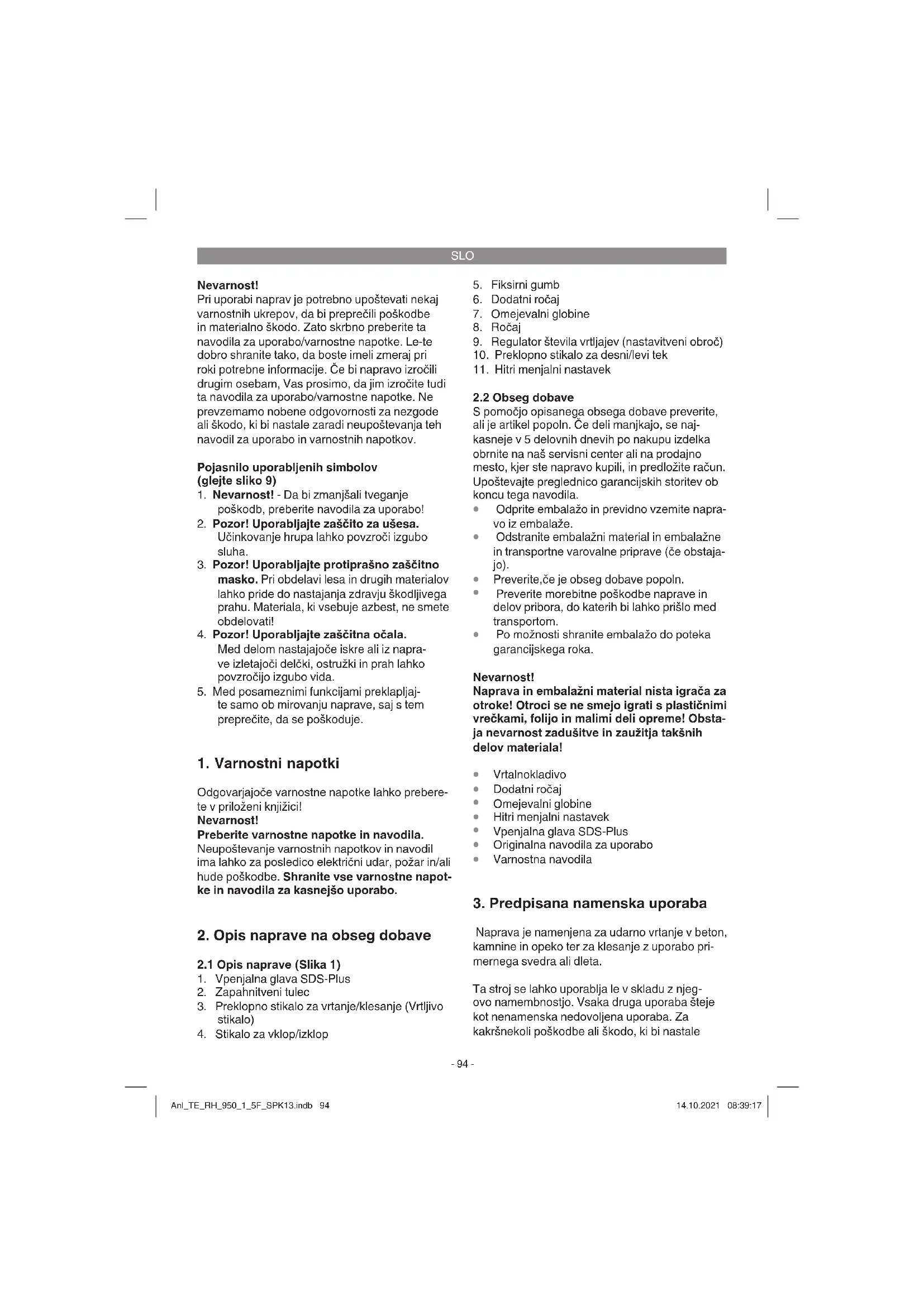 V skladu s clenom 3 smernice 2000/14/ EC_2005/88/EC, vrtalno kladivo ni namenjeno za uporabo na prostem.