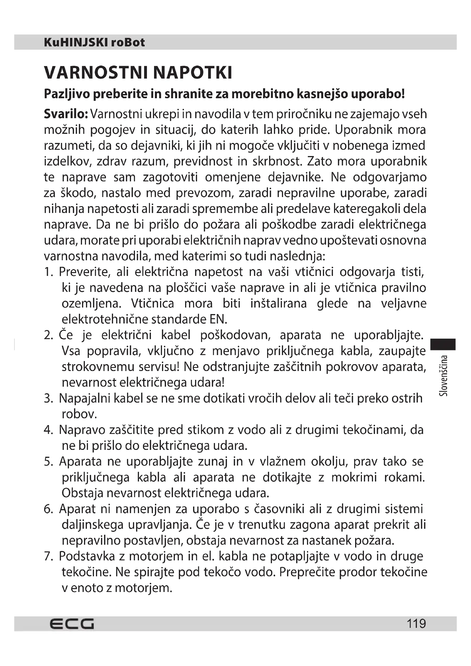 Odstranjevanje starih električnih in elektronskih naprav (velja v državah članicah EU in drugih evropskih državah, kjer velja zakon o ločevanju odpadkov) Prikazani simbol na izdelku ali embalaži pomeni, da naj se z izdelkom ne ravna kot z gospodinjskimi odpadki. Izdelek izročite v zbirno mesto, namenjeno za reciklažo električnih in elektronskih naprav. S pravilno odstranitvijo izdelka preprečite negativne vplive na človeško zdravje in okolje. Reciklaža materialov pripomore k zaščiti naravnih virov. Več informacij glede reciklaže tega izdelka dobite na lokalnem uradu, podjetju, ki se ukvarja s predelavo odpadkov ali pa v prodajalni, kjer ste kupili izdelek. Ta izdelek izpolnjuje zahteve direktiv EU o elektromagnetni združljivosti in električni varnosti ter problematiki težkih kovin v električnih in elektronskih napravah. Nadalje izpolnjuje ustrezne energetske zahteve in zahteve za neposredni stik z živili. Navodila za uporabo so na razpolago na spletnih straneh www.ecg-electro.eu. Pridružujemo si pravico do spremembe besedila in tehničnih parametrov. 08/05Srpski Crnogorski Srpski Crnogorski