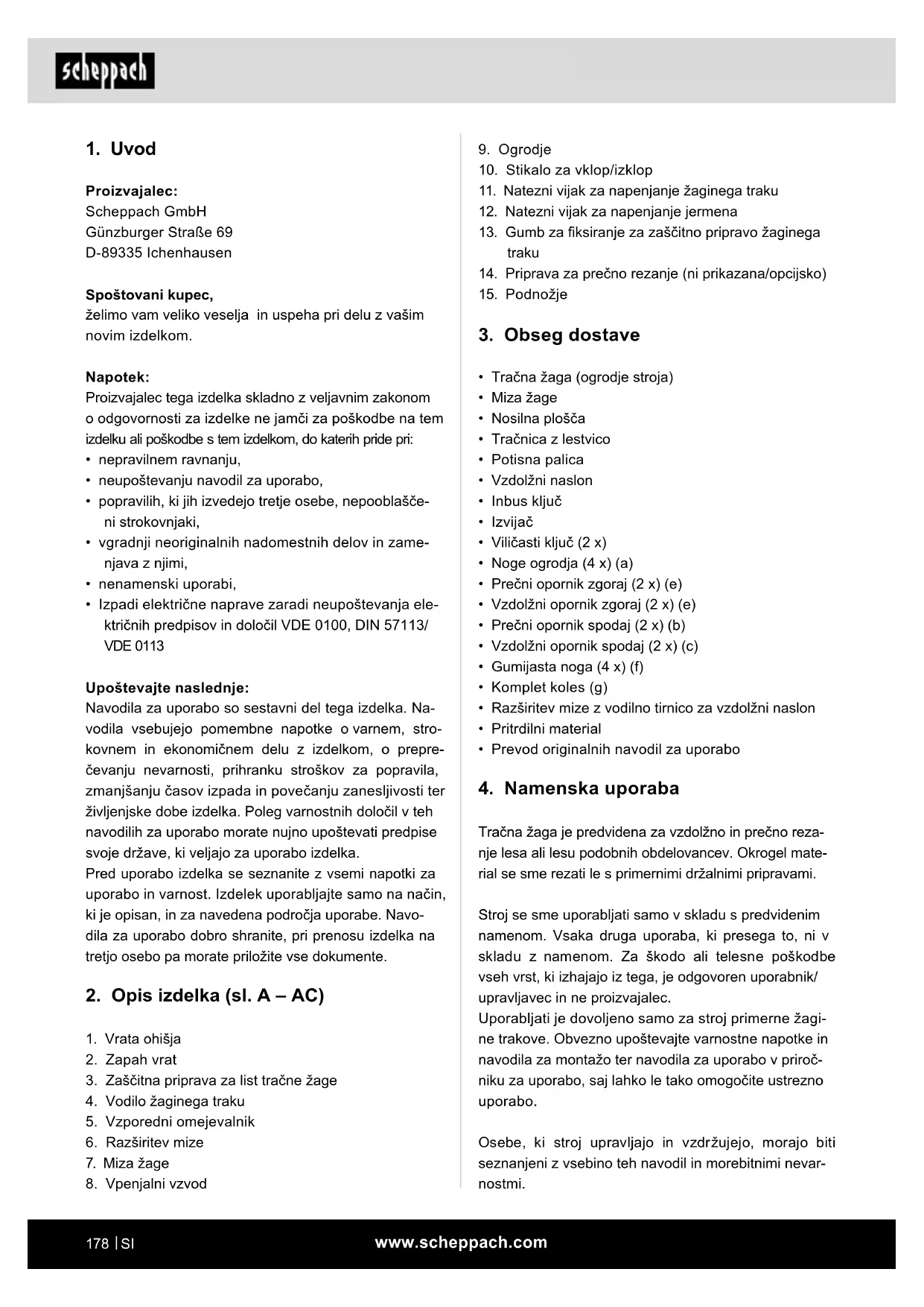 Tračna žaga je predvidena za vzdolžno in prečno reza- nje lesa ali lesu podobnih obdelovancev. Okrogel mate- rial se sme rezati le s primernimi držalnimi pripravami. Stroj se sme uporabljati samo v skladu s predvidenim namenom. Vsaka druga uporaba, ki presega to, ni v skladu z namenom. Za škodo ali telesne poškodbe vseh vrst, ki izhajajo iz tega, je odgovoren uporabnik/ upravljavec in ne proizvajalec. Uporabljati je dovoljeno samo za stroj primerne žagi- ne trakove. Obvezno upoštevajte varnostne napotke in navodila za montažo ter navodila za uporabo v priroč- niku za uporabo, saj lahko le tako omogočite ustrezno uporabo. Osebe, ki stroj upravljajo in vzdržujejo, morajo biti seznanjeni z vsebino teh navodil in morebitnimi nevar- nostmi.
