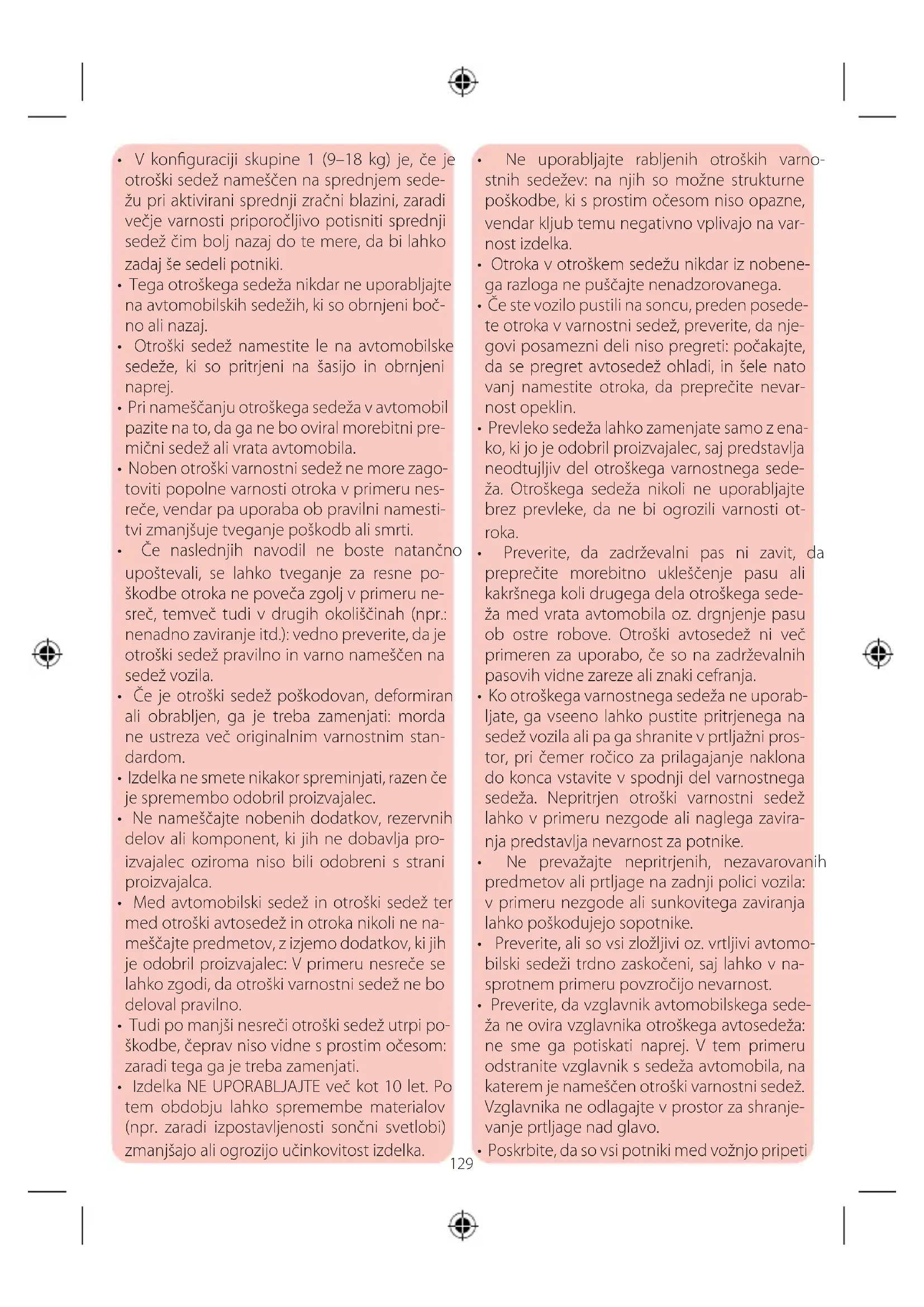 OPOZORILO! Naslednjih omejitev in zahtev glede uporabe izdelka in sedeža vozila se mo- rate strogo držati: v nasprotnem primeru var- nost ne bo zagotovljena.